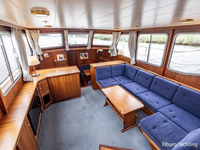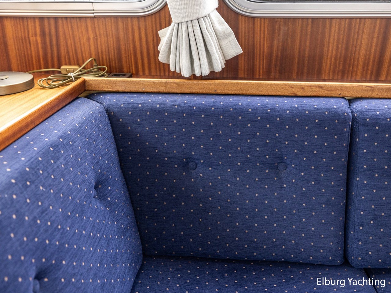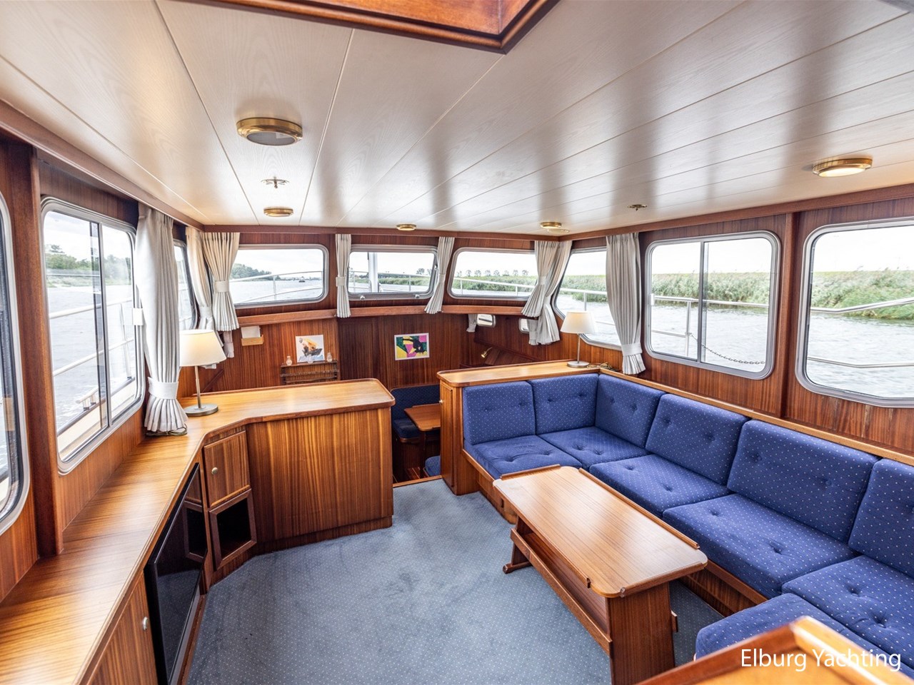 - Scheeps zijdeglas mahonyhouten interieur met blauwe kussens en een bijpassende vloer