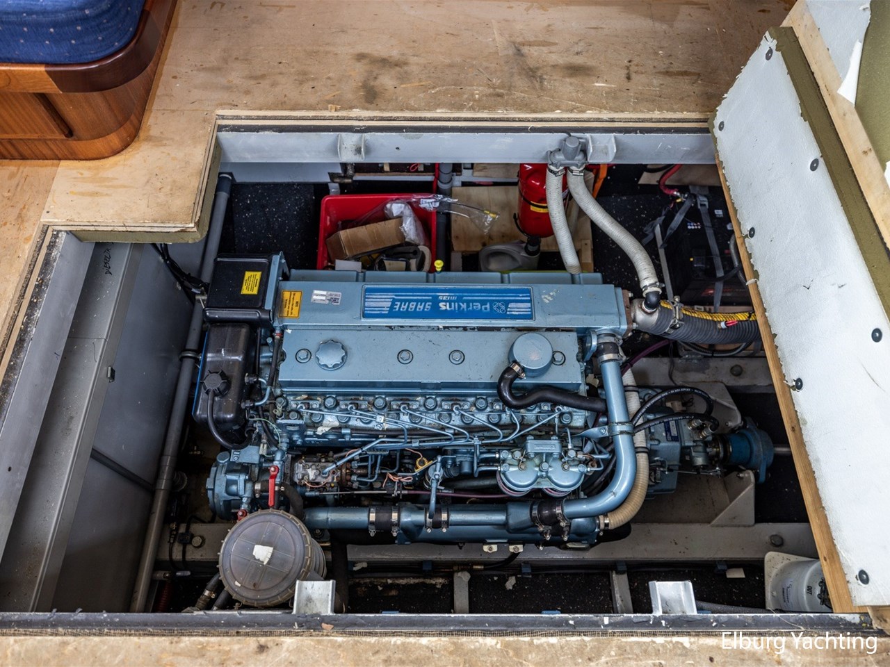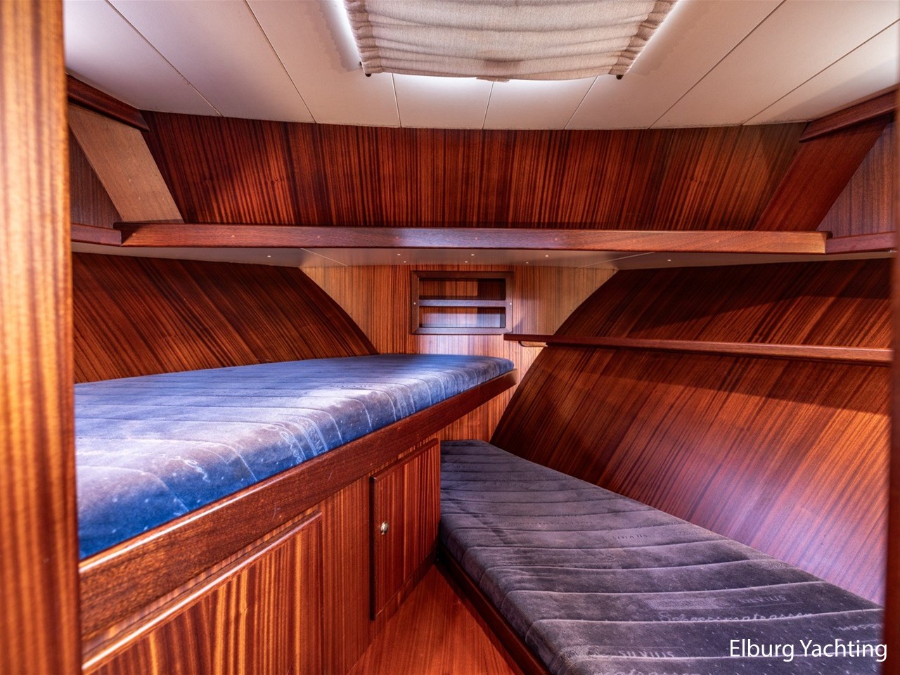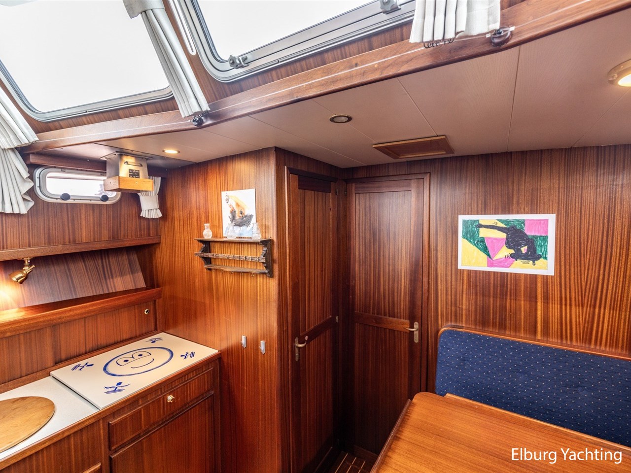 - Scheeps zijdeglas mahonyhouten interieur met blauwe kussens en een bijpassende vloer