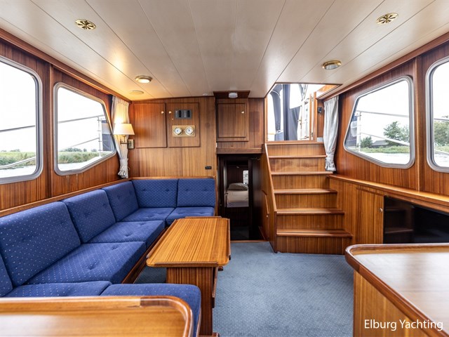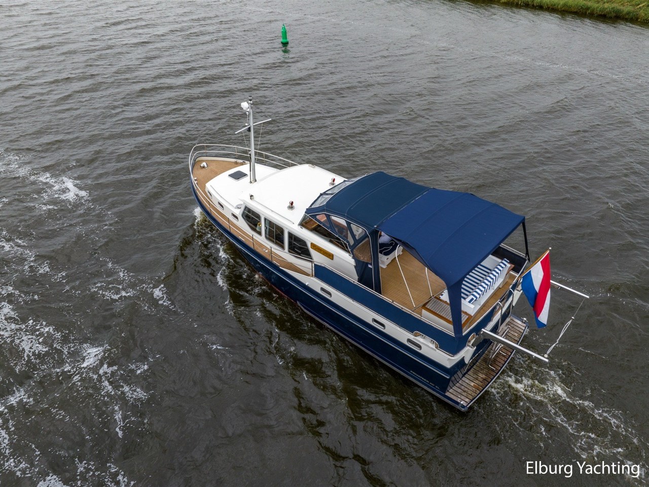 Strakke, goed verzorgde en degelijk gebouwde Privateer 40 XL gebouwd te Privateer Yachts in Uitwellingerga. Rondom is de Privateer 40 XL voorzien van een degelijk dek gemaakt van kurk. Rondom is er niet bezuinigd op de Privateer. Zo valt onder andere de dubbel uitgevoerde r.v.s. zeerailing op alsook de r.v.s. potdeksels. De gangboorden zijn zeer royaal waardoor u zich gemakkelijk verplaatst aan boord. De Privateer 40 XL beschikt over een zeer ruime open kuip, waar zich ook de vaste stuurstand bevindt. De open kuip verbindt zich met de salon via een riante trap. De salon bestaat uit prachtig mahony houten interieur met nette blauwe kussens, te openen ramen aan bak- en stuurboord en een het middelste raam aan de voorzijde kan ook opengeklapt worden. De eigenaarshut is erg royaal uitgevoerd en beschikt over een riant Frans bed, veel opbergruimte, airconditioning en meerdere te openen ramen met muggenhorren. De Privateer 40 XL beschikt over een ruime natte cel met eigen douchecabine en twee aparte elektrische toiletten, luxe 2 persoons vaarstoel bij stuurstand, veel opbergmogelijkheden aan dek in de verschillende bakskisten, volledig afluitbare tent rondom gehele achterdek, klapbare ramen voor lage kruiphoogte, dekwaspomp, 2 x raam in spiegel, Candy wasmachine 120ES.