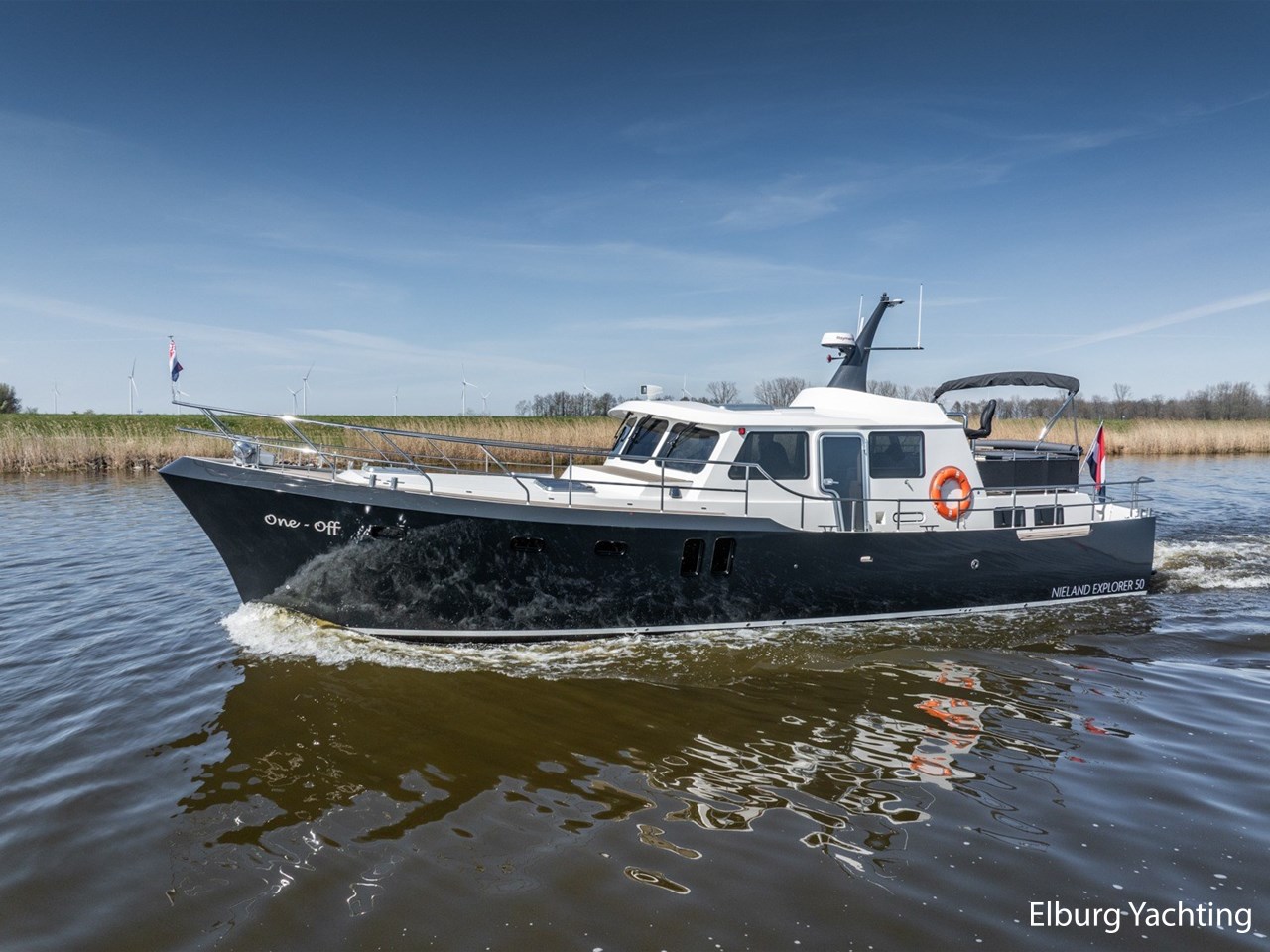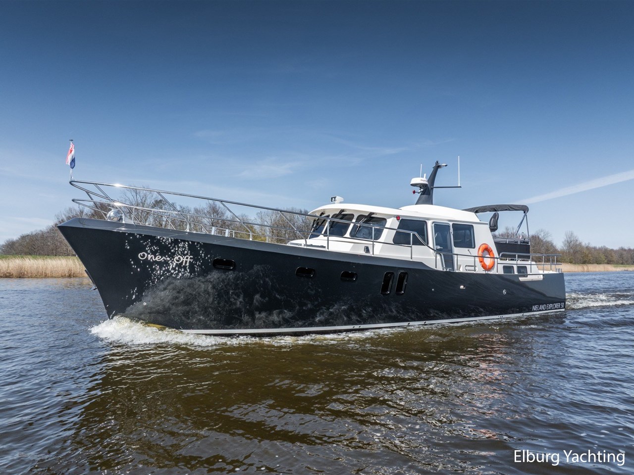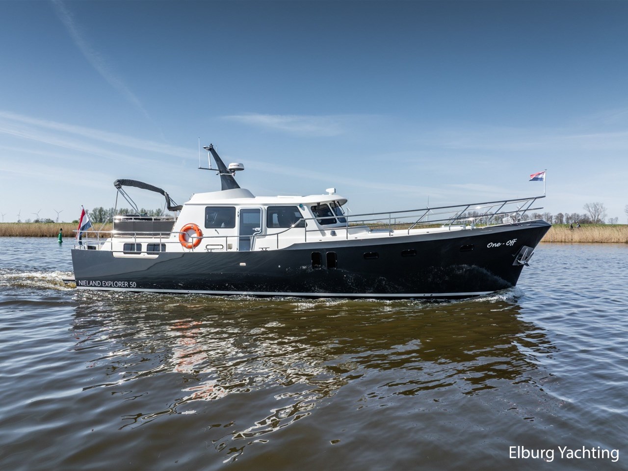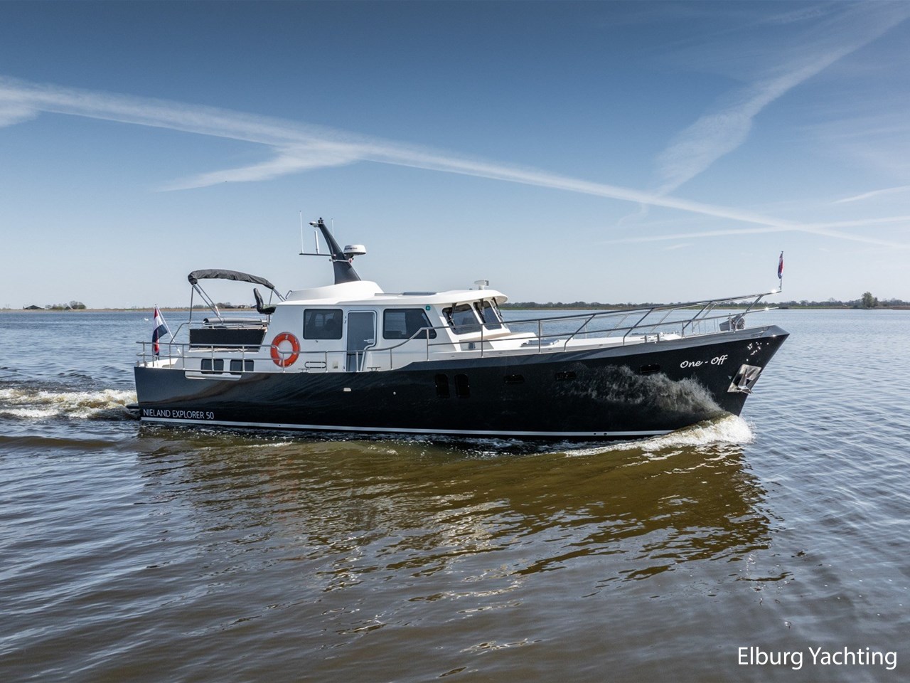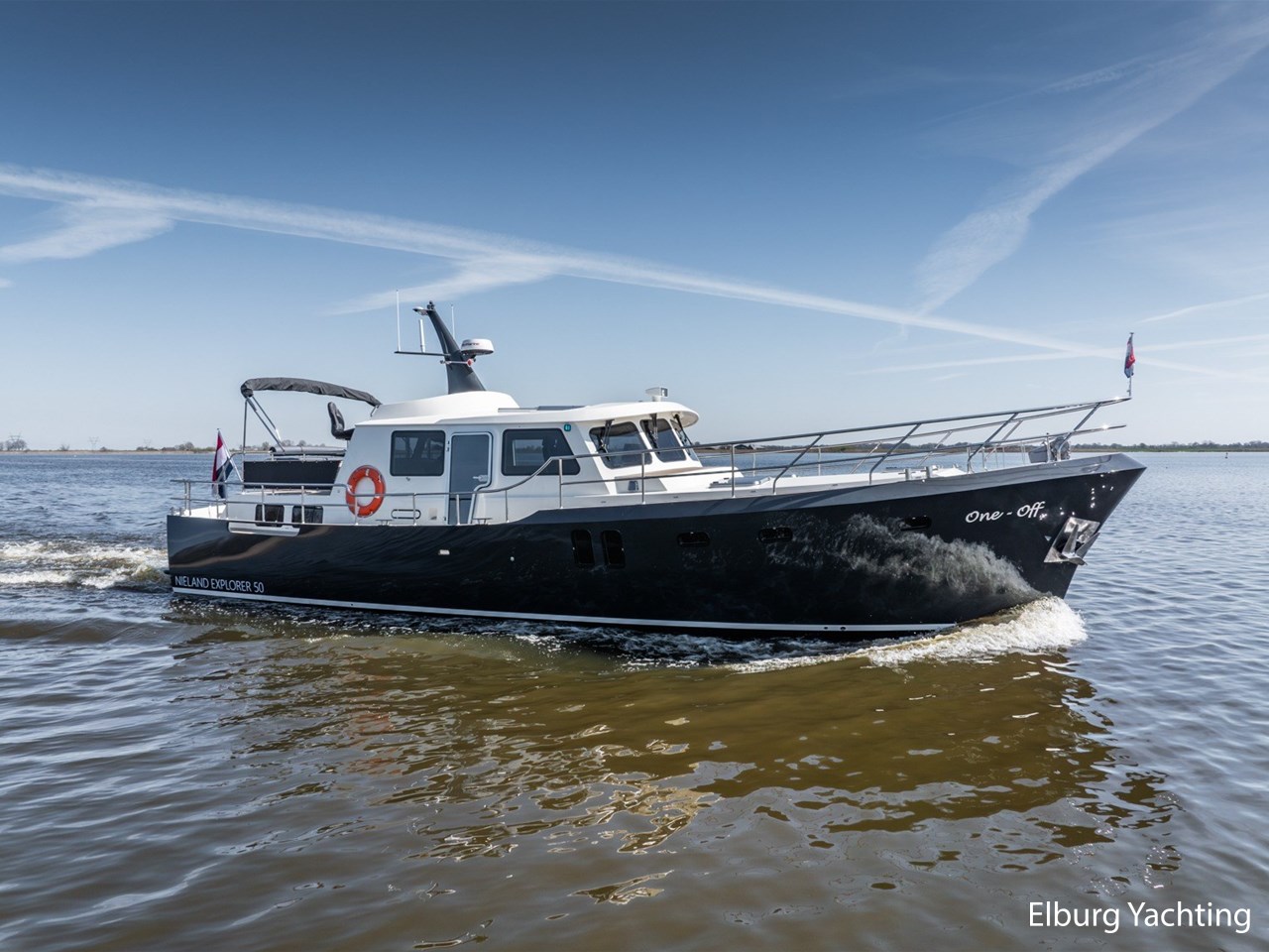 Waanzinnig gebouwde Nieland Explorer 50 door DSA Yachts - Ossenzijl (gebouwd in 2020/2021 en opgeleverd in 2022). Deze fraaie verschijning op het water kenmerkt haar naam "One Off" met verve. Geheel het jacht is doordacht en er is nergens op bezuinigd tijdens het bouwproces. Denk hierbij aan de ruimtelijke indeling van dit jacht in combinatie met de geringe diepgang (ca. 0.98 meter) en de fraaie uitstraling. Rondom is het jacht voorzien van een prachtig en onderhoudsarm Flexiteak dek met een prachtige rvs zeerailing, rvs bolders, dubbelarmige ruitenwissers, een elektrisch neerlaatbare mast, 2 te openen deuren in de spiegel richting het zwemplateau, inklapbare zwemtrap, bimini bij de buitenstuurstand en een ruimtelijk dek met brede gangboorden en voldoende zitgelegenheid. Het vaste stuurhuis is royaal opgezet met rondom goed zicht, genoeg zitgelegenheid, twee zijdeuren naar de gangboorden, Webasto elektrisch schuifdak met muggenhor en een fraaie stuurstand met uitgebreid navigatieapparatuur en een Recaro stuurstoel. Vanuit het vaste stuurhuis is de gezellige salon eenvoudig te benaderen. In de salon bevindt zich een comfortabele zithoek, deur naar het achterdek en de moderne kombuis met hoogwaardig Siemens apparatuur (inductiekookplaat met geïntegreerde afzuiging + vaatwasser + oven/magnetron), Bodega wijnkoeler, de kombuis beschikt over een prachtig granieten aanrechtblad. Vanuit het stuurhuis zijn de twee hutten te benaderen. De master bedroom is aan de voorzijde van het jacht gesitueerd en beschikt over een prachtig vrijstaand tweepersoons bed met veel kastruimte en een royale natte cel met elektrisch toilet, douchecabine, wastafel met granieten blad en kastruimte. De gastenhut beschikt over een tweepersoons vast bed, kastruimte en een tweede natte cel met elektrisch toilet, douchecabine en wastafel met granieten blad. In de gang is een wasruimte gesitueerd met Siemens wasmachine/droger. Door het gehele jacht valt het chique Amerikaans Notenhout interieur op in combinatie met de indirecte LED verlichting. Dit jacht is robuust gebouwd, gezellig vormgegeven en beschikt over een geringe doorvaarthoogte met gestreken mast (ca. 3.60 meter) - een geringere doorvaarthoogte is in overleg te realiseren. Het jacht is eventueel vaarbewijsvrij te varen. Voor vragen en/of het maken van een afspraak bent u 7 dagen per week van harte welkom bij Elburg Yachting