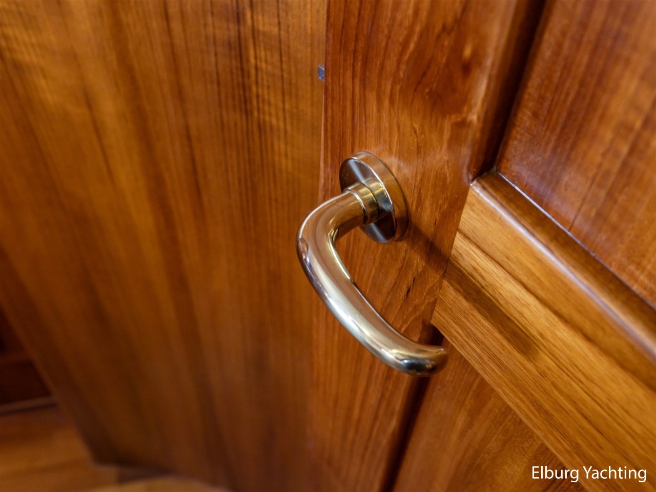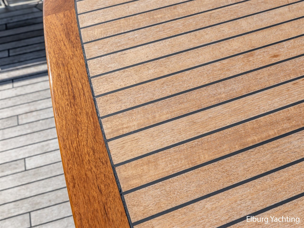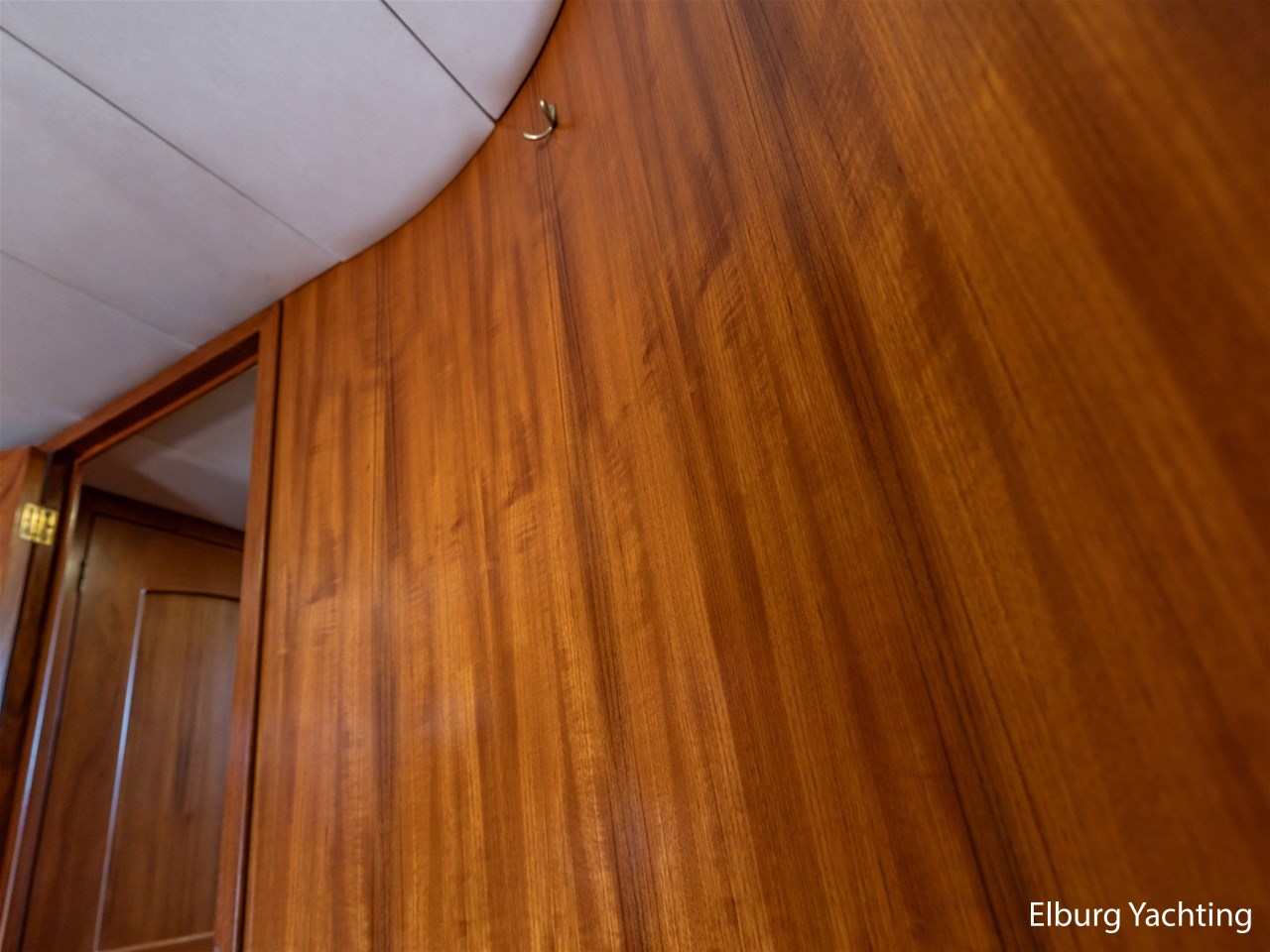 Zeer hoogwaardig teakhouten interieur + Merbau treden + veel rondingen in de houtafwerking