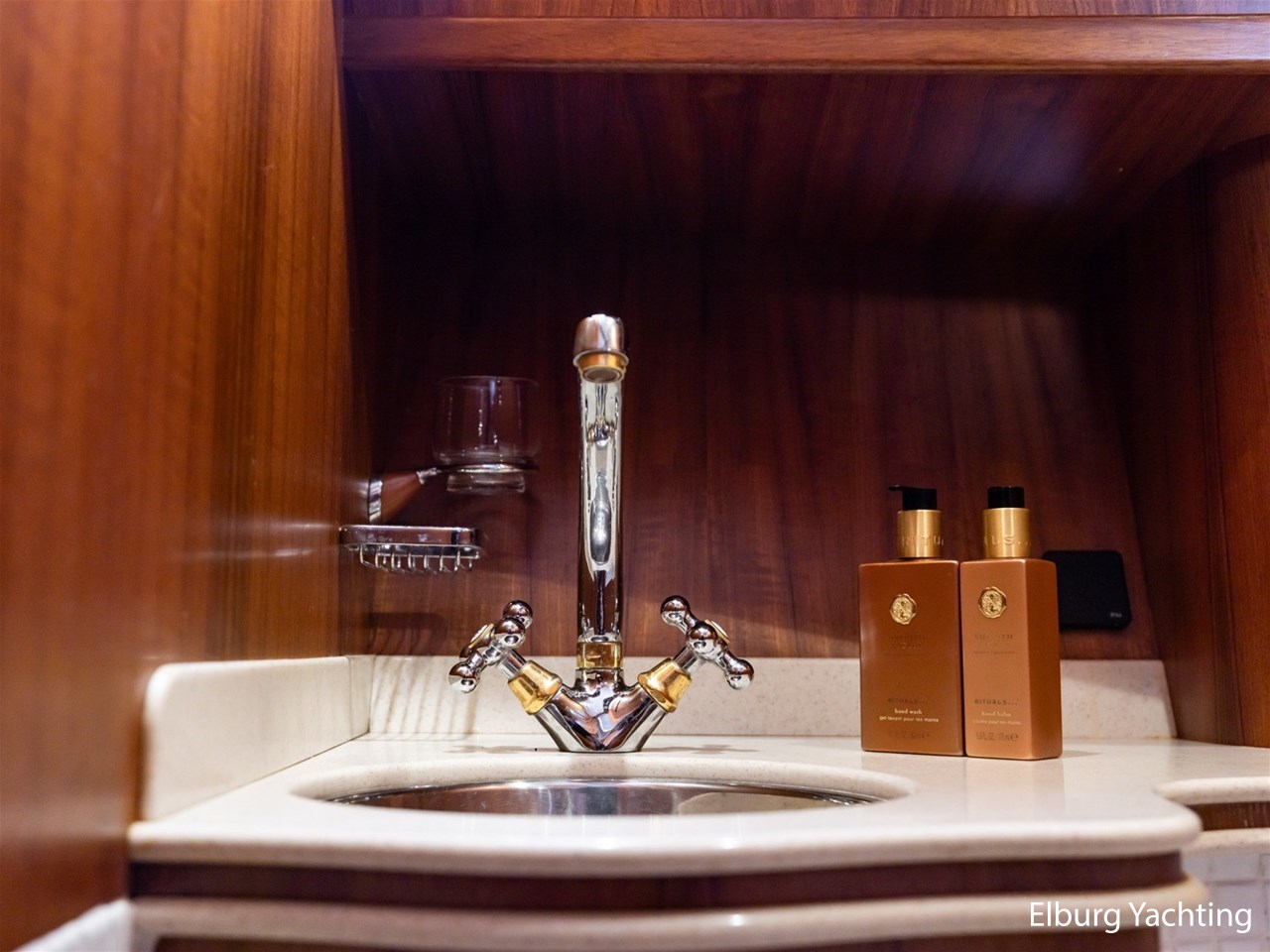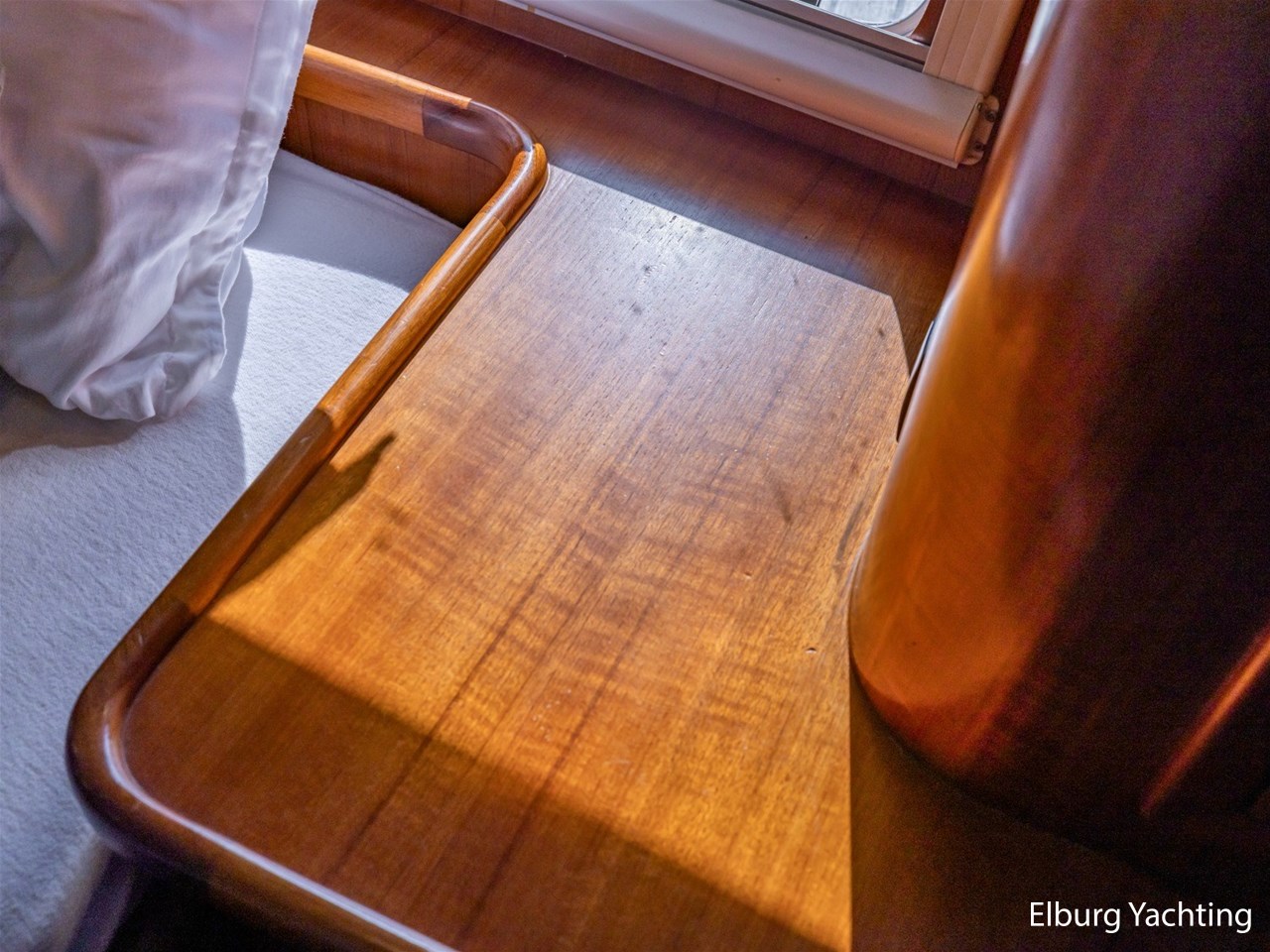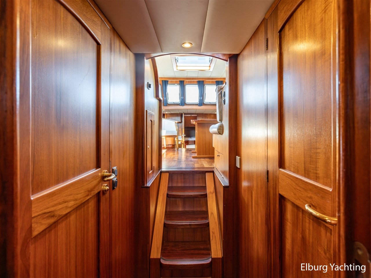 Zeer hoogwaardig teakhouten interieur + Merbau treden + veel rondingen in de houtafwerking
