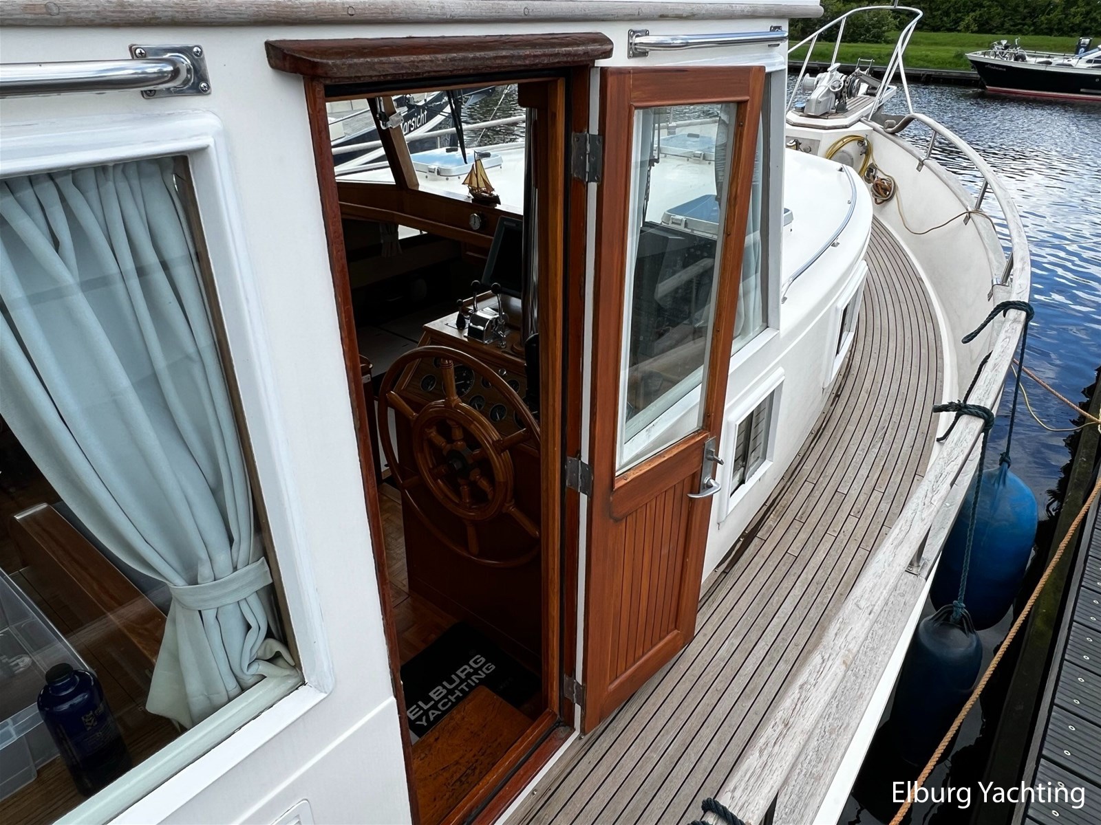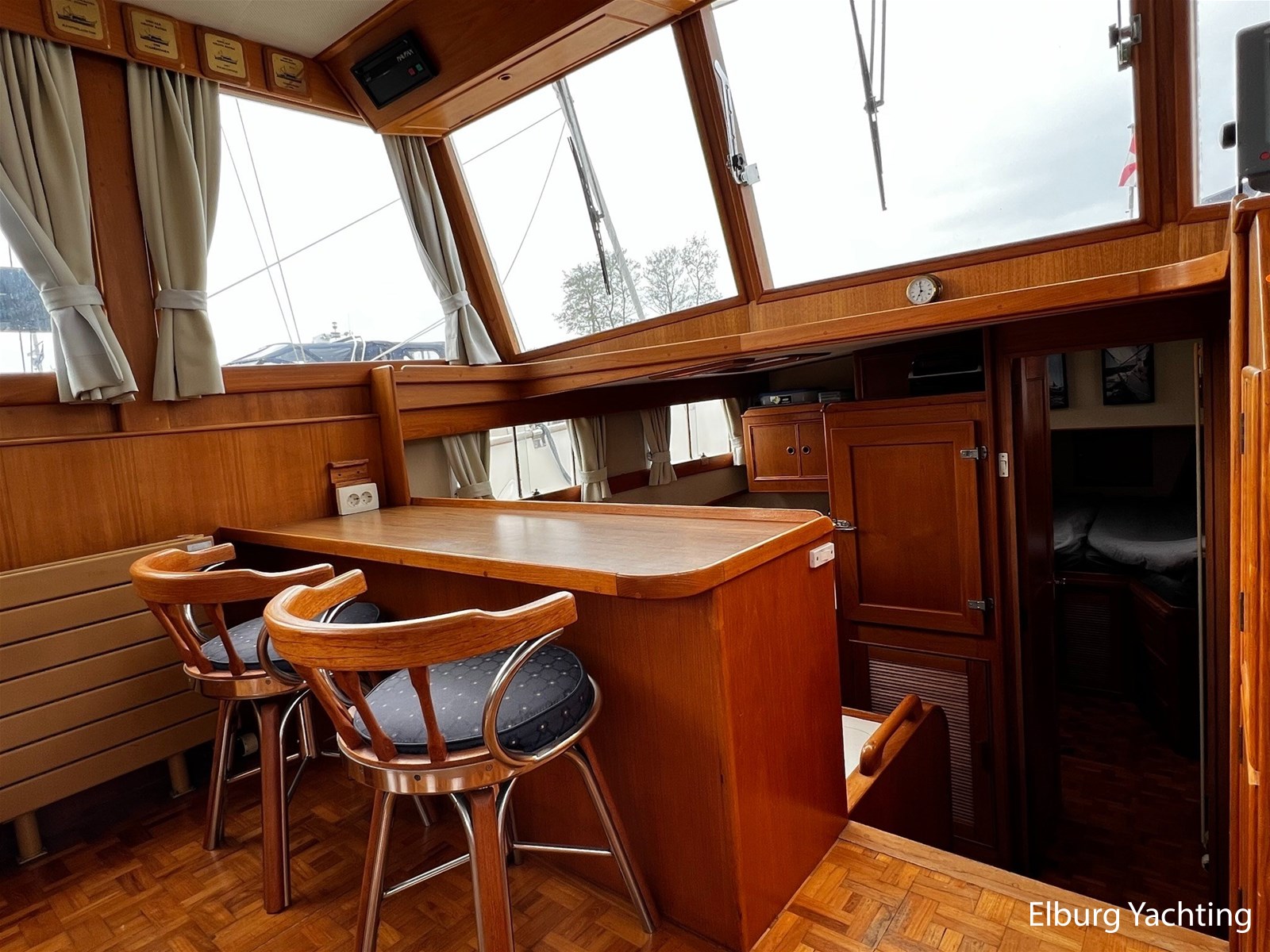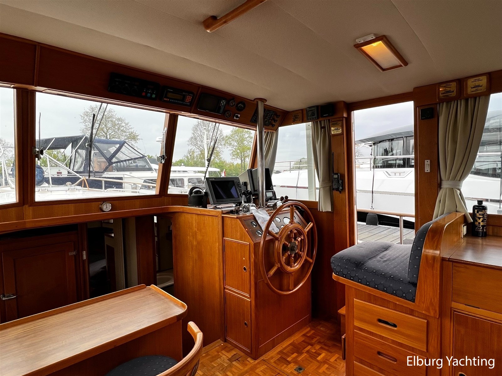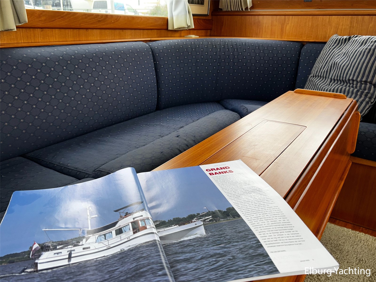Teak scheepsinterieur + blauwe stoffen binnen bekleding