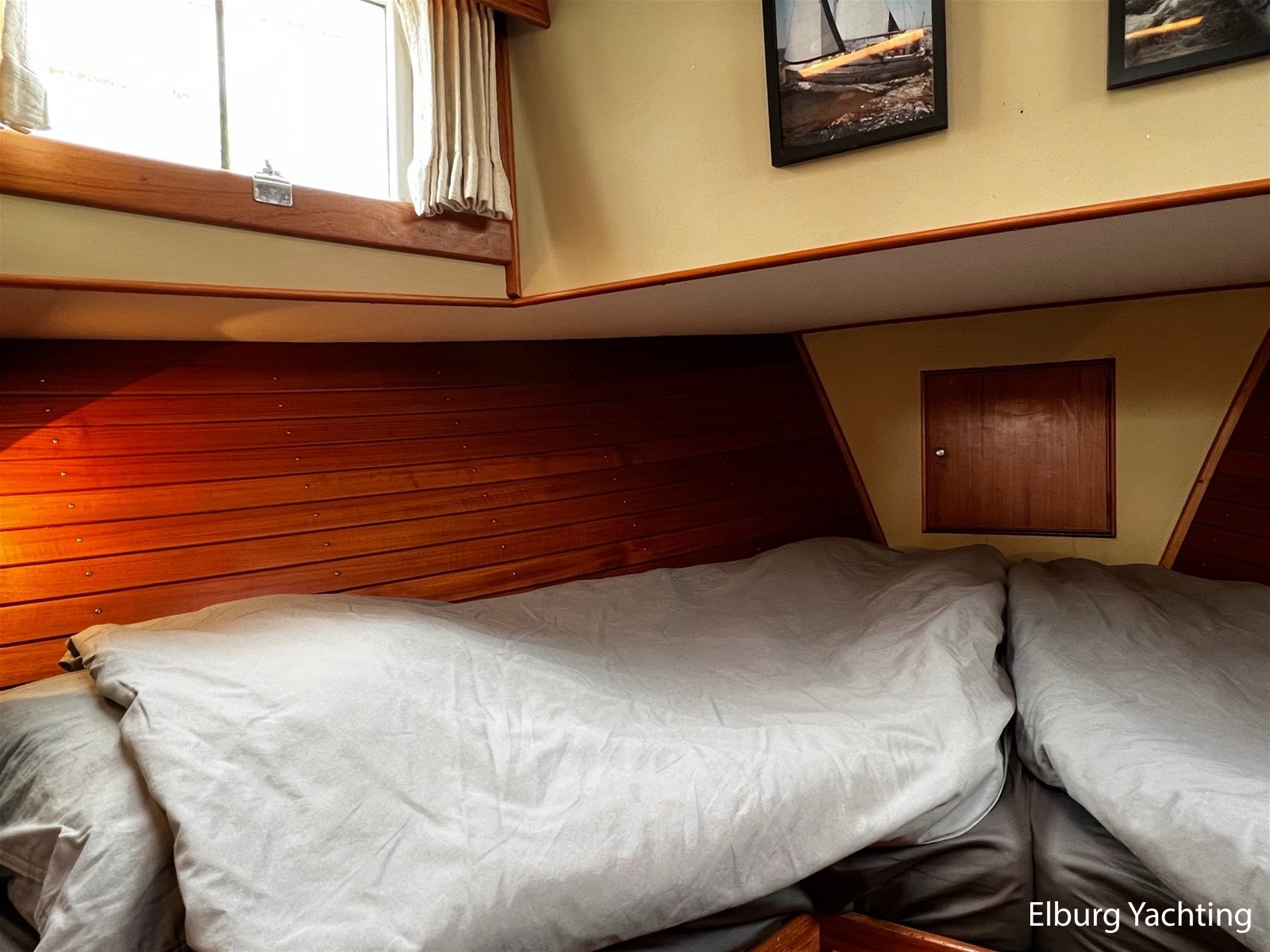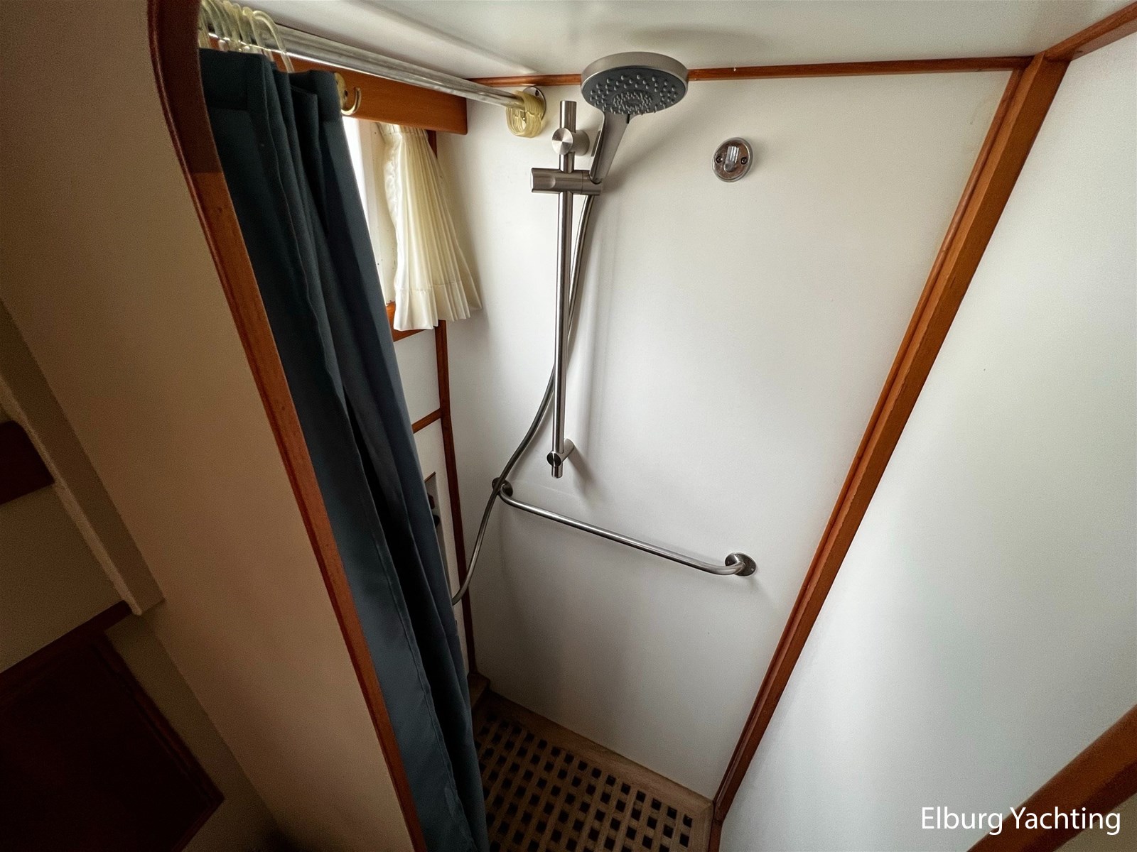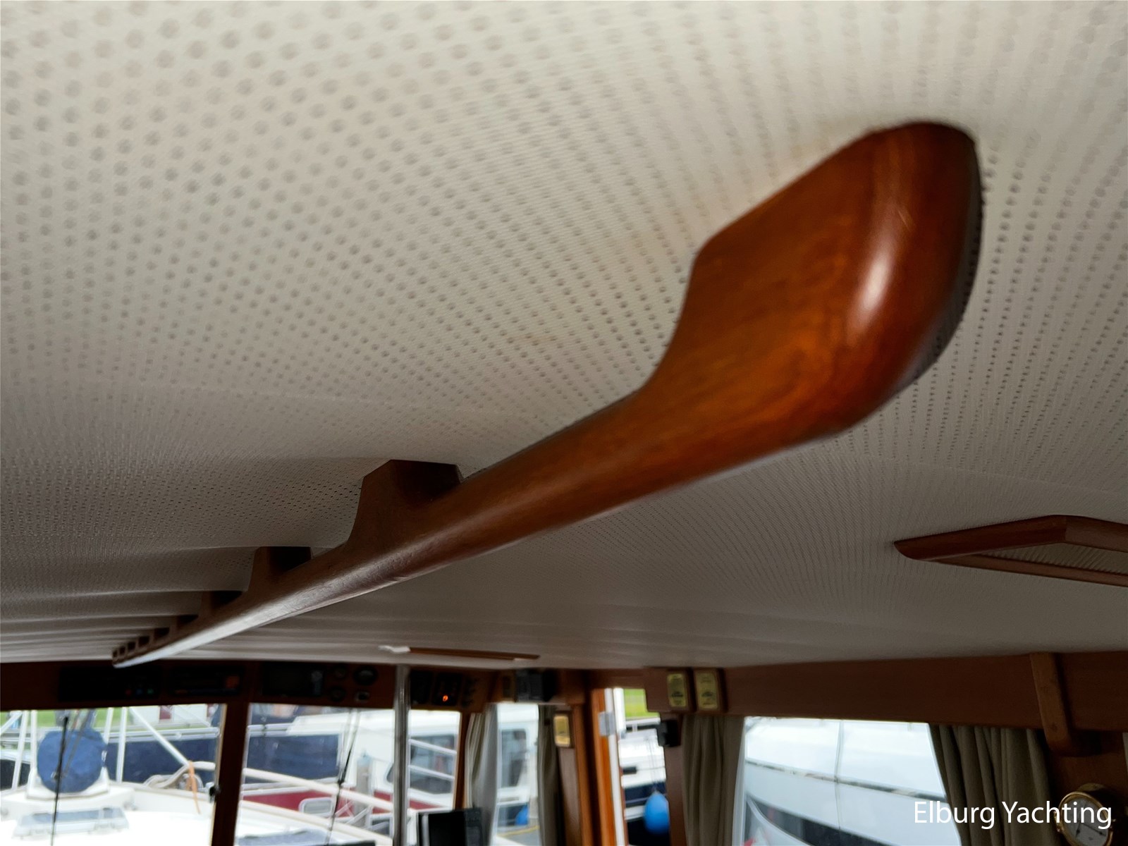 Teak scheepsinterieur + blauwe stoffen binnen bekleding