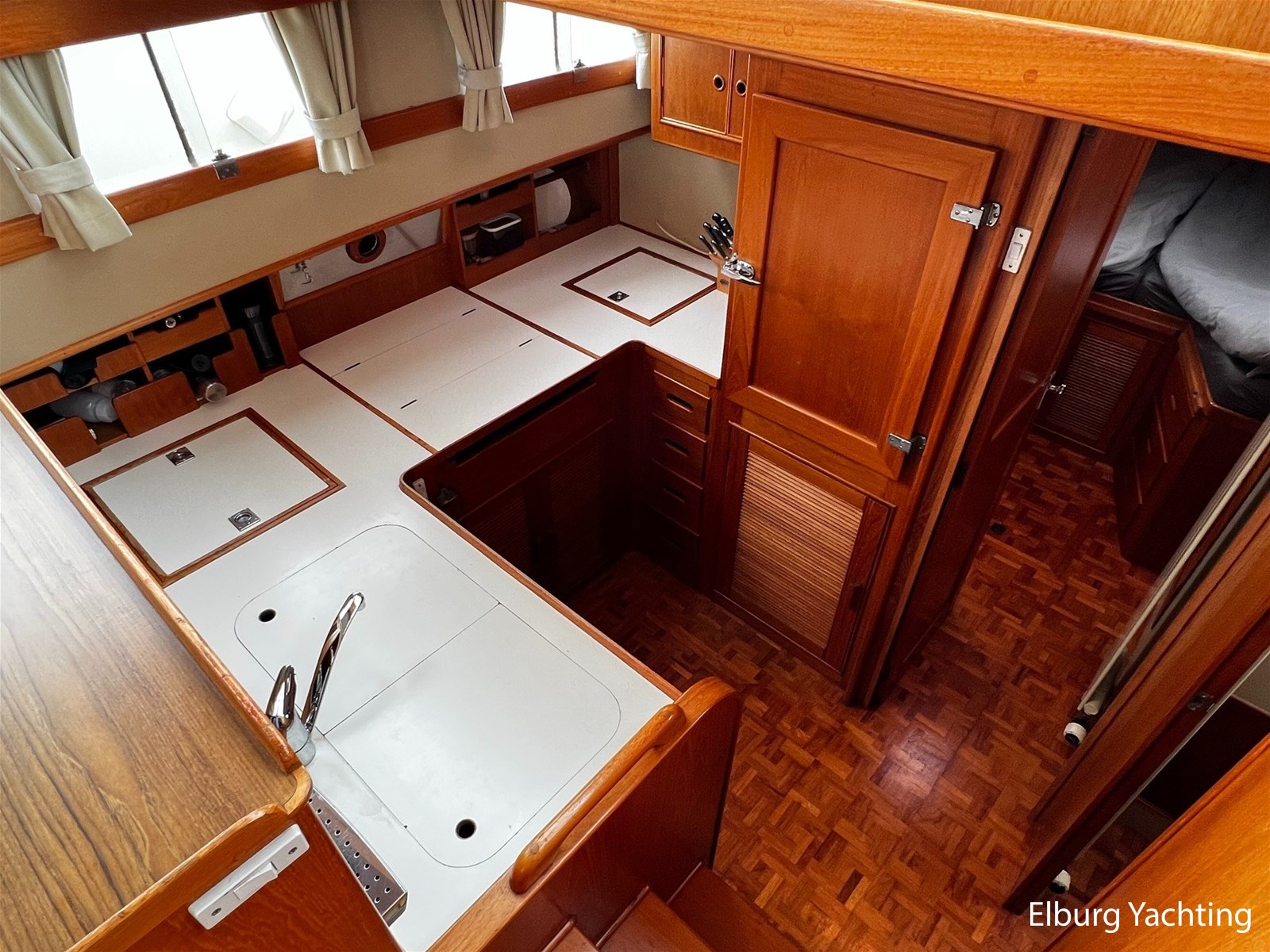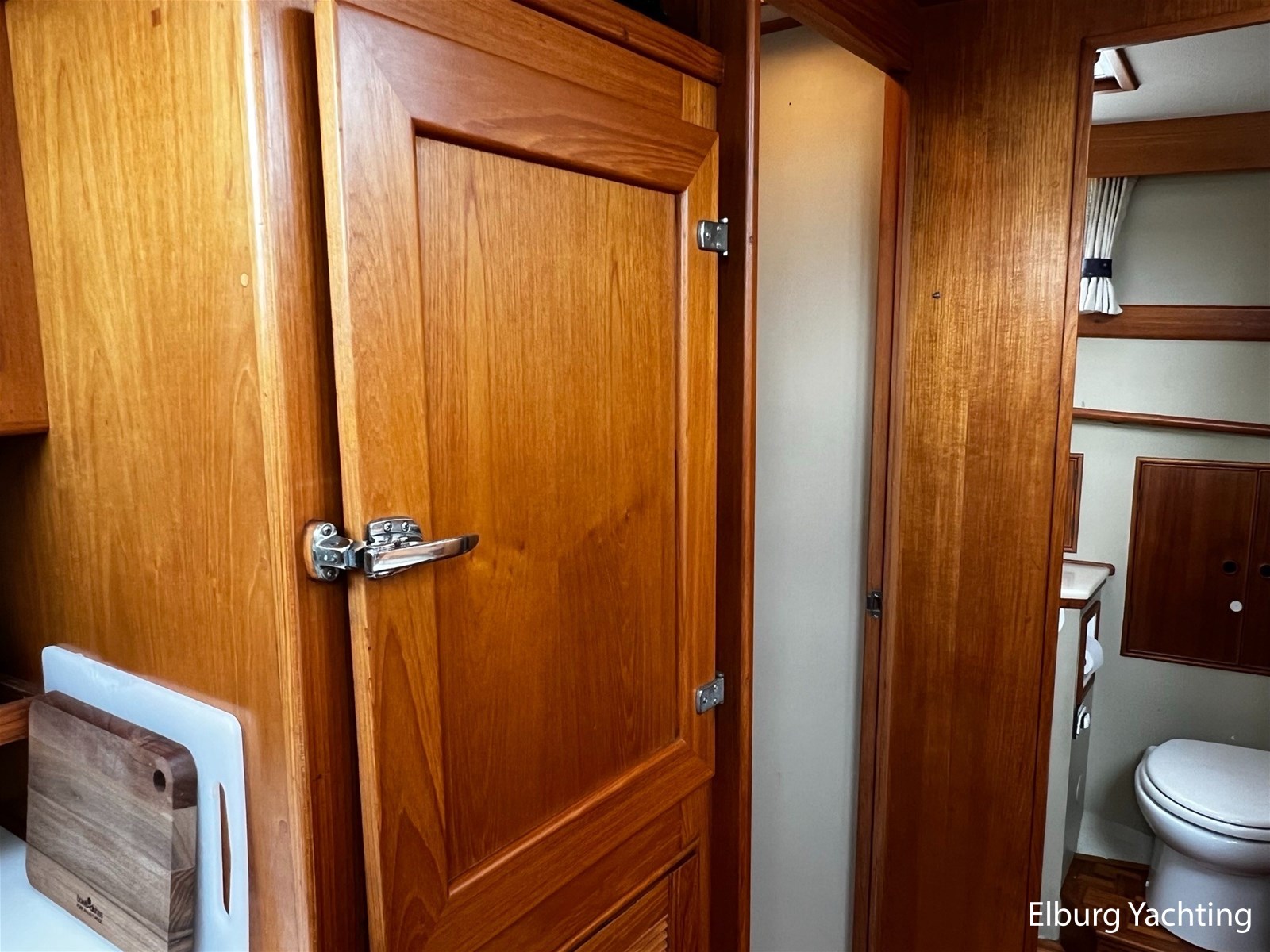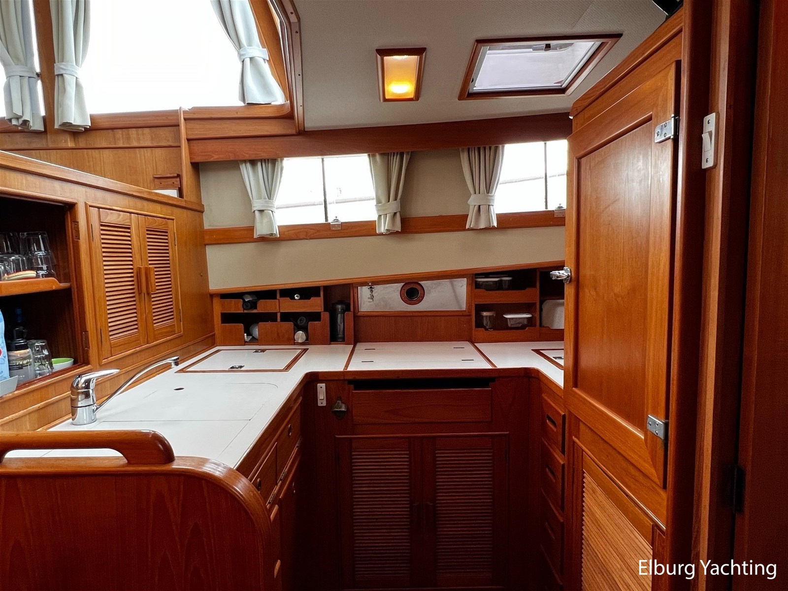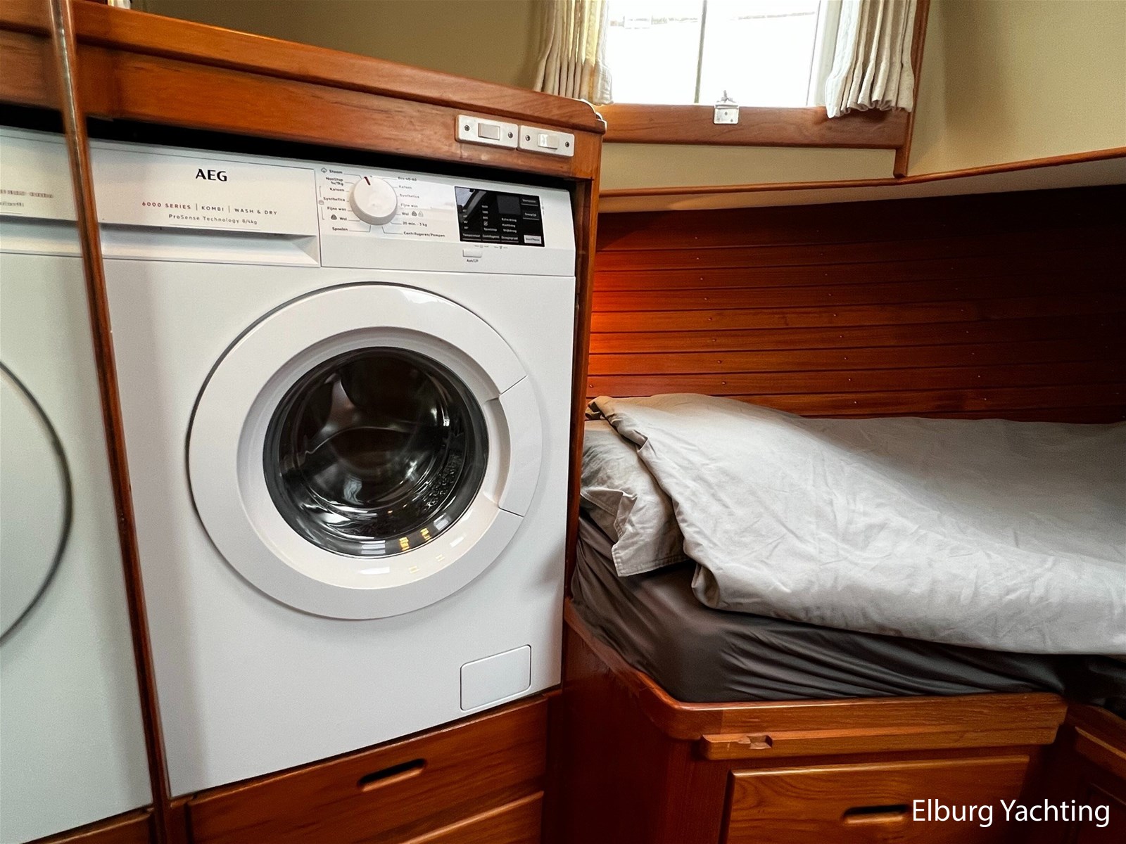 Teak scheepsinterieur + blauwe stoffen binnen bekleding
