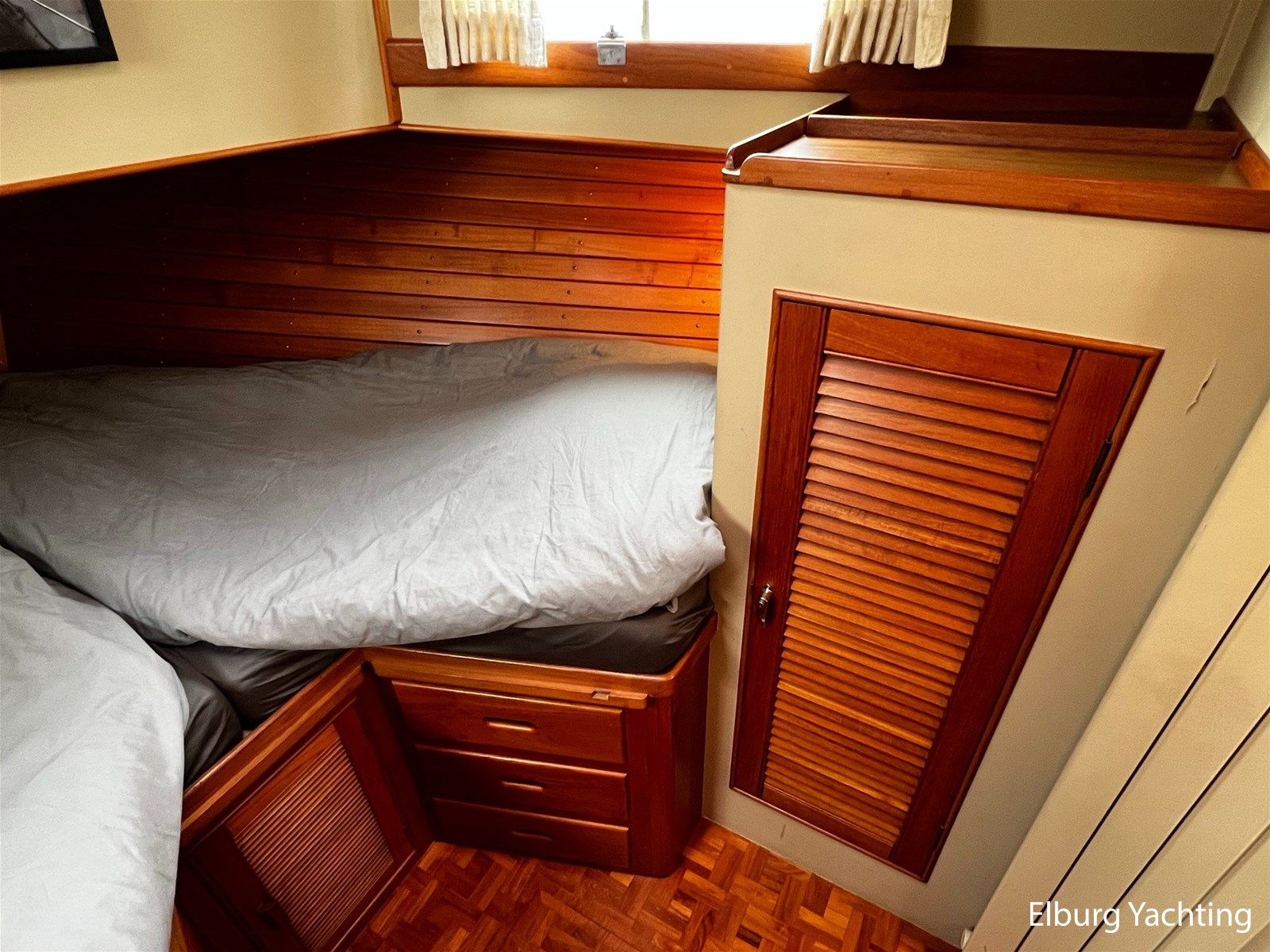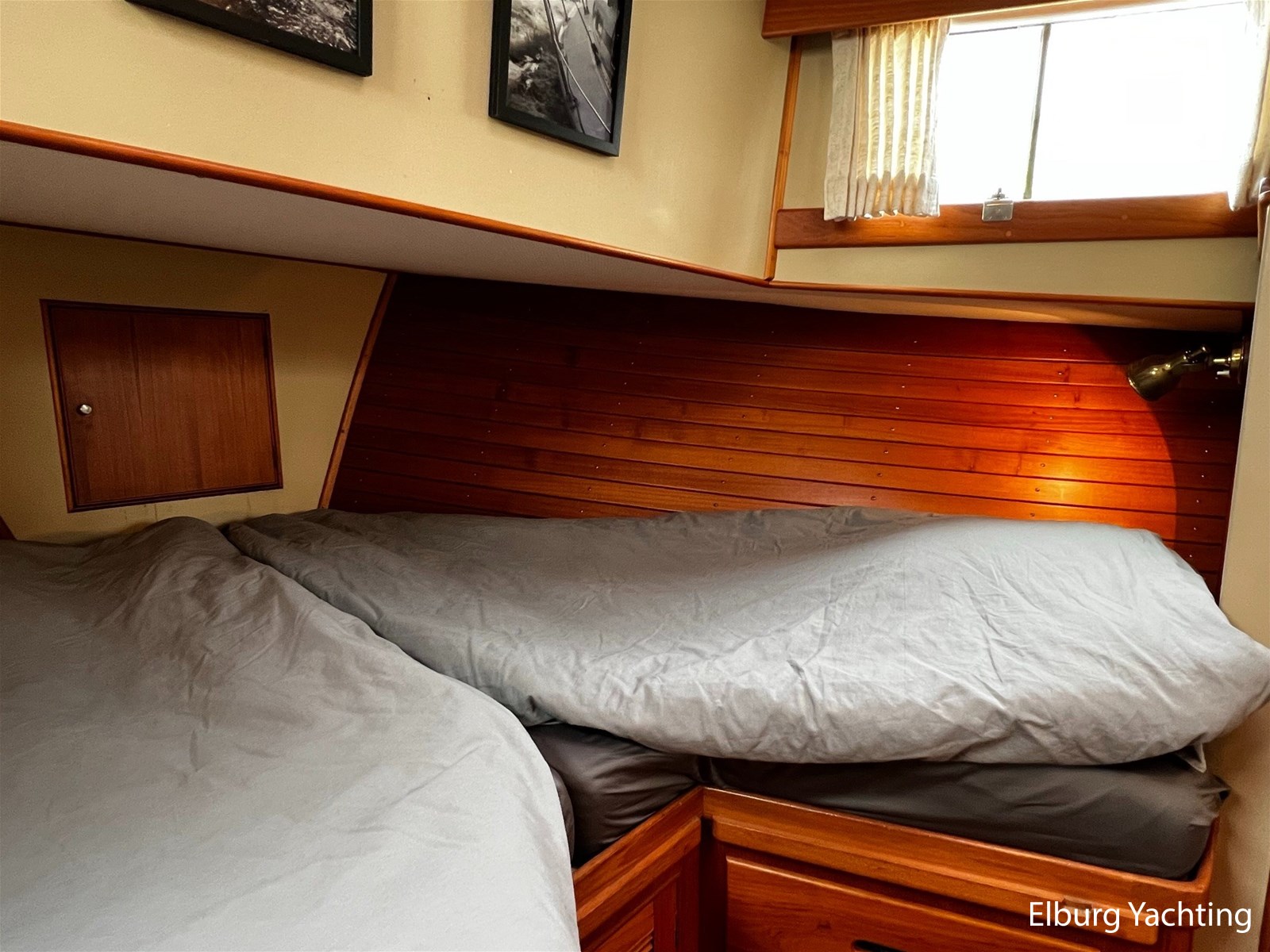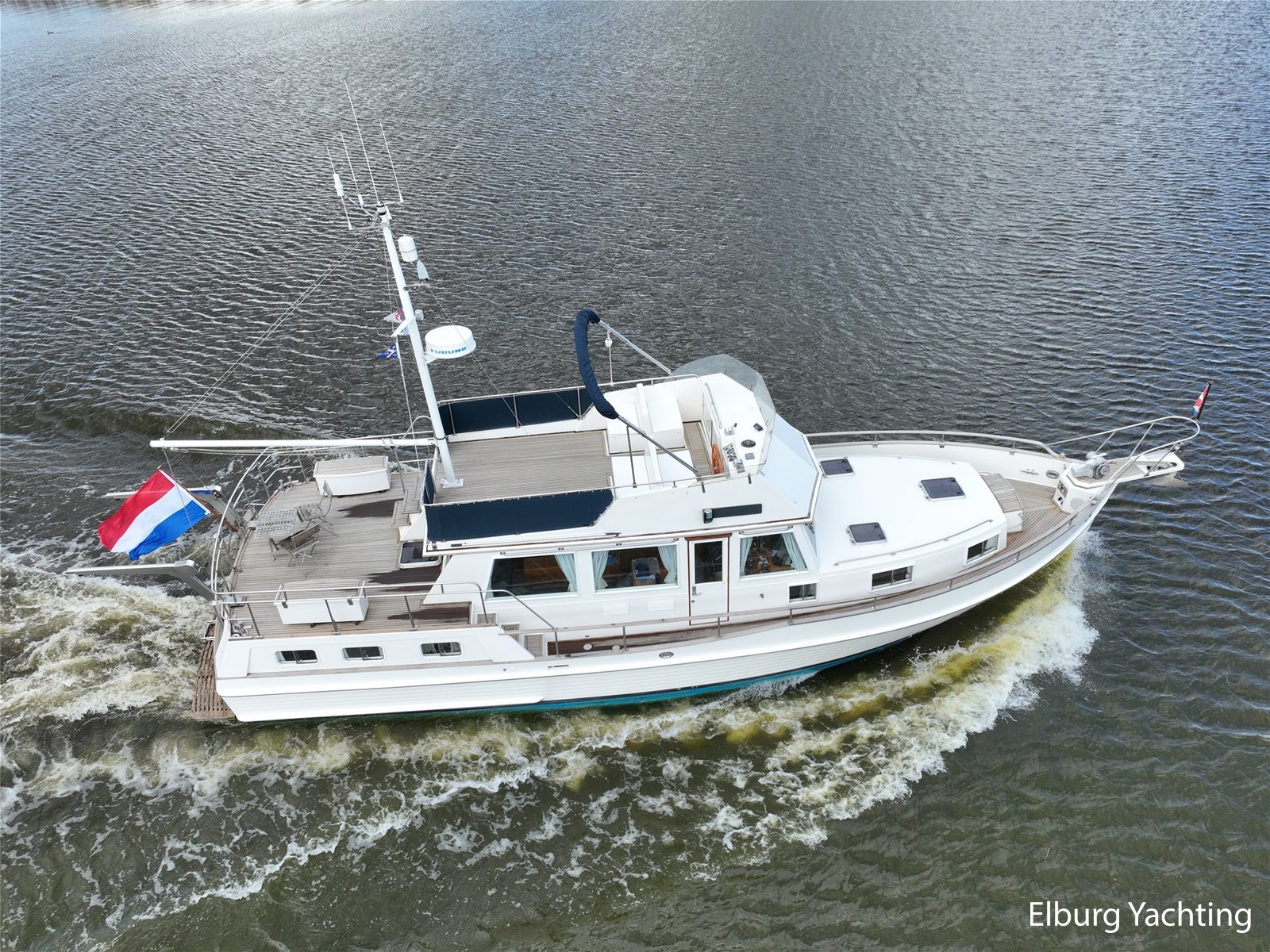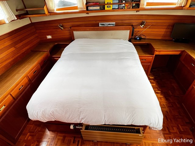 De Grand Banks 42 Motoryacht is een echte Grand Banks in zijn vaarprestaties en kwaliteitsbouw. De 'Motoryacht' uitvoering kenmerkt zich door de achterkajuit die zich rekt over de volledige breedte van het schip. Dit resulteert in een prachtig ruime 2 persoons eigenaarshut, maar biedt direct hiermee ook een groot achterdek met open verbinding naar de flybridge. De binnenstuurstand en salon zijn bereikbaar via een zijdeur in het gangboord aan zowel stuur- als bakboordzijde. De salon is ruim opgezet met diverse zitmogelijkheden en een gezellige bar om aan te ontbijten of bijvoorbeeld te werken. De kombuis is in open verbinding met de salon. De voorhut beschikt over een 1 x 2 persoons V-bed, ook is er een AEG was droog combinatie aanwezig. De badkamer in het voorschip heeft een eigen toilet en douche voorziening. In het achterschip is de eigenaarshut gesitueerd met een groot vrijstaand 2-persoonsbed. Er is bewegingsruimte rondom het bed en er is veel kastruimte beschikbaar. De toilet en douche zijn in een eigen kabine van elkaar gescheiden. Uniek voor dit schip is de centrale verwarming die via meerdere radiatoren door het gehele schip een aangename warmte verspreiden zonder het lawaai van een ventilator. Deze Grand Banks 42 Motoryacht is uitgerust met: Biminitop, geintegreerde banken op flybridge met bijbehorende kussens, TV in salon, bakskisten op het achterdek, dekwaspomp, zonneschermen voor de voorste salonramen, afdekhoes over stuurstand op flybridge, geïsoleerde vloerluiken voor toegang machinekamer, doorvaarthoogte met mast op ca. 8m, met geklapte mast ca. 5m, zonder bimini ca. 4,20m. Eind 2023 is er groot onderhoud aan beide hoofdmotoren en de generator uitgevoerd waarbij de volgende werkzaamheden zijn uitgevoerd: vervangen olie, filters, impellers, V-snaren, kleppendeksel pakking, keerkoppeling olie, 2 x koelwaterpomp vernieuwd. Ook is er nieuwe antifouling aangebracht en zijn de anodes vernieuwd. Voor vragen en/of het maken van een afspraak bent u 7 dagen per week van harte welkom bij Elburg Yachting.