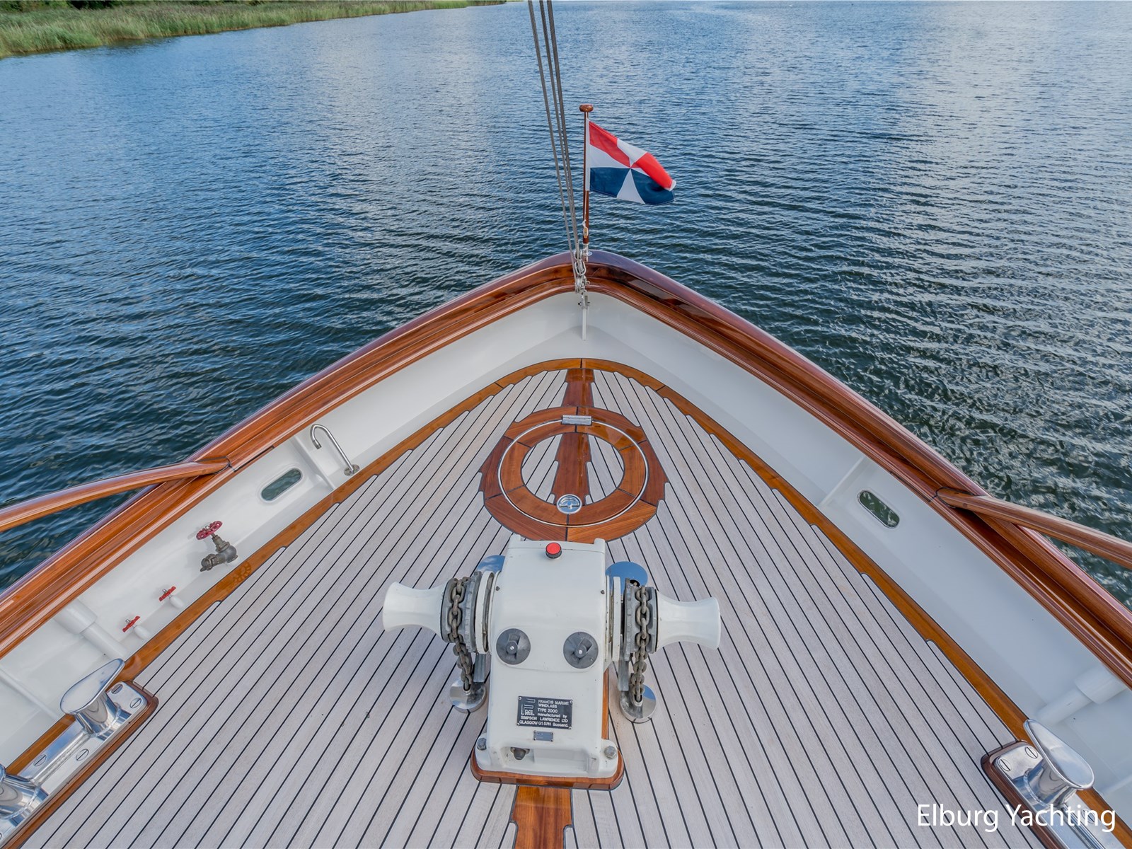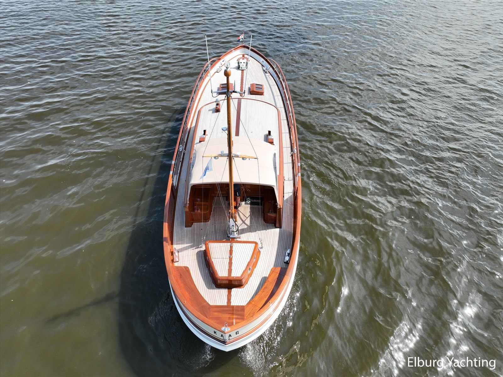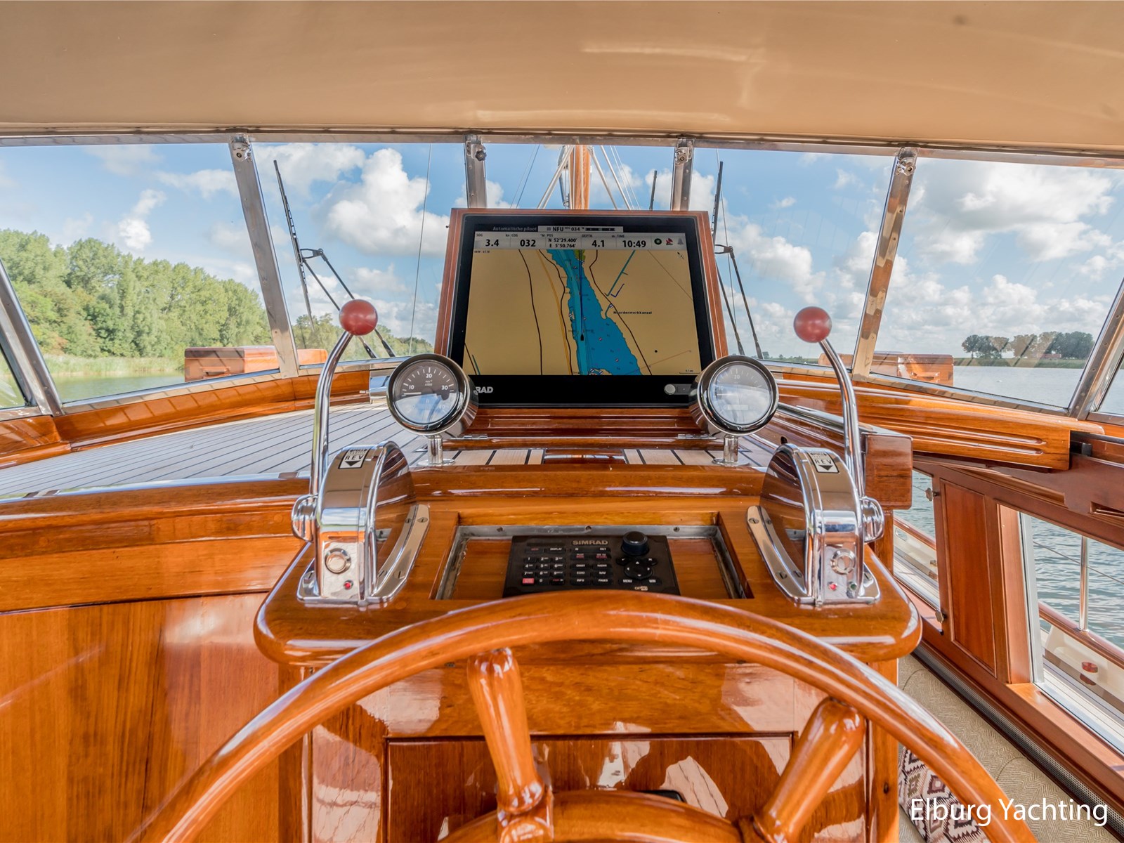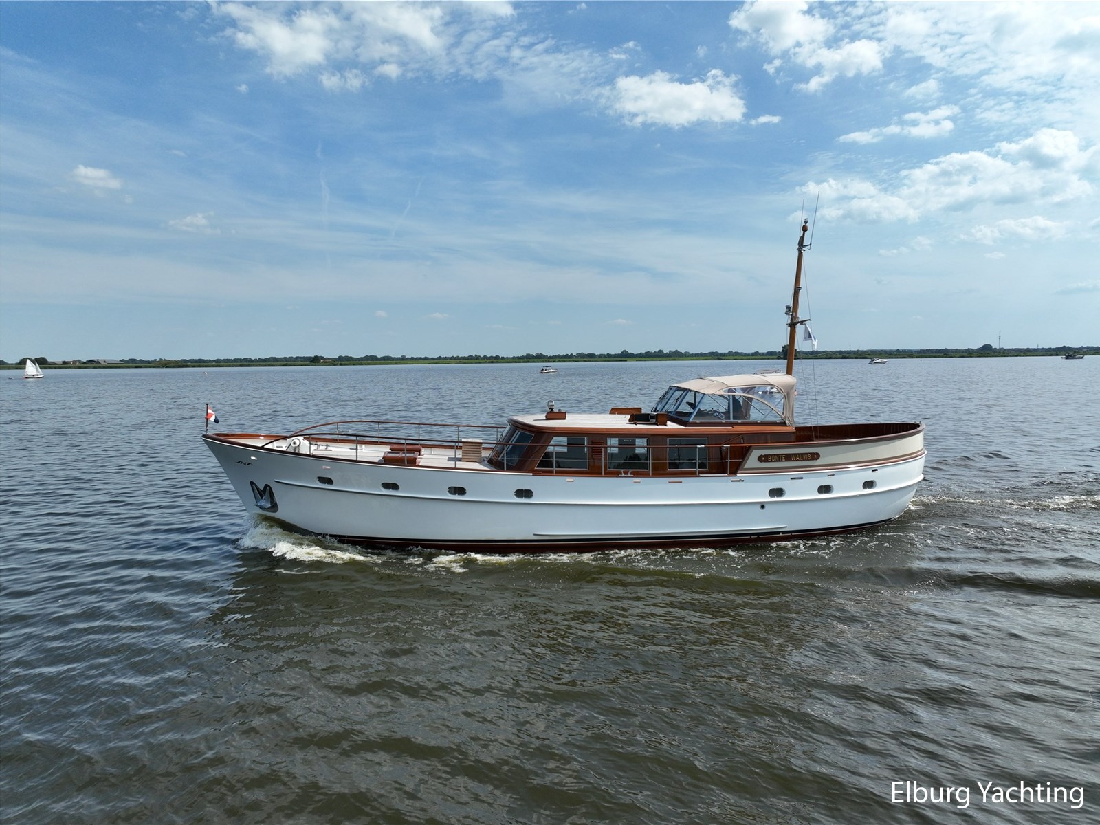 De Lunstroo 56 - (Total Refit 2015) is een stuk maritieme geschiedenis en zonder twijfel een van de meest in het oog springende kotterjachten die rondvaart. Het schip is gelanceerd in 1974, maar heeft in 2015 een volledige refit ondergaan op bij Nicolaas Witsen, waar kosten nog moeite zijn gespaard. Het schip heeft 2 nieuwe Perkins motoren gekregen, welke bekend staan om het lage toerental en laag geluidsniveau. Tijdens de refit is o.a. het volgende uitgevoerd : Nieuw massief teakdek (22 mm), nieuw teak kajuitdak (15 mm), Alle gelakte teakhout elementen van de kajuitopbouw zijn nieuw vervaardigd, verchroomde patrijspoorten, nieuw verpakte raamframes, de gehele elektrische installatie is vernieuwd incl. pompen en andere apparaten, nieuwe navigatieapparatuur, nieuw schroefassen, schroefaslagers, stuwdruklagers en schroeven. Alle tanks zijn open geweest, schoongemaakt en geïnspecteerd. (Zowel diesel, water en vuilwatertanks.), Leidingwerk is gemeten op wanddikte. Romp geschilderd in Awl Grip. Al het blanke lakwerk met impregneerhars en Dubbel UV Coating van Dubbelcoat Van de IJssel. (met uitzondering van de rondhouten), Motorbediening Morse omgebouwd tot elektronische bediening, Kabola CV met warmwatervoorziening gemonteerd, nieuwe stoffering, nieuw matrassen. De Lunstroo 56 beschikt over veel leefruimte in de salon en op het achterdek. Het is een uniek motorjacht met hoogwaardige afwerking met modern comfort en nieuwe techniek, geschikt om voor langere tijd op te verblijven. R.v.s. reling, r.v.s stootlijst, ruime zitgelegenheid in de salon, 7 slaapplaatsen, chroom omrand windscherm, achteringang, 2 x vluchtluik voorin, Miele wasmachine, stahoogte ca. 2 meter, achterhut geschikt voor crewcabine (incl. entree machinekamer), goed geïsoleerde machinekamer. Stereoset BOSE Binnen en Buiten (2015), Lowe TV + Lift (2015), CVO certificaat aanwezig, bilge alarm aanwezig in 3 zone’s . De huidige eigenaar heeft om makkelijker lage bruggen te passeren de voormast gedemonteerd en droog opgeslagen en de achtermast klapbaar gemaakt d.m.v. een lier. Ook is in de stuurboord hut één van de stabelbedden weggenomen om meer ruimte te creëren. De doorvaarthoogte met mast op is ca. 8,40m en met geklapte mast en kuipramen geklapt ca. 2,90m.