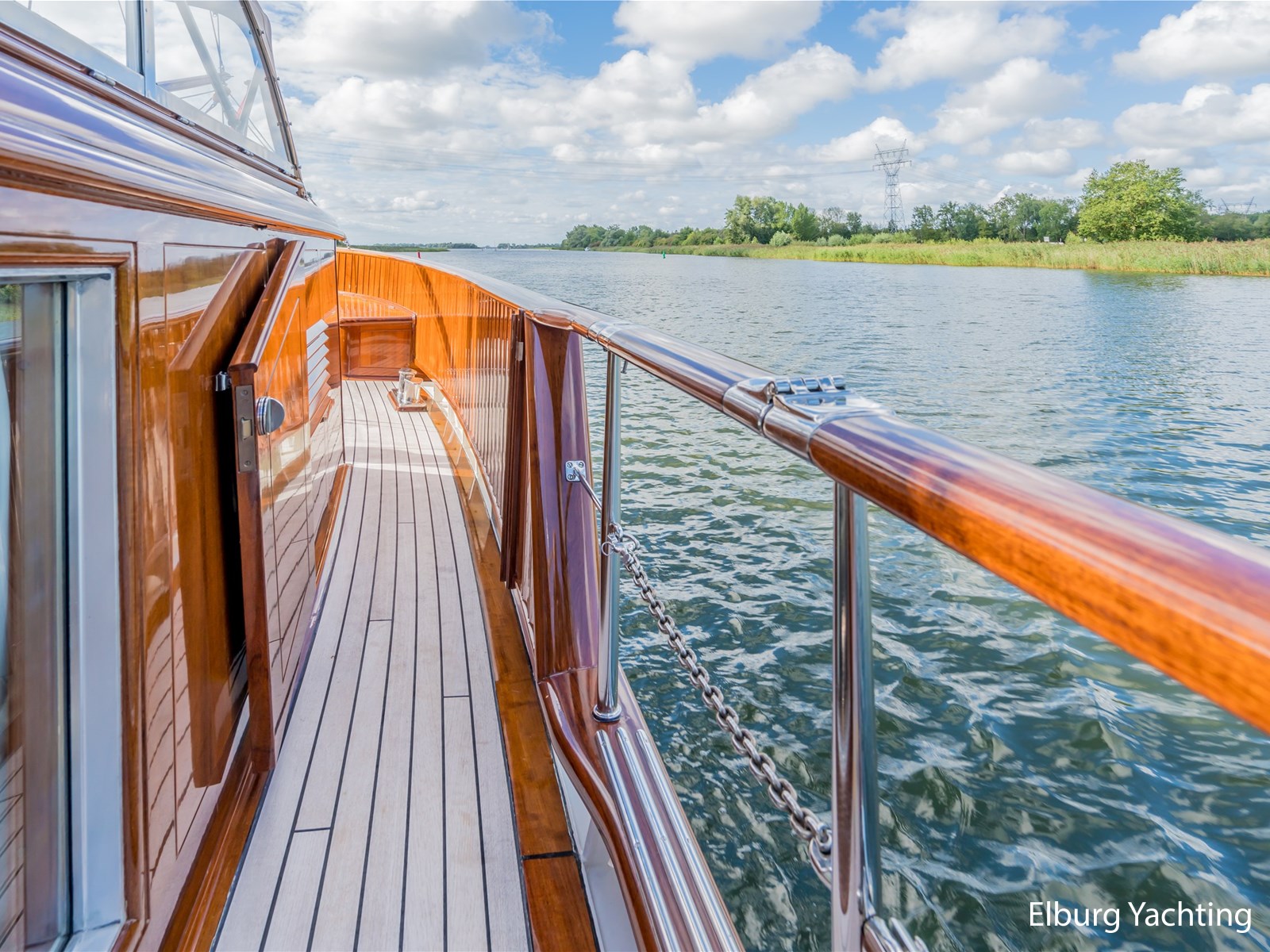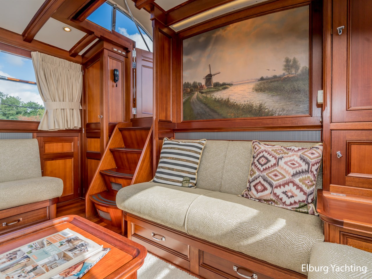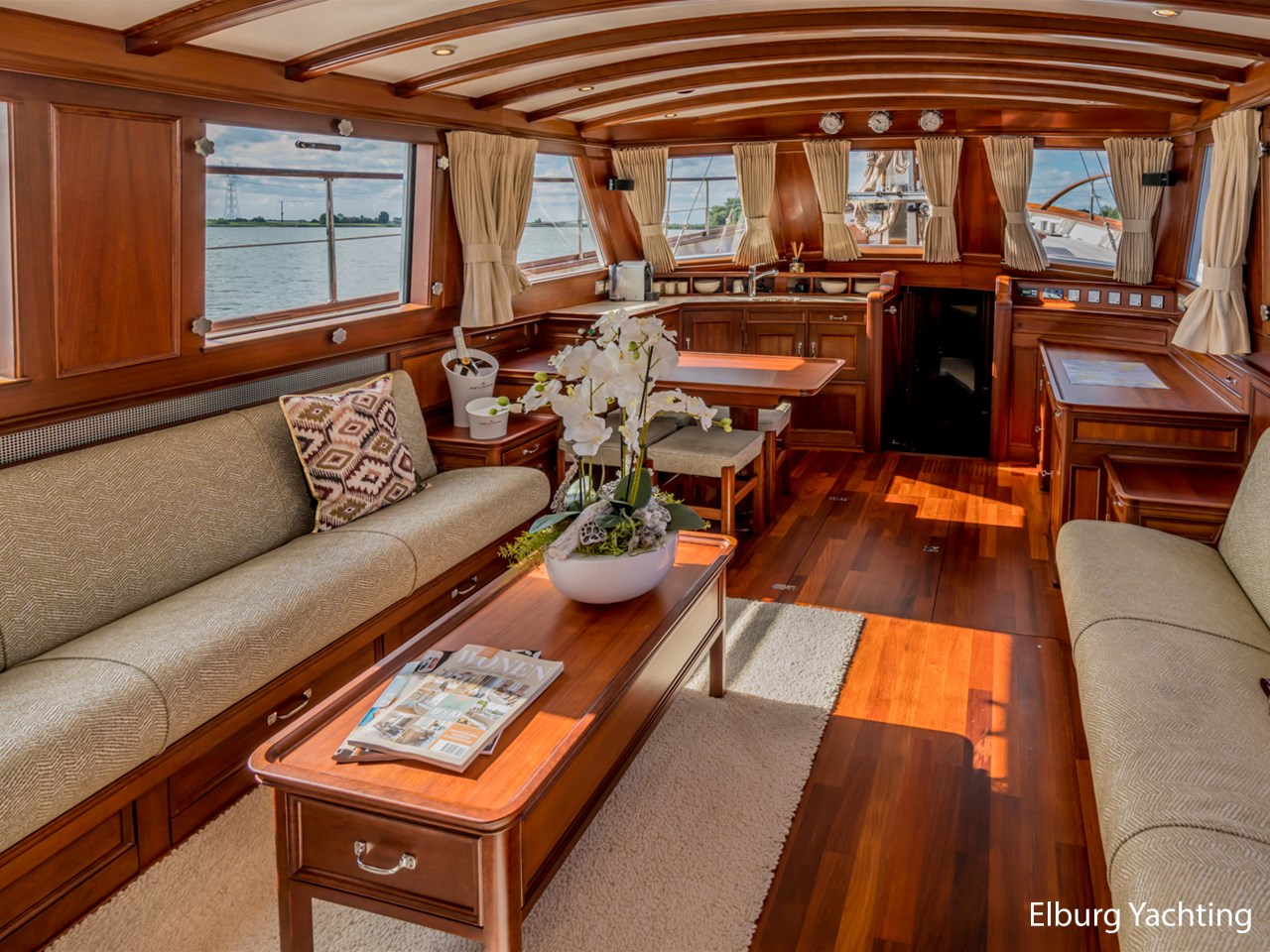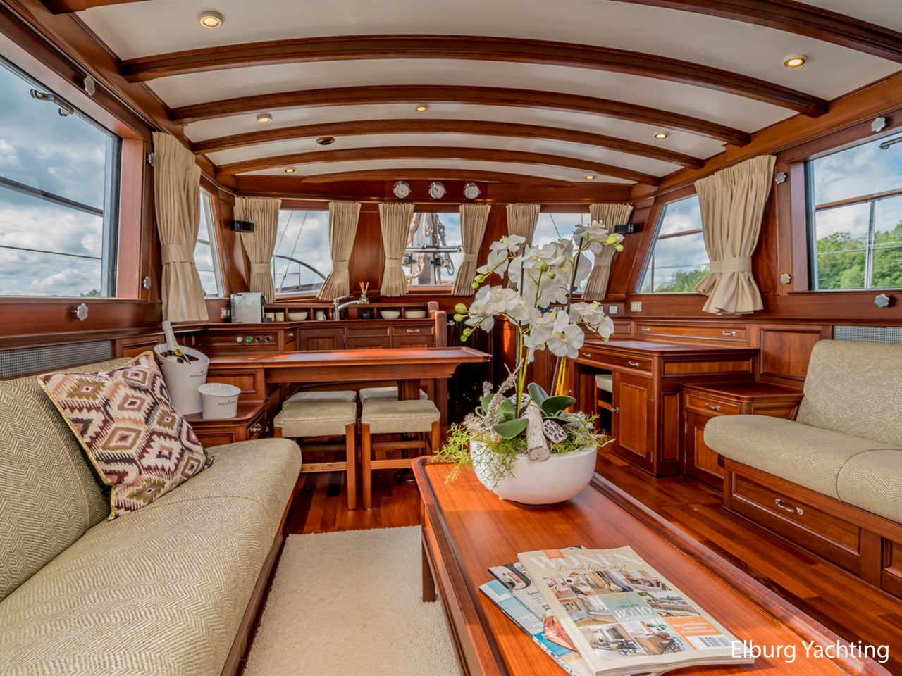 De Lunstroo 56 - (Total Refit 2015) is een stuk maritieme geschiedenis en zonder twijfel een van de meest in het oog springende kotterjachten die rondvaart. Het schip is gelanceerd in 1974, maar heeft in 2015 een volledige refit ondergaan op bij Nicolaas Witsen, waar kosten nog moeite zijn gespaard. Het schip heeft 2 nieuwe Perkins motoren gekregen, welke bekend staan om het lage toerental en laag geluidsniveau. Tijdens de refit is o.a. het volgende uitgevoerd : Nieuw massief teakdek (22 mm), nieuw teak kajuitdak (15 mm), Alle gelakte teakhout elementen van de kajuitopbouw zijn nieuw vervaardigd, verchroomde patrijspoorten, nieuw verpakte raamframes, de gehele elektrische installatie is vernieuwd incl. pompen en andere apparaten, nieuwe navigatieapparatuur, nieuw schroefassen, schroefaslagers, stuwdruklagers en schroeven. Alle tanks zijn open geweest, schoongemaakt en geïnspecteerd. (Zowel diesel, water en vuilwatertanks.), Leidingwerk is gemeten op wanddikte. Romp geschilderd in Awl Grip. Al het blanke lakwerk met impregneerhars en Dubbel UV Coating van Dubbelcoat Van de IJssel. (met uitzondering van de rondhouten), Motorbediening Morse omgebouwd tot elektronische bediening, Kabola CV met warmwatervoorziening gemonteerd, nieuwe stoffering, nieuw matrassen. De Lunstroo 56 beschikt over veel leefruimte in de salon en op het achterdek. Het is een uniek motorjacht met hoogwaardige afwerking met modern comfort en nieuwe techniek, geschikt om voor langere tijd op te verblijven. R.v.s. reling, r.v.s stootlijst, ruime zitgelegenheid in de salon, 7 slaapplaatsen, chroom omrand windscherm, achteringang, 2 x vluchtluik voorin, Miele wasmachine, stahoogte ca. 2 meter, achterhut geschikt voor crewcabine (incl. entree machinekamer), goed geïsoleerde machinekamer. Stereoset BOSE Binnen en Buiten (2015), Lowe TV + Lift (2015), CVO certificaat aanwezig, bilge alarm aanwezig in 3 zone’s . De huidige eigenaar heeft om makkelijker lage bruggen te passeren de voormast gedemonteerd en droog opgeslagen en de achtermast klapbaar gemaakt d.m.v. een lier. Ook is in de stuurboord hut één van de stabelbedden weggenomen om meer ruimte te creëren. De doorvaarthoogte met mast op is ca. 8,40m en met geklapte mast en kuipramen geklapt ca. 2,90m.