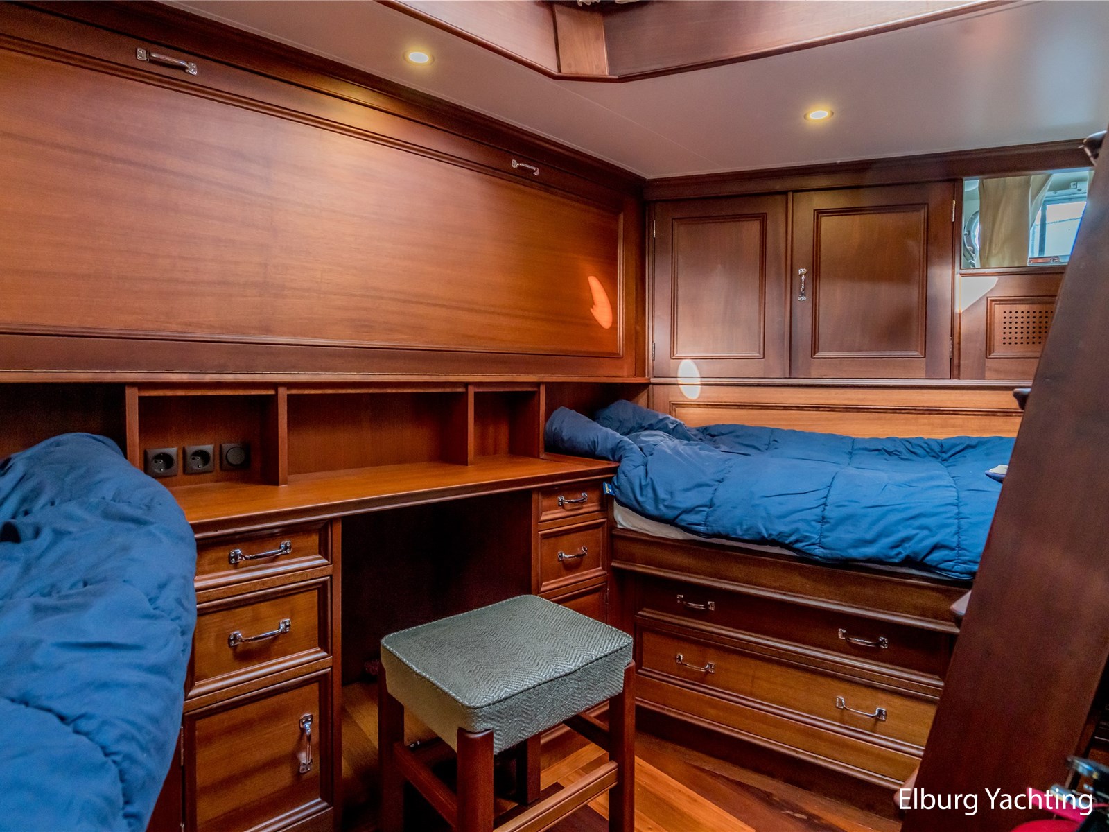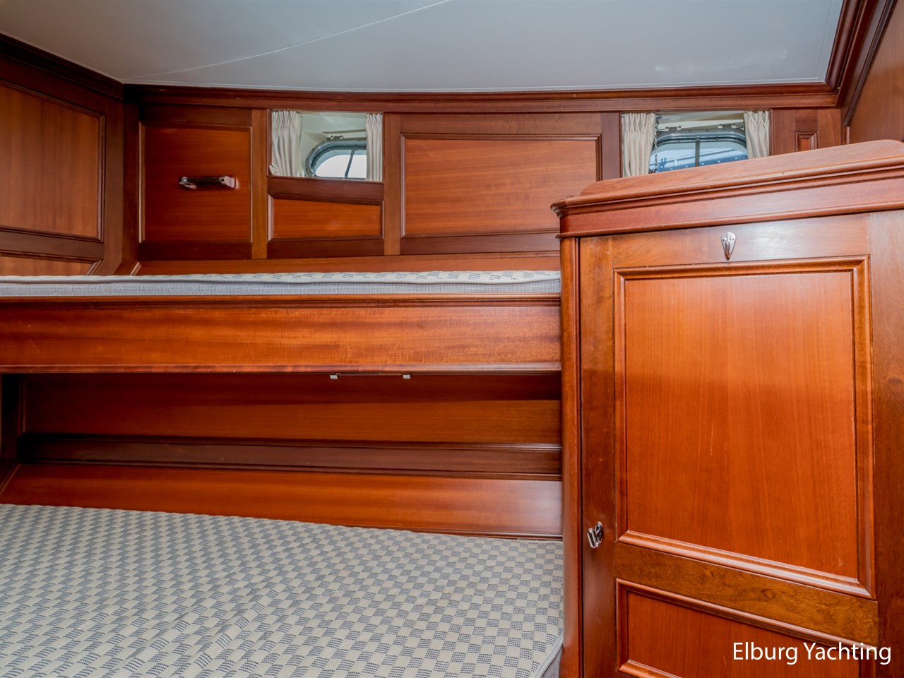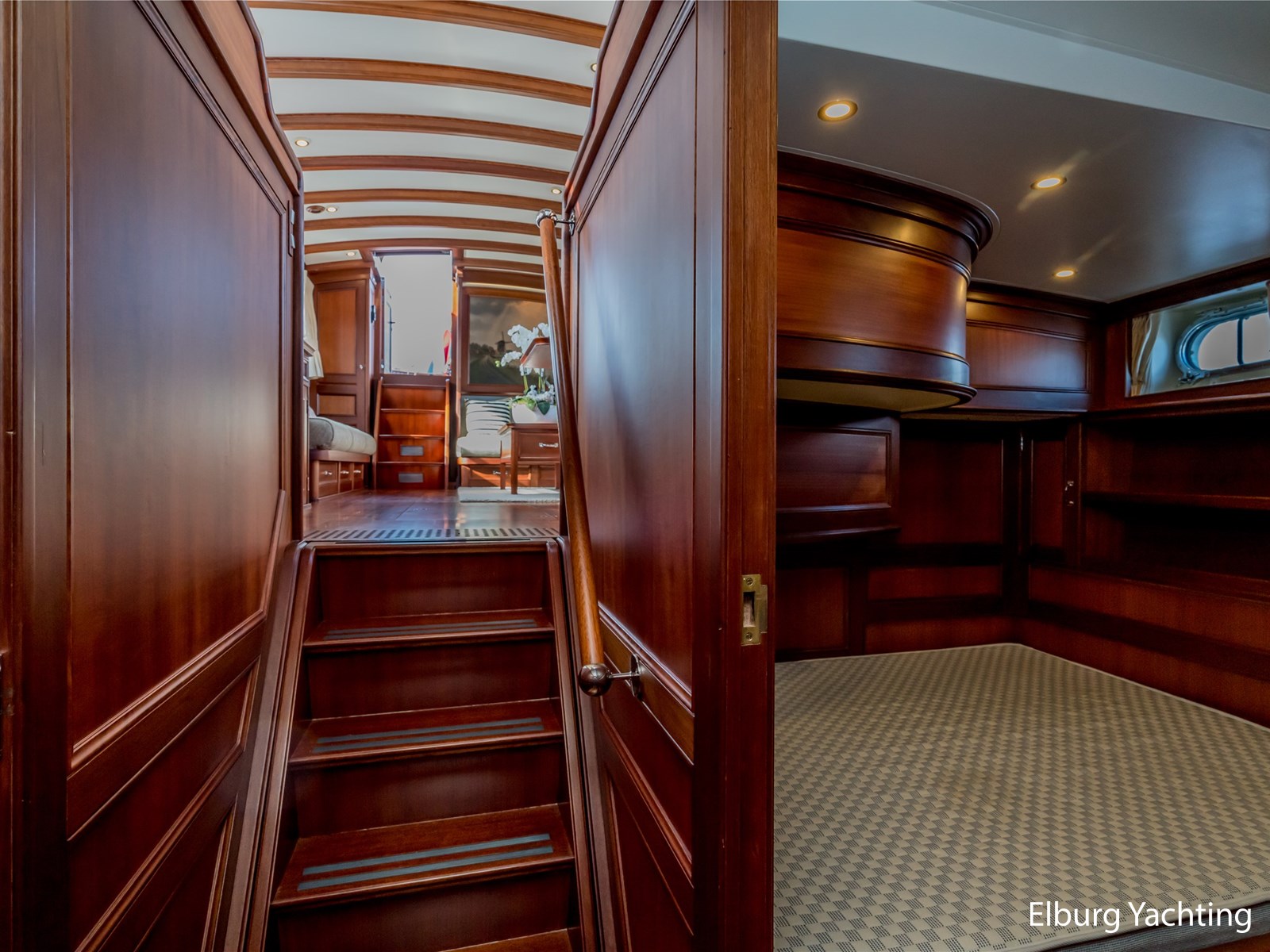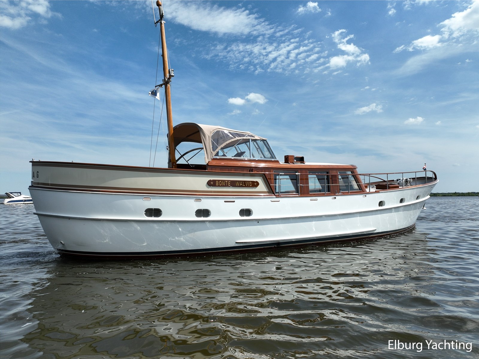 De Lunstroo 56 - (Total Refit 2015) is een stuk maritieme geschiedenis en zonder twijfel een van de meest in het oog springende kotterjachten die rondvaart. Het schip is gelanceerd in 1974, maar heeft in 2015 een volledige refit ondergaan op bij Nicolaas Witsen, waar kosten nog moeite zijn gespaard. Het schip heeft 2 nieuwe Perkins motoren gekregen, welke bekend staan om het lage toerental en laag geluidsniveau. Tijdens de refit is o.a. het volgende uitgevoerd : Nieuw massief teakdek (22 mm), nieuw teak kajuitdak (15 mm), Alle gelakte teakhout elementen van de kajuitopbouw zijn nieuw vervaardigd, verchroomde patrijspoorten, nieuw verpakte raamframes, de gehele elektrische installatie is vernieuwd incl. pompen en andere apparaten, nieuwe navigatieapparatuur, nieuw schroefassen, schroefaslagers, stuwdruklagers en schroeven. Alle tanks zijn open geweest, schoongemaakt en geïnspecteerd. (Zowel diesel, water en vuilwatertanks.), Leidingwerk is gemeten op wanddikte. Romp geschilderd in Awl Grip. Al het blanke lakwerk met impregneerhars en Dubbel UV Coating van Dubbelcoat Van de IJssel. (met uitzondering van de rondhouten), Motorbediening Morse omgebouwd tot elektronische bediening, Kabola CV met warmwatervoorziening gemonteerd, nieuwe stoffering, nieuw matrassen. De Lunstroo 56 beschikt over veel leefruimte in de salon en op het achterdek. Het is een uniek motorjacht met hoogwaardige afwerking met modern comfort en nieuwe techniek, geschikt om voor langere tijd op te verblijven. R.v.s. reling, r.v.s stootlijst, ruime zitgelegenheid in de salon, 7 slaapplaatsen, chroom omrand windscherm, achteringang, 2 x vluchtluik voorin, Miele wasmachine, stahoogte ca. 2 meter, achterhut geschikt voor crewcabine (incl. entree machinekamer), goed geïsoleerde machinekamer. Stereoset BOSE Binnen en Buiten (2015), Lowe TV + Lift (2015), CVO certificaat aanwezig, bilge alarm aanwezig in 3 zone’s . De huidige eigenaar heeft om makkelijker lage bruggen te passeren de voormast gedemonteerd en droog opgeslagen en de achtermast klapbaar gemaakt d.m.v. een lier. Ook is in de stuurboord hut één van de stabelbedden weggenomen om meer ruimte te creëren. De doorvaarthoogte met mast op is ca. 8,40m en met geklapte mast en kuipramen geklapt ca. 2,90m.