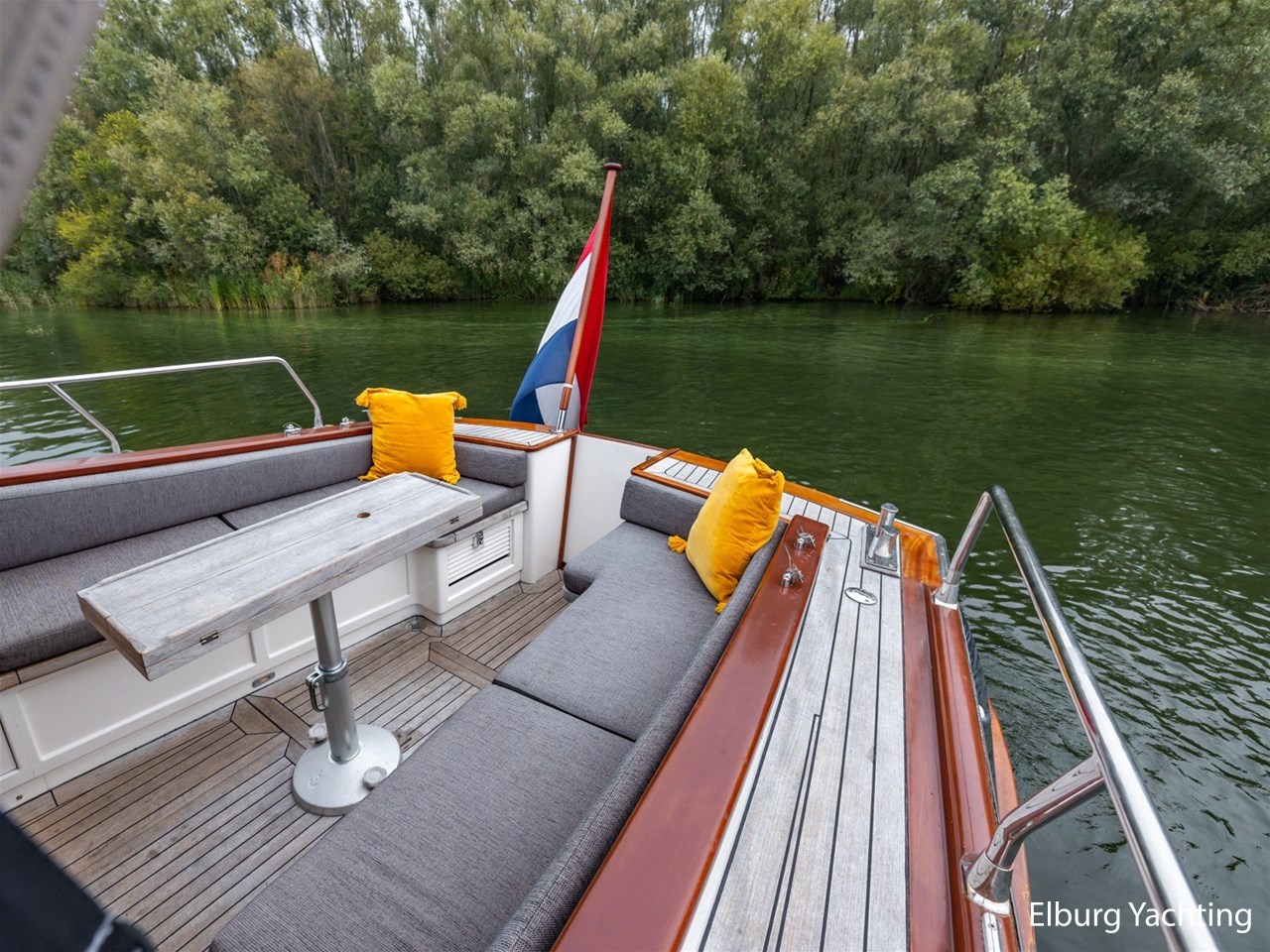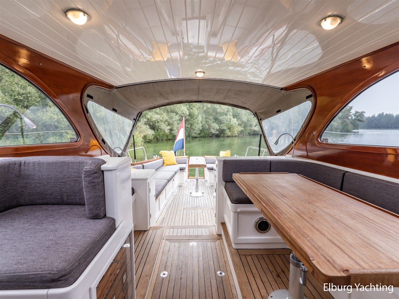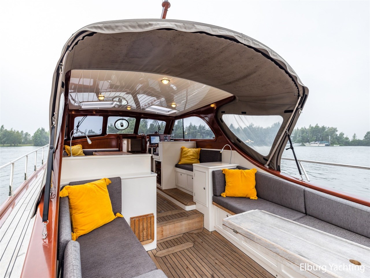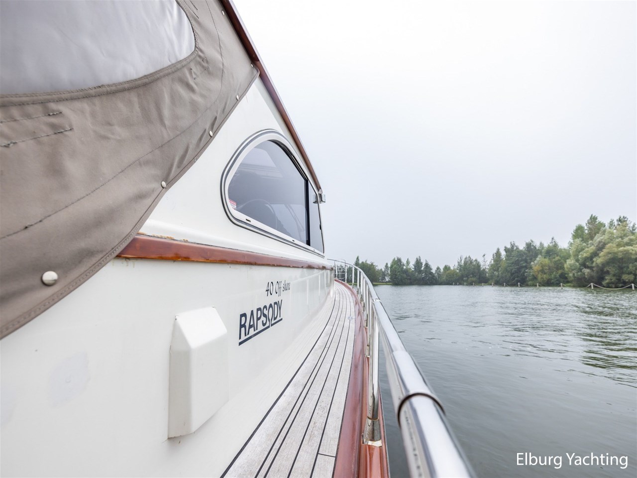 Uiterst fraaie Rapsody 40 Offshore uit bouwjaar 2002 - voorzien van een prachtig Teakdek met gelakte omlijsting en r.v.s. zeerailing. Het jacht beschikt over een prachtige klassieke lijn met moderne ingrediënten zoals de ruime open kuip en het frisse lichte interieur. Het jacht is rondom voorzien van een Teakdek en is afgewerkt met gelakt Teak (zowel de opbouw, het dek en het zwemplateau). De ruime kuip beschikt over een prettige zitgelegenheid, een ijskast en veel bergruimte onder de banken. De stuurstand met nabijgelegen dinette is gezellig gesitueerd onder het vaste dak. Het vaste dak beschikt over twee dakluiken en twee schuiframen aan de zijden. De stuurstand is overzichtelijk vormgegeven en beschikt over onder andere een functioneel Stentec navigatiesysteem, boegschroef, motorbediening en dieptemeter . Aan boord is de kombuis aan stuurboord gesitueerd met de tweede dinette aan bakboord. De kombuis is ruimtelijk georganiseerd met een Plastimo kooktoestel + oven, koelkast, spoelbak en veel kastruimte. Voorin is de eigenaarshut gesitueerd met nabijgelegen toilet en douche. De doorvaarthoogte is ca. 3.65 meter met een minimale kruiphoogte van ca. 2.70 meter. Voor vragen en/of het maken van een afspraak bent u 7 dagen per week van harte welkom bij Elburg Yachting.
