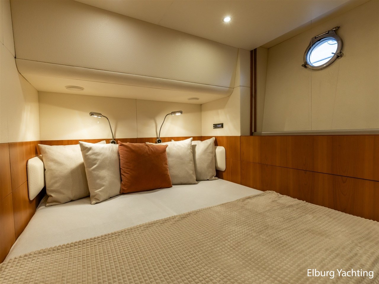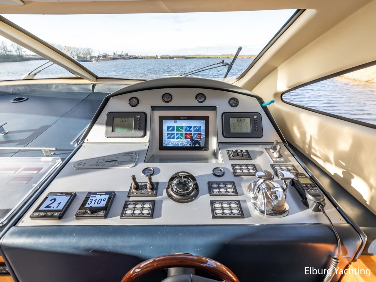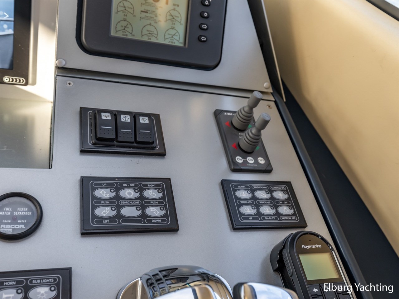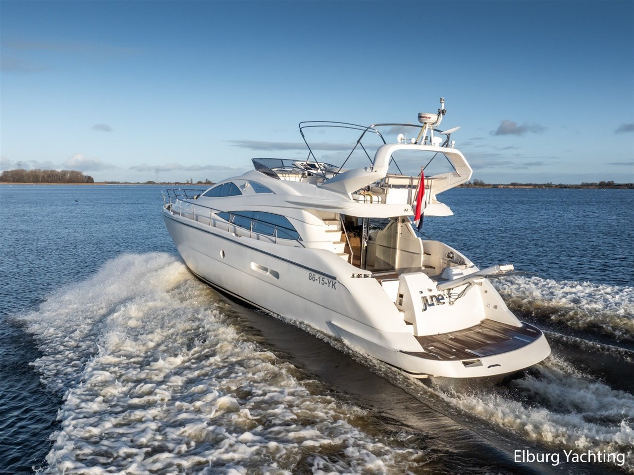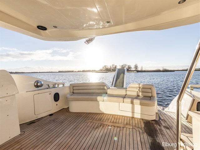 Deze Aicon 54 is een sportief gelijnd snelvarend motorjacht. Het schip heeft een ruime en open indeling, zo is de salon / dinette / stuurstand / kombuis met elkaar verbonden in een en dezelfde ruimte. Benedendeks bevinden zich de 3 x 2 persoons hutten en twee badkamers. Via de grote r.v.s. schuifpui is de binnenruimte met buiten te verbinden. In de kuip is een geïntegreerde kuipbank gesitueerd met bijbehorende kussens. In het achterschip bevindt er zich nog een 1 persoons crew cabin. Via een deur in de spiegel heb je toegang toe het brede zwemplateau, tevens kan hier een bijboot worden geplaatst welke met de hydraulisch gangway te water gelaten kan worden. Via een 'luie' trap vanuit de kuip bereik je de flybridge. De flybridge is van alle gemakken voorzien om hier overzichtelijk het schip te kunnen bedienen en hebben gasten alle comfort van een wetbar, zonnebed en volledige biminitop. Deze Aicon 54 genaamd 'June' is voorzien van: Volledige tent rondom achterdek met uitritsbare delen, 2 x elektrisch bedienbare lieren om het aanleggen te vergemakkelijken, groot afneembaar zonnebed op voordek, volledige kussenset voor open kuip en op flybridge, TV in salon op draaibare beugel, recent vernieuwde Raymarine navigatieapparatuur, de Hydronautica afstandsbediening maakt het aan- en afmeren kinderspel met een directe bediening voor de boeg-/hekschroef en motor(en) voor- en achteruit, wasmachine benedendeks, overzichtelijk elektrisch schakelpaneel, Caterpillar motormanagement displays. Volledig nieuw kunststof teakdek gelegd rondom en op de flybridge in 2026. Voor vragen en/of het maken van een afspraak bent u 7 dagen per week van harte welkom bij Elburg Yachting.