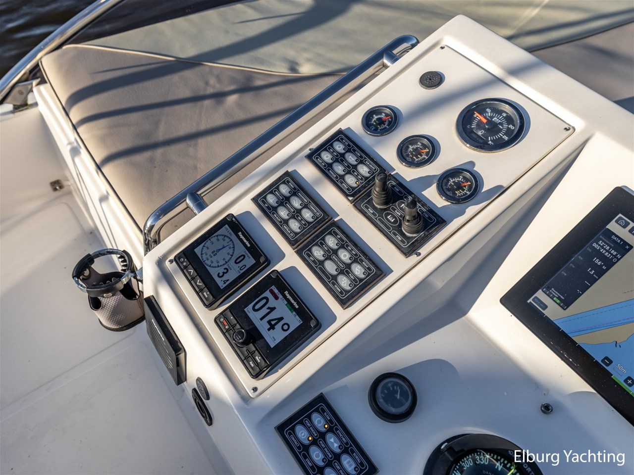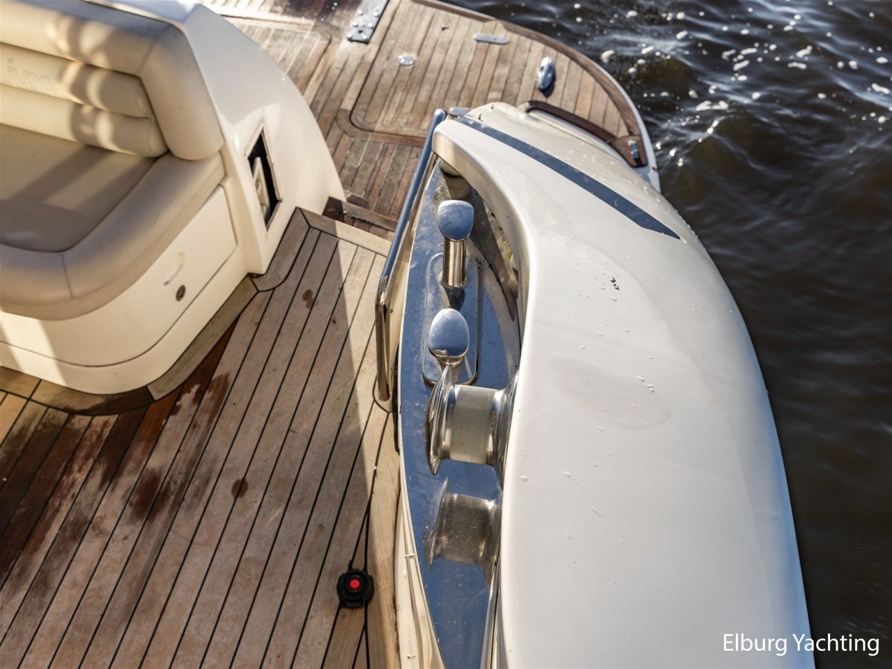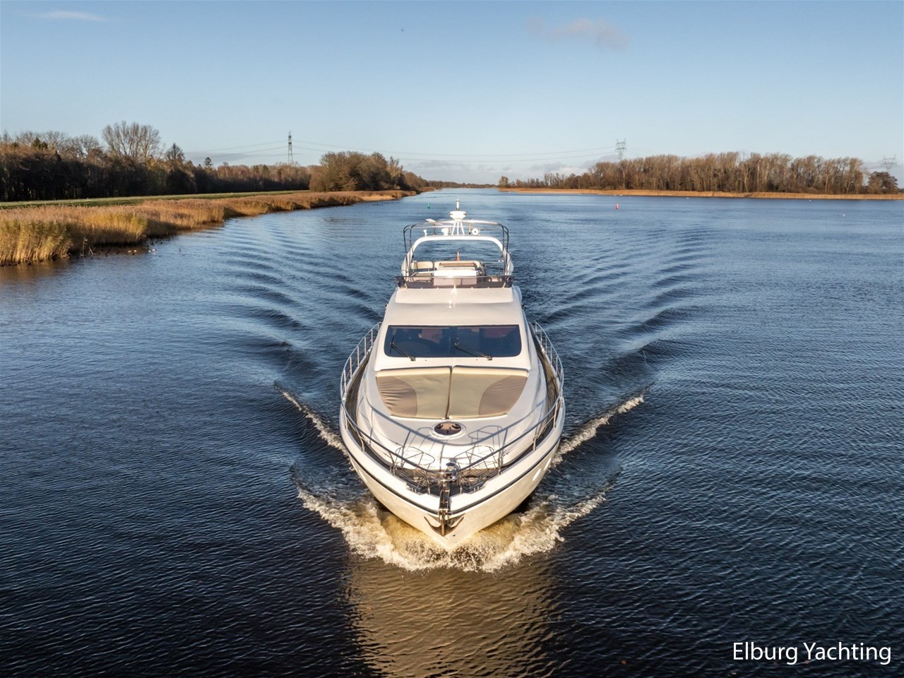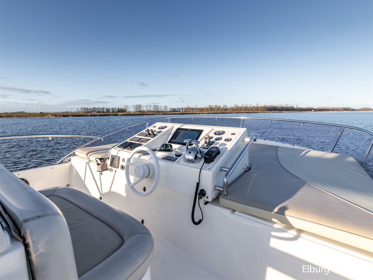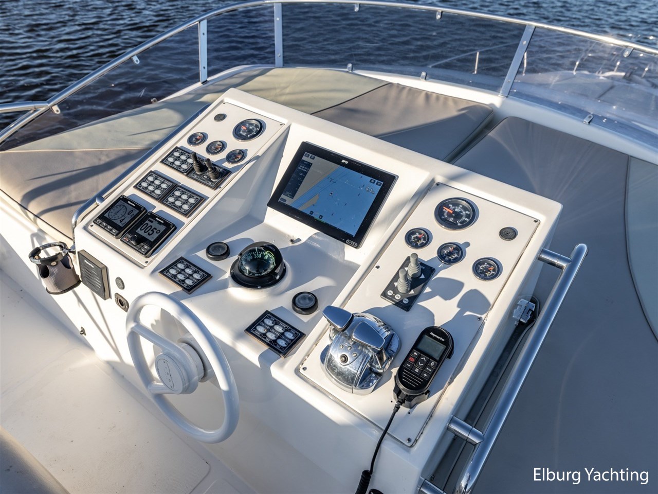 Deze Aicon 54 is een sportief gelijnd snelvarend motorjacht. Het schip heeft een ruime en open indeling, zo is de salon / dinette / stuurstand / kombuis met elkaar verbonden in een en dezelfde ruimte. Benedendeks bevinden zich de 3 x 2 persoons hutten en twee badkamers. Via de grote r.v.s. schuifpui is de binnenruimte met buiten te verbinden. In de kuip is een geïntegreerde kuipbank gesitueerd met bijbehorende kussens. In het achterschip bevindt er zich nog een 1 persoons crew cabin. Via een deur in de spiegel heb je toegang toe het brede zwemplateau, tevens kan hier een bijboot worden geplaatst welke met de hydraulisch gangway te water gelaten kan worden. Via een 'luie' trap vanuit de kuip bereik je de flybridge. De flybridge is van alle gemakken voorzien om hier overzichtelijk het schip te kunnen bedienen en hebben gasten alle comfort van een wetbar, zonnebed en volledige biminitop. Deze Aicon 54 genaamd 'June' is voorzien van: Volledige tent rondom achterdek met uitritsbare delen, 2 x elektrisch bedienbare lieren om het aanleggen te vergemakkelijken, groot afneembaar zonnebed op voordek, volledige kussenset voor open kuip en op flybridge, TV in salon op draaibare beugel, recent vernieuwde Raymarine navigatieapparatuur, de Hydronautica afstandsbediening maakt het aan- en afmeren kinderspel met een directe bediening voor de boeg-/hekschroef en motor(en) voor- en achteruit, wasmachine benedendeks, overzichtelijk elektrisch schakelpaneel, Caterpillar motormanagement displays. Volledig nieuw kunststof teakdek gelegd rondom en op de flybridge in 2026. Voor vragen en/of het maken van een afspraak bent u 7 dagen per week van harte welkom bij Elburg Yachting.