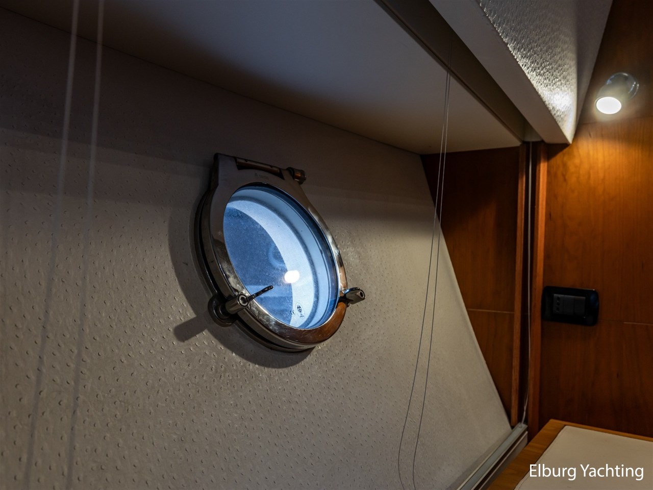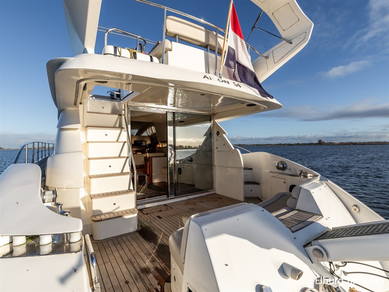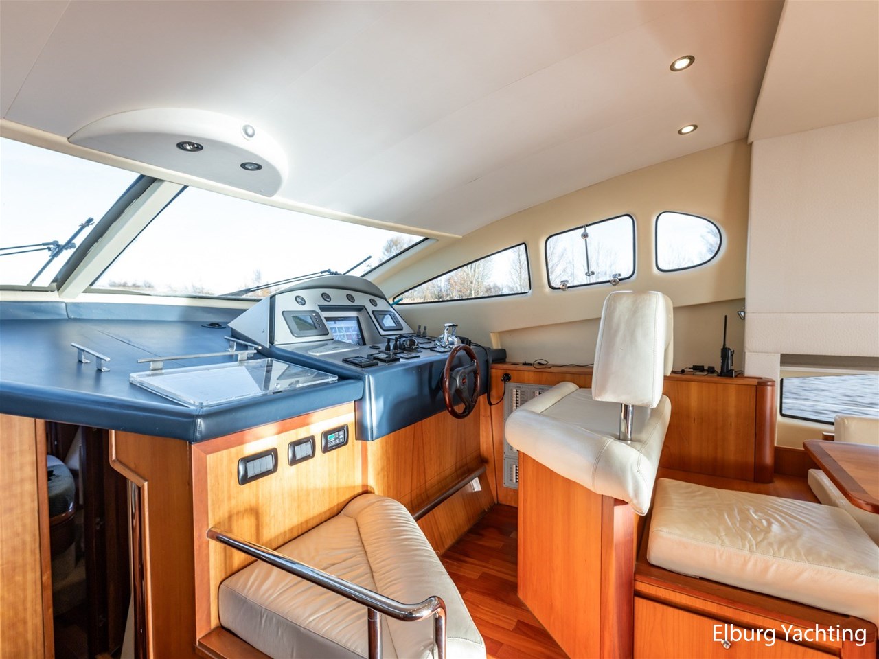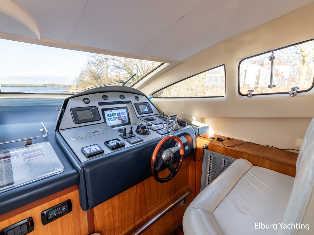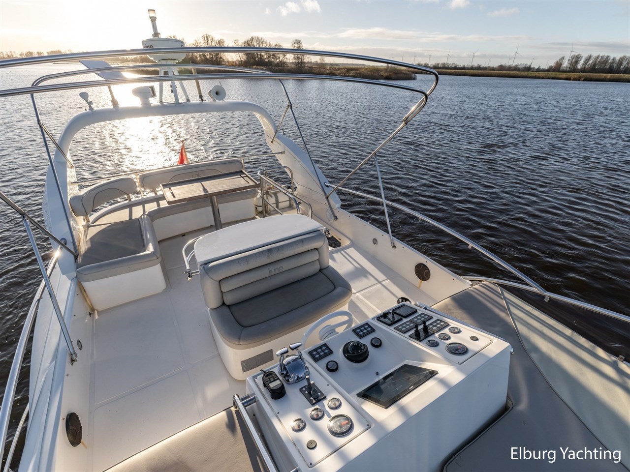 Deze Aicon 54 is een sportief gelijnd snelvarend motorjacht. Het schip heeft een ruime en open indeling, zo is de salon / dinette / stuurstand / kombuis met elkaar verbonden in een en dezelfde ruimte. Benedendeks bevinden zich de 3 x 2 persoons hutten en twee badkamers. Via de grote r.v.s. schuifpui is de binnenruimte met buiten te verbinden. In de kuip is een geïntegreerde kuipbank gesitueerd met bijbehorende kussens. In het achterschip bevindt er zich nog een 1 persoons crew cabin. Via een deur in de spiegel heb je toegang toe het brede zwemplateau, tevens kan hier een bijboot worden geplaatst welke met de hydraulisch gangway te water gelaten kan worden. Via een 'luie' trap vanuit de kuip bereik je de flybridge. De flybridge is van alle gemakken voorzien om hier overzichtelijk het schip te kunnen bedienen en hebben gasten alle comfort van een wetbar, zonnebed en volledige biminitop. Deze Aicon 54 genaamd 'June' is voorzien van: Volledige tent rondom achterdek met uitritsbare delen, 2 x elektrisch bedienbare lieren om het aanleggen te vergemakkelijken, groot afneembaar zonnebed op voordek, volledige kussenset voor open kuip en op flybridge, TV in salon op draaibare beugel, recent vernieuwde Raymarine navigatieapparatuur, de Hydronautica afstandsbediening maakt het aan- en afmeren kinderspel met een directe bediening voor de boeg-/hekschroef en motor(en) voor- en achteruit, wasmachine benedendeks, overzichtelijk elektrisch schakelpaneel, Caterpillar motormanagement displays. Volledig nieuw kunststof teakdek gelegd rondom en op de flybridge in 2026. Voor vragen en/of het maken van een afspraak bent u 7 dagen per week van harte welkom bij Elburg Yachting.
