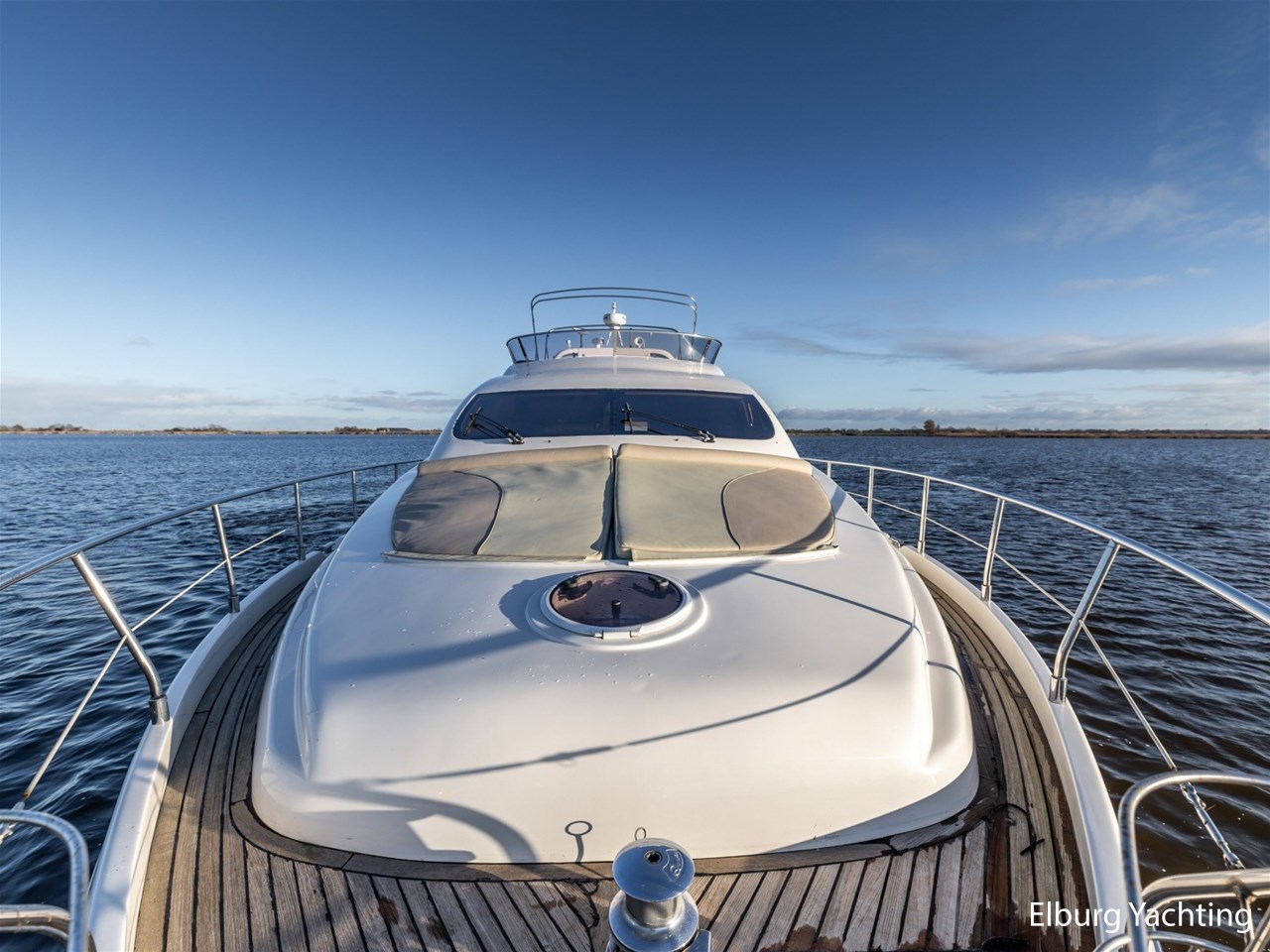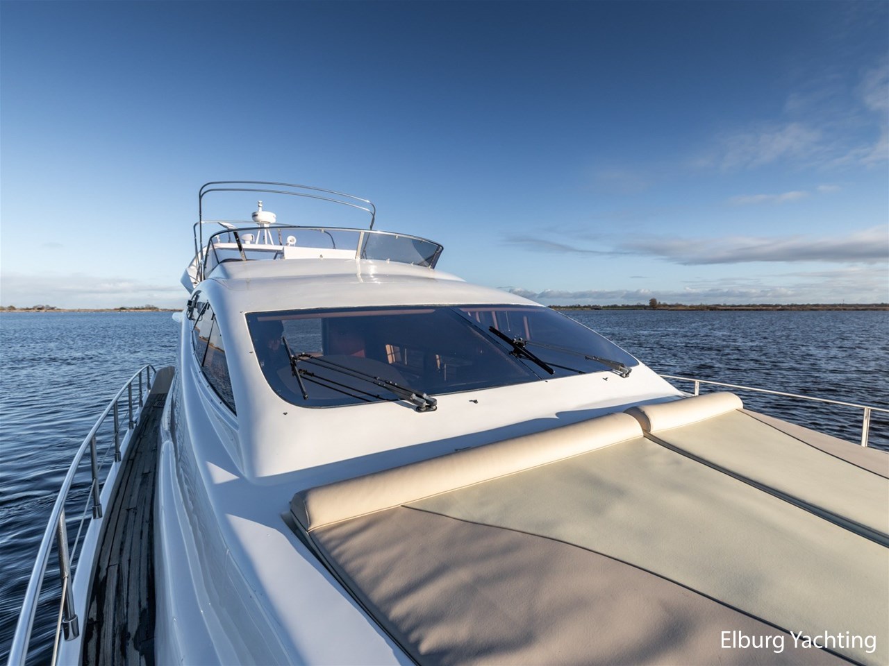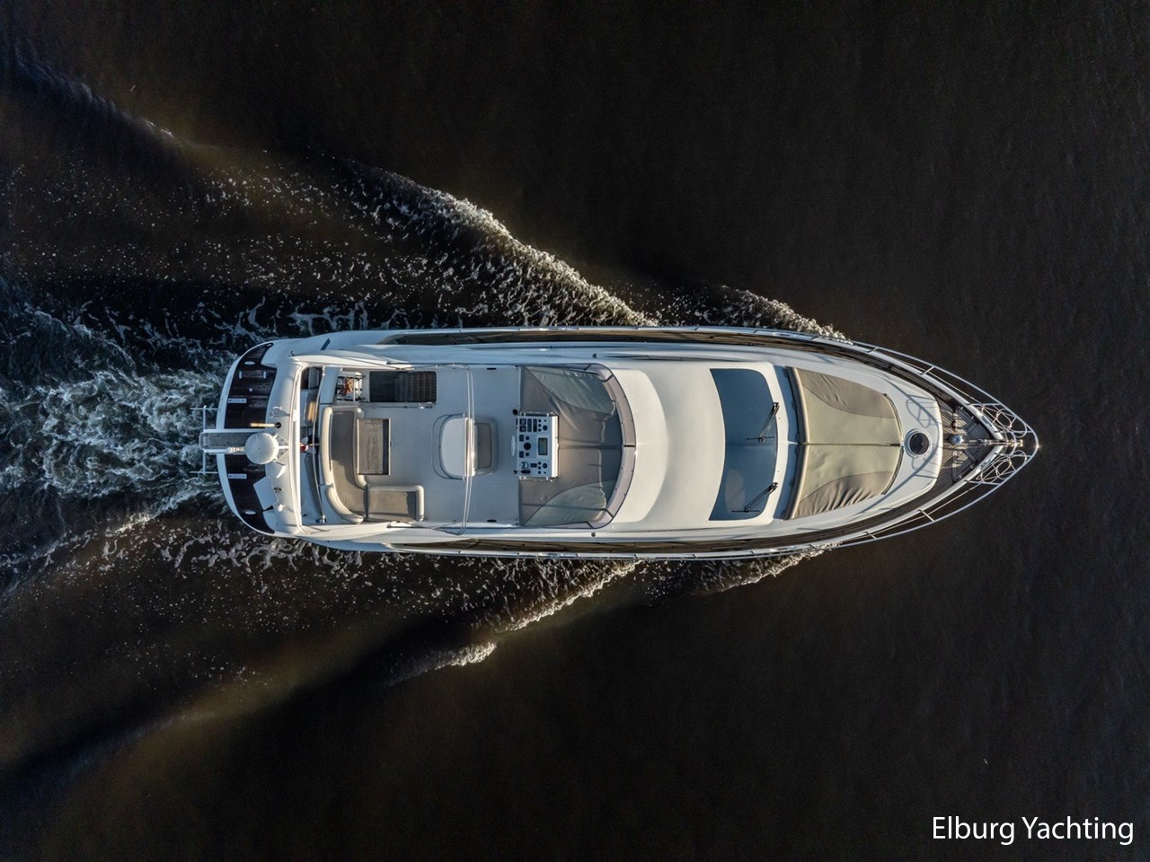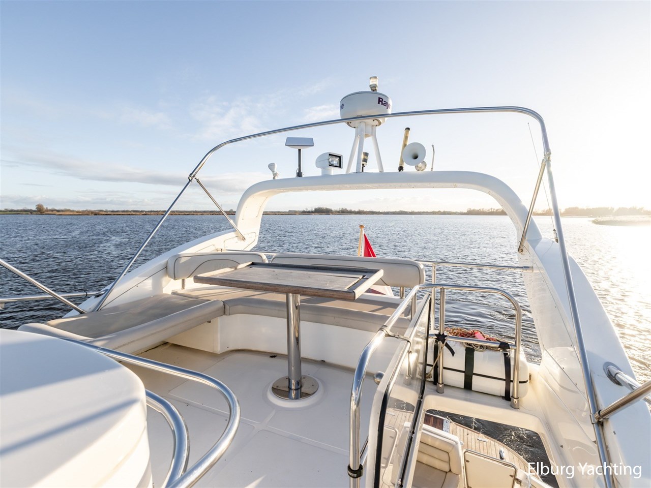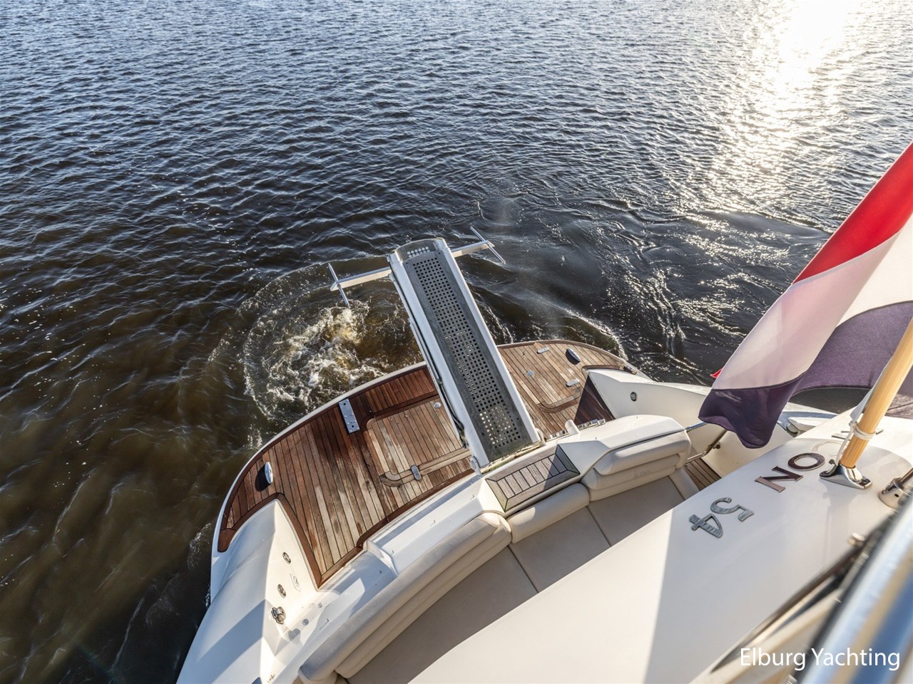 Deze Aicon 54 is een sportief gelijnd snelvarend motorjacht. Het schip heeft een ruime en open indeling, zo is de salon / dinette / stuurstand / kombuis met elkaar verbonden in een en dezelfde ruimte. Benedendeks bevinden zich de 3 x 2 persoons hutten en twee badkamers. Via de grote r.v.s. schuifpui is de binnenruimte met buiten te verbinden. In de kuip is een geïntegreerde kuipbank gesitueerd met bijbehorende kussens. In het achterschip bevindt er zich nog een 1 persoons crew cabin. Via een deur in de spiegel heb je toegang toe het brede zwemplateau, tevens kan hier een bijboot worden geplaatst welke met de hydraulisch gangway te water gelaten kan worden. Via een 'luie' trap vanuit de kuip bereik je de flybridge. De flybridge is van alle gemakken voorzien om hier overzichtelijk het schip te kunnen bedienen en hebben gasten alle comfort van een wetbar, zonnebed en volledige biminitop. Deze Aicon 54 genaamd 'June' is voorzien van: Volledige tent rondom achterdek met uitritsbare delen, 2 x elektrisch bedienbare lieren om het aanleggen te vergemakkelijken, groot afneembaar zonnebed op voordek, volledige kussenset voor open kuip en op flybridge, TV in salon op draaibare beugel, recent vernieuwde Raymarine navigatieapparatuur, de Hydronautica afstandsbediening maakt het aan- en afmeren kinderspel met een directe bediening voor de boeg-/hekschroef en motor(en) voor- en achteruit, wasmachine benedendeks, overzichtelijk elektrisch schakelpaneel, Caterpillar motormanagement displays. Volledig nieuw kunststof teakdek gelegd rondom en op de flybridge in 2026. Voor vragen en/of het maken van een afspraak bent u 7 dagen per week van harte welkom bij Elburg Yachting.