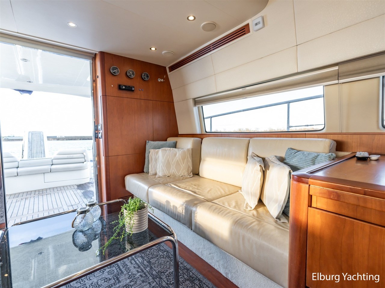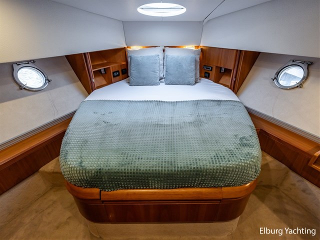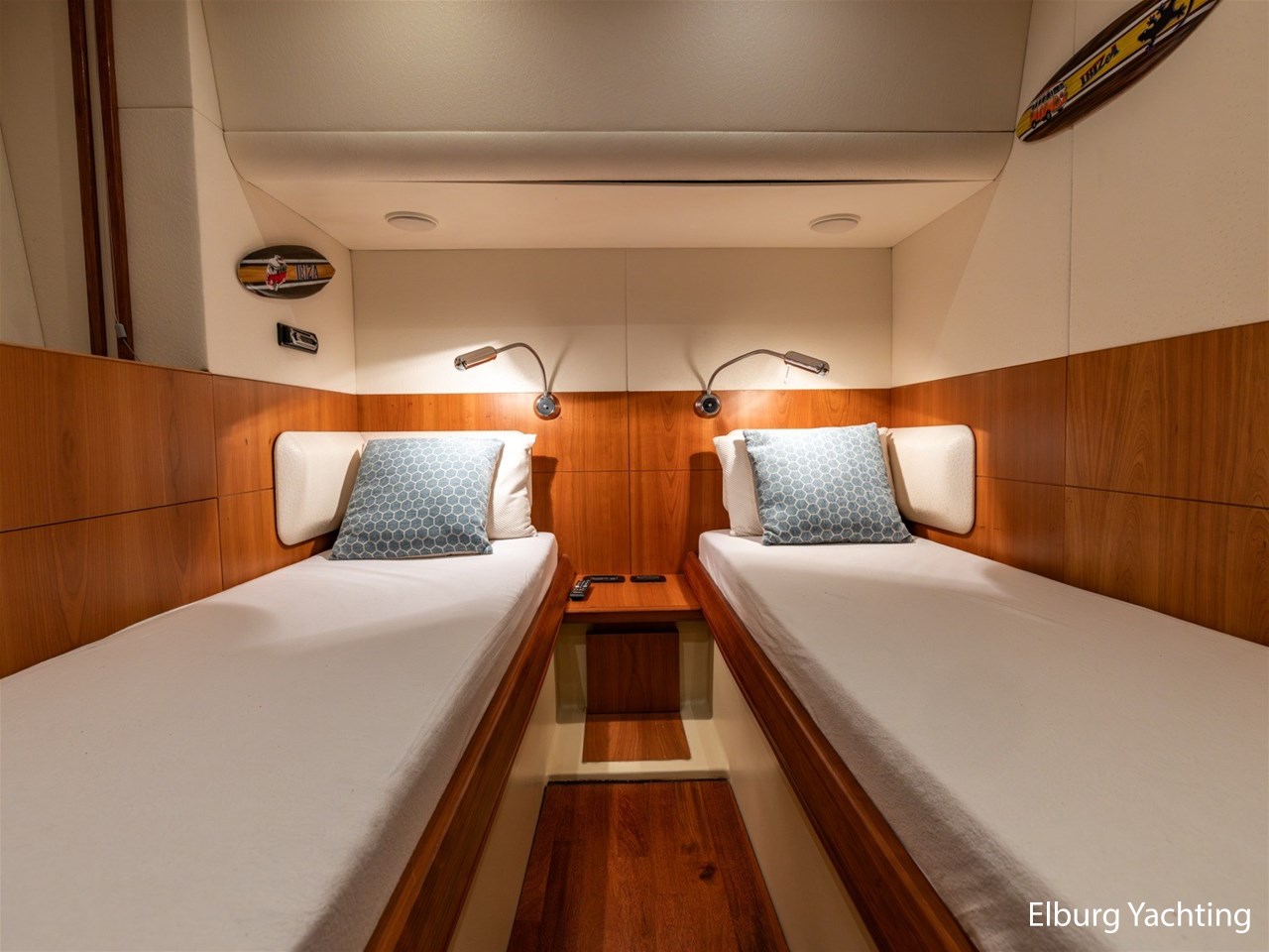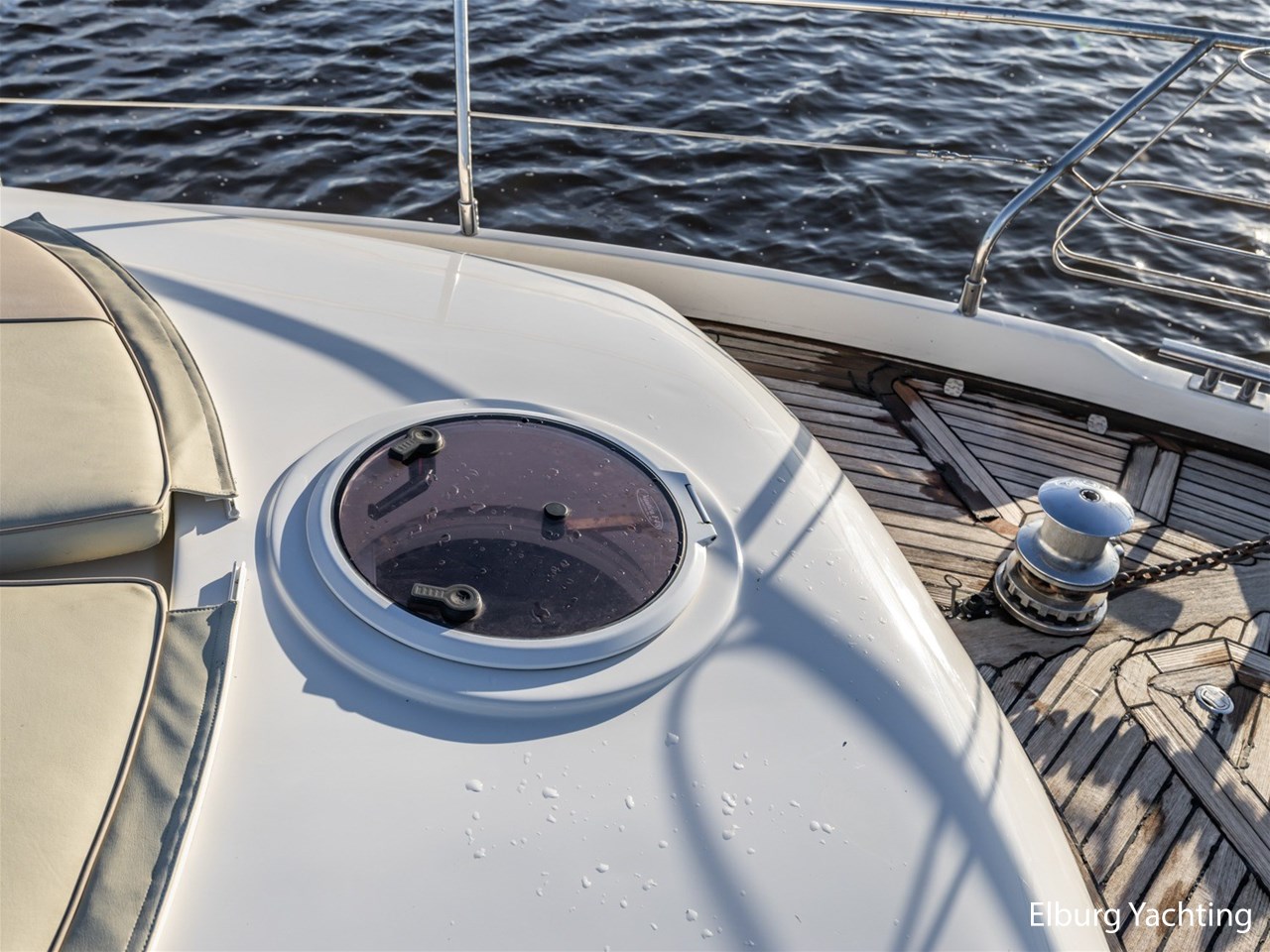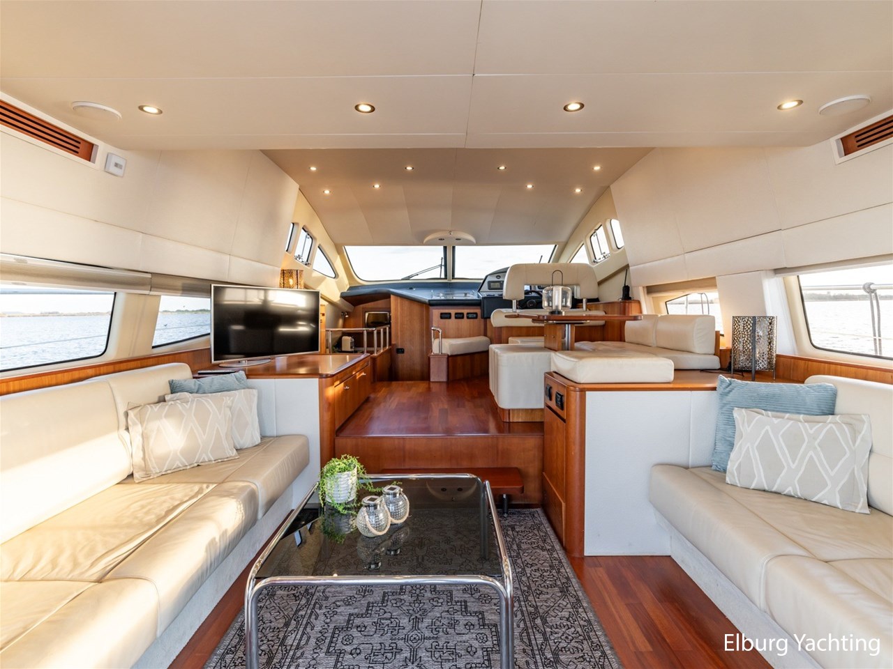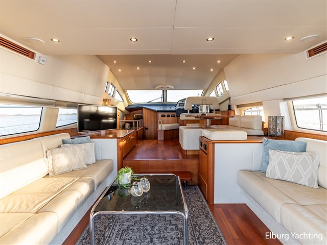 Deze Aicon 54 is een sportief gelijnd snelvarend motorjacht. Het schip heeft een ruime en open indeling, zo is de salon / dinette / stuurstand / kombuis met elkaar verbonden in een en dezelfde ruimte. Benedendeks bevinden zich de 3 x 2 persoons hutten en twee badkamers. Via de grote r.v.s. schuifpui is de binnenruimte met buiten te verbinden. In de kuip is een geïntegreerde kuipbank gesitueerd met bijbehorende kussens. In het achterschip bevindt er zich nog een 1 persoons crew cabin. Via een deur in de spiegel heb je toegang toe het brede zwemplateau, tevens kan hier een bijboot worden geplaatst welke met de hydraulisch gangway te water gelaten kan worden. Via een 'luie' trap vanuit de kuip bereik je de flybridge. De flybridge is van alle gemakken voorzien om hier overzichtelijk het schip te kunnen bedienen en hebben gasten alle comfort van een wetbar, zonnebed en volledige biminitop. Deze Aicon 54 genaamd 'June' is voorzien van: Volledige tent rondom achterdek met uitritsbare delen, 2 x elektrisch bedienbare lieren om het aanleggen te vergemakkelijken, groot afneembaar zonnebed op voordek, volledige kussenset voor open kuip en op flybridge, TV in salon op draaibare beugel, recent vernieuwde Raymarine navigatieapparatuur, de Hydronautica afstandsbediening maakt het aan- en afmeren kinderspel met een directe bediening voor de boeg-/hekschroef en motor(en) voor- en achteruit, wasmachine benedendeks, overzichtelijk elektrisch schakelpaneel, Caterpillar motormanagement displays. Volledig nieuw kunststof teakdek gelegd rondom en op de flybridge in 2026. Voor vragen en/of het maken van een afspraak bent u 7 dagen per week van harte welkom bij Elburg Yachting.