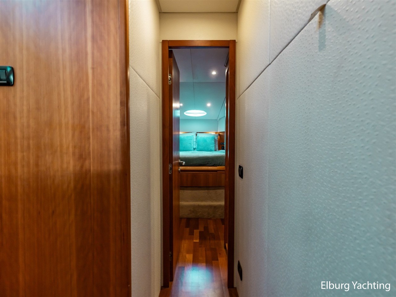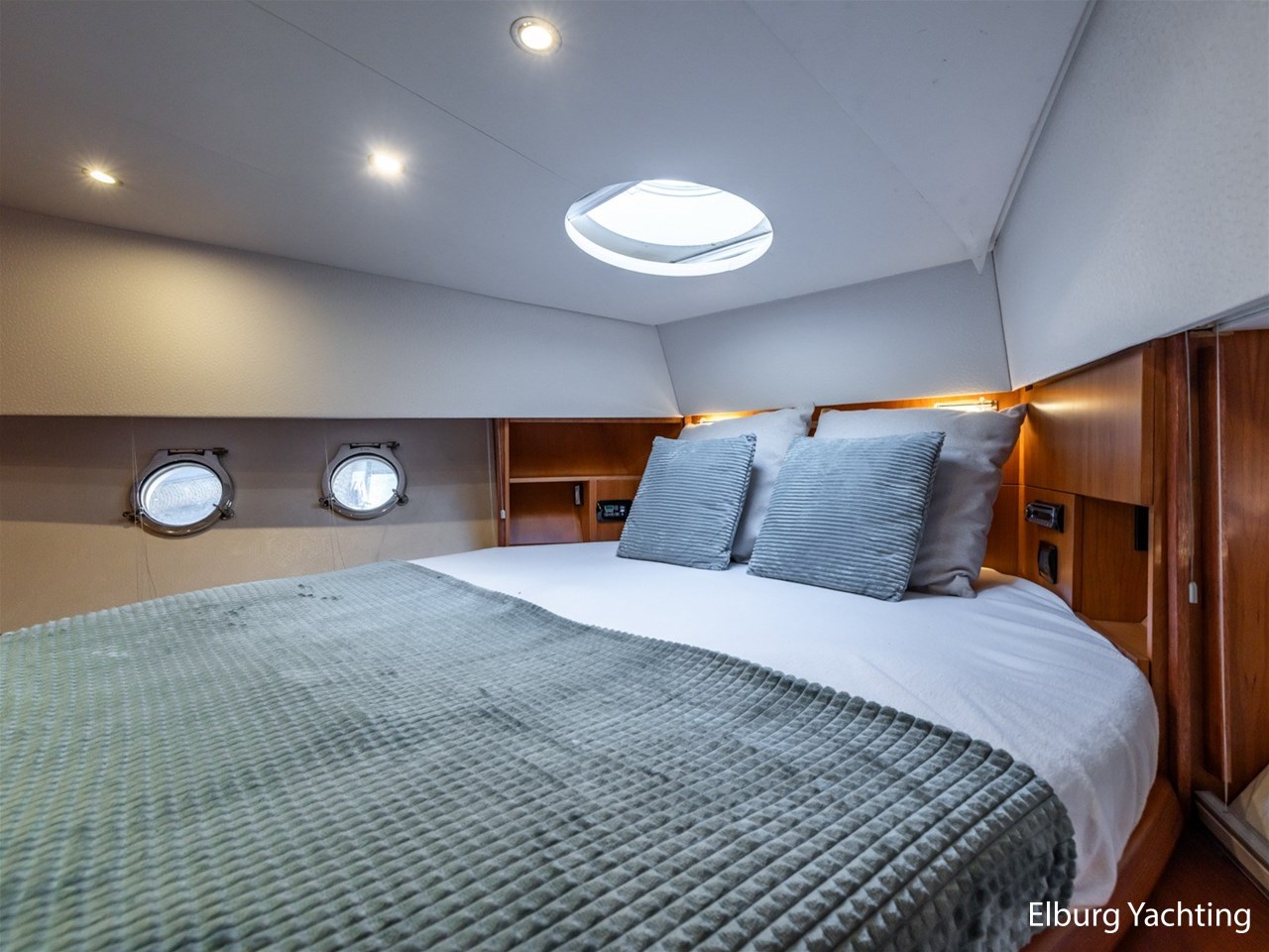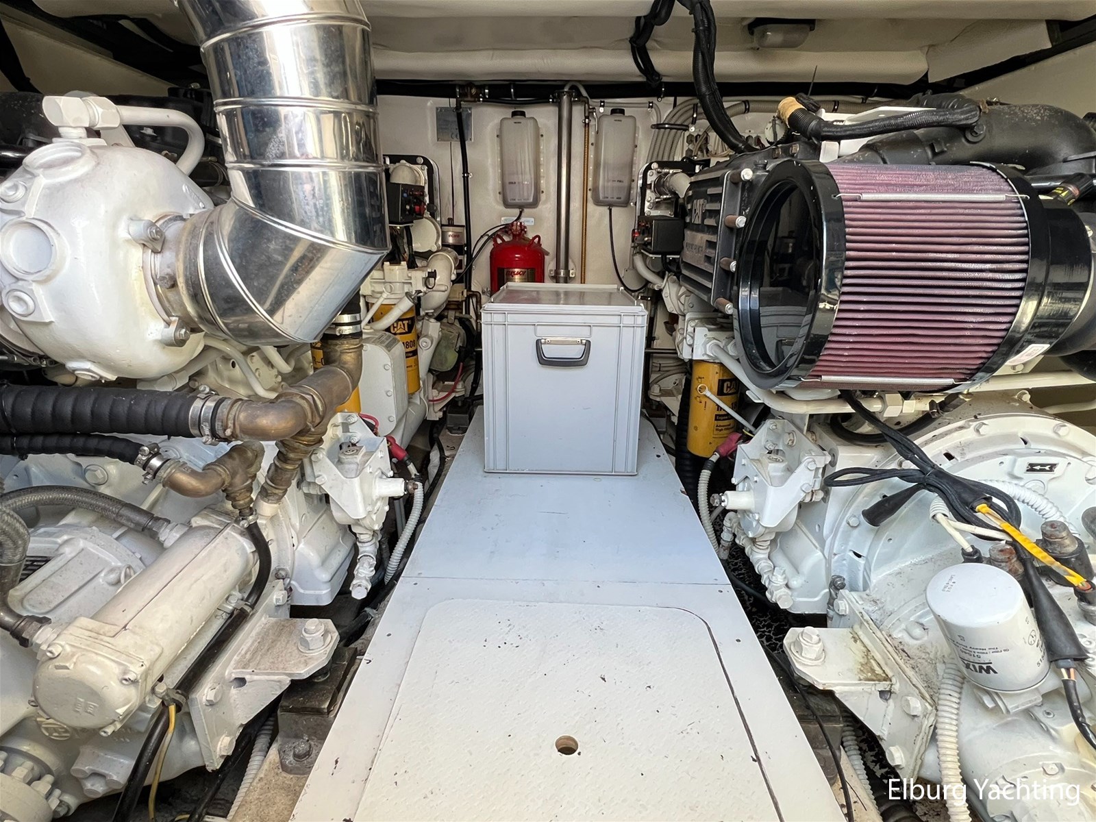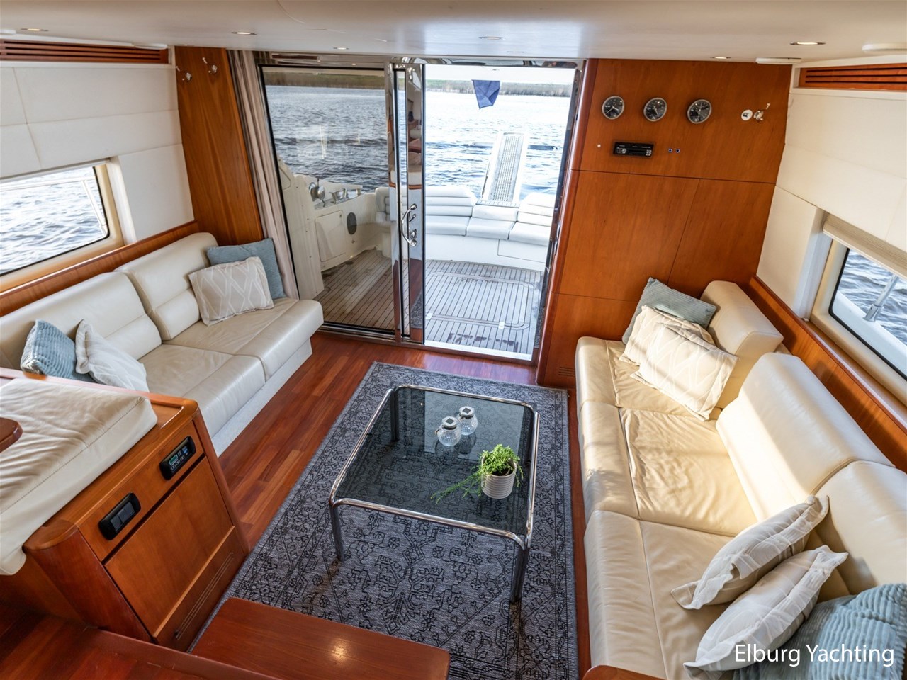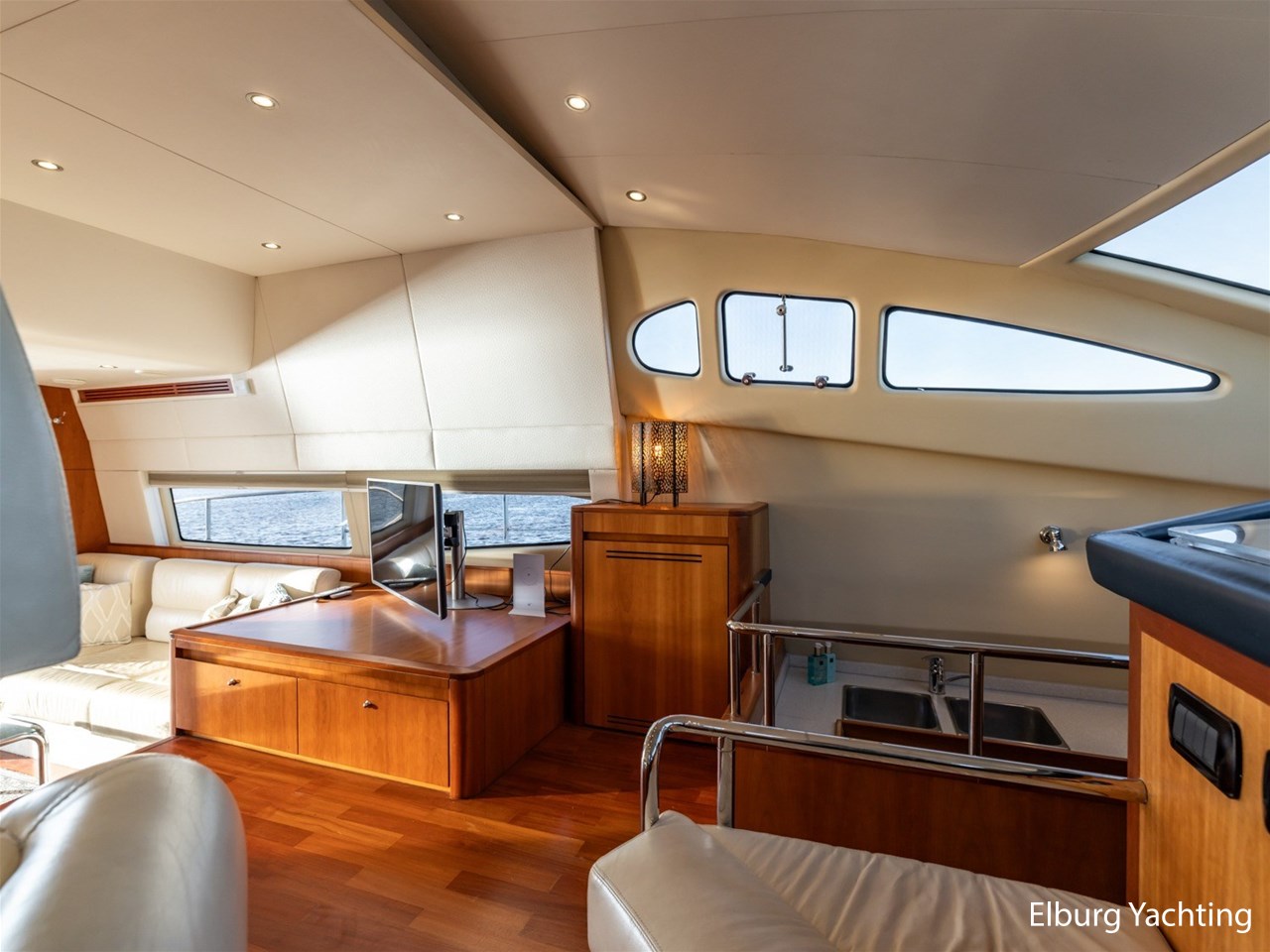 Deze Aicon 54 is een sportief gelijnd snelvarend motorjacht. Het schip heeft een ruime en open indeling, zo is de salon / dinette / stuurstand / kombuis met elkaar verbonden in een en dezelfde ruimte. Benedendeks bevinden zich de 3 x 2 persoons hutten en twee badkamers. Via de grote r.v.s. schuifpui is de binnenruimte met buiten te verbinden. In de kuip is een geïntegreerde kuipbank gesitueerd met bijbehorende kussens. In het achterschip bevindt er zich nog een 1 persoons crew cabin. Via een deur in de spiegel heb je toegang toe het brede zwemplateau, tevens kan hier een bijboot worden geplaatst welke met de hydraulisch gangway te water gelaten kan worden. Via een 'luie' trap vanuit de kuip bereik je de flybridge. De flybridge is van alle gemakken voorzien om hier overzichtelijk het schip te kunnen bedienen en hebben gasten alle comfort van een wetbar, zonnebed en volledige biminitop. Deze Aicon 54 genaamd 'June' is voorzien van: Volledige tent rondom achterdek met uitritsbare delen, 2 x elektrisch bedienbare lieren om het aanleggen te vergemakkelijken, groot afneembaar zonnebed op voordek, volledige kussenset voor open kuip en op flybridge, TV in salon op draaibare beugel, recent vernieuwde Raymarine navigatieapparatuur, de Hydronautica afstandsbediening maakt het aan- en afmeren kinderspel met een directe bediening voor de boeg-/hekschroef en motor(en) voor- en achteruit, wasmachine benedendeks, overzichtelijk elektrisch schakelpaneel, Caterpillar motormanagement displays. Volledig nieuw kunststof teakdek gelegd rondom en op de flybridge in 2026. Voor vragen en/of het maken van een afspraak bent u 7 dagen per week van harte welkom bij Elburg Yachting.