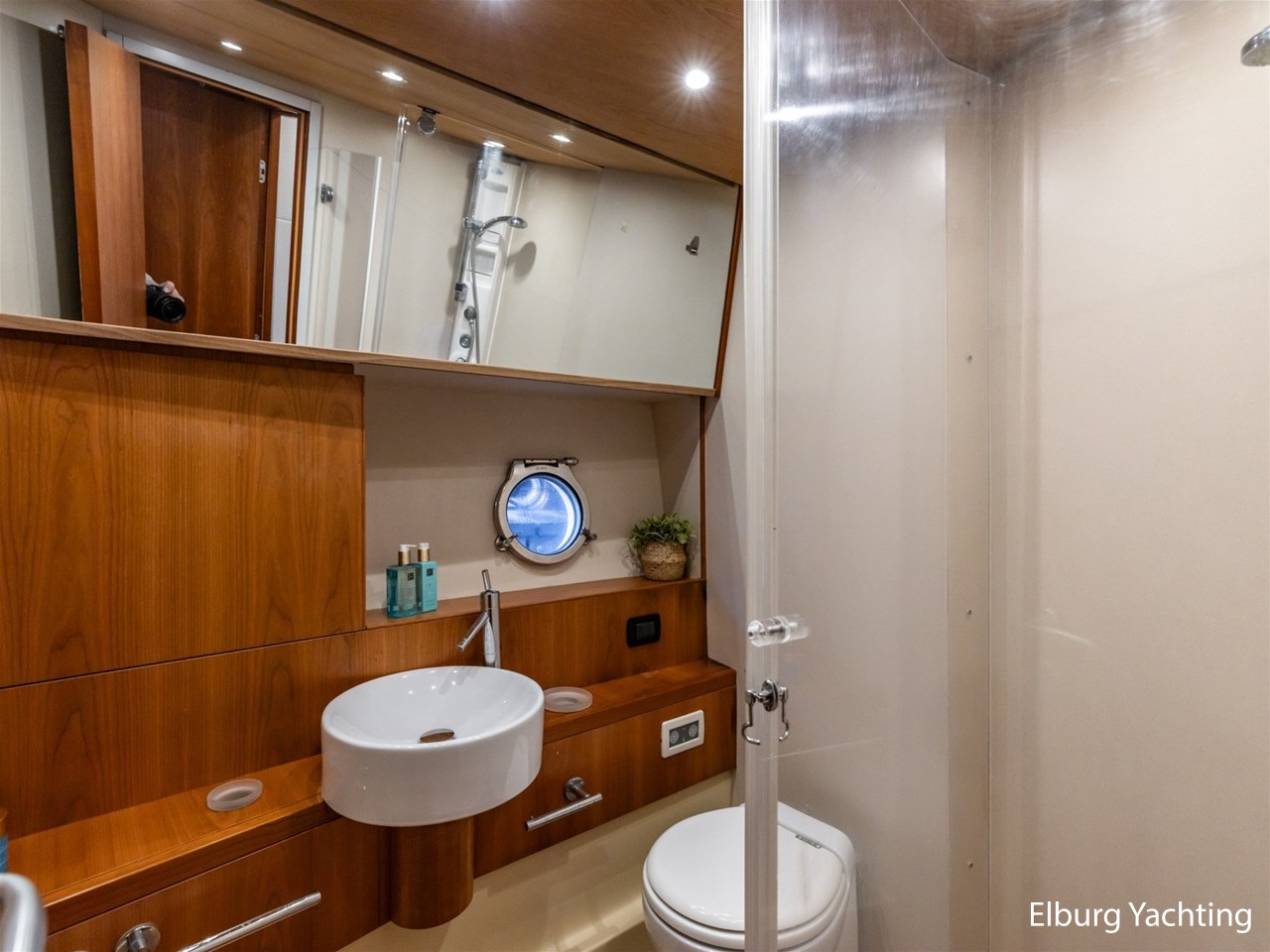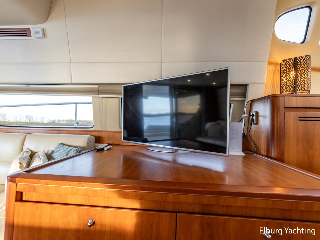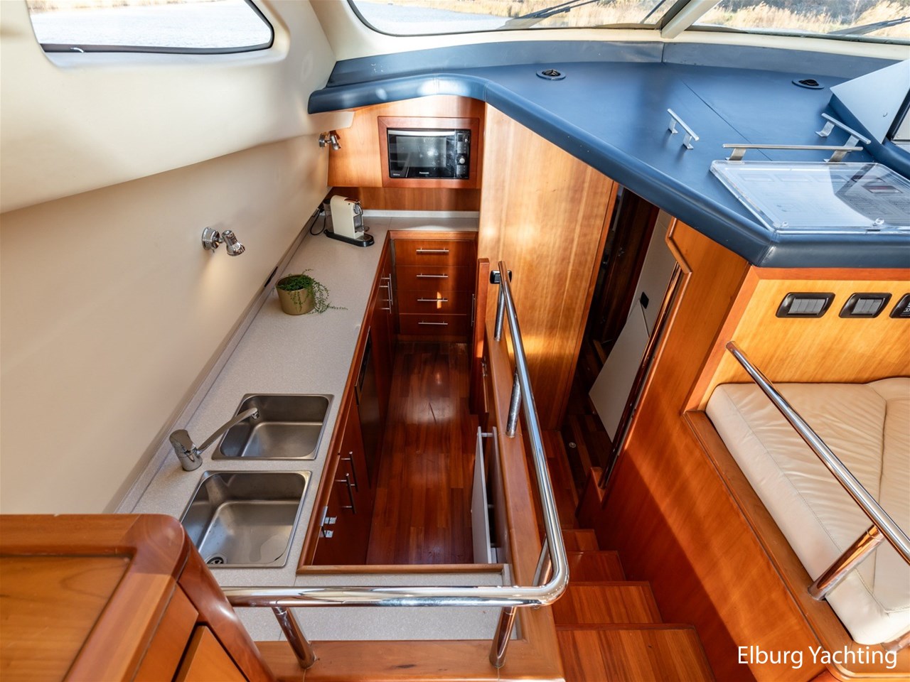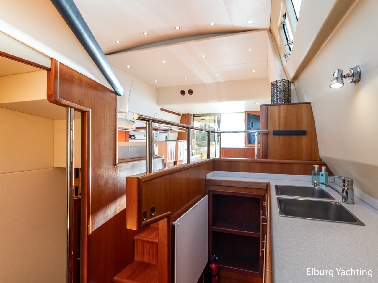 Deze Aicon 54 is een sportief gelijnd snelvarend motorjacht. Het schip heeft een ruime en open indeling, zo is de salon / dinette / stuurstand / kombuis met elkaar verbonden in een en dezelfde ruimte. Benedendeks bevinden zich de 3 x 2 persoons hutten en twee badkamers. Via de grote r.v.s. schuifpui is de binnenruimte met buiten te verbinden. In de kuip is een geïntegreerde kuipbank gesitueerd met bijbehorende kussens. In het achterschip bevindt er zich nog een 1 persoons crew cabin. Via een deur in de spiegel heb je toegang toe het brede zwemplateau, tevens kan hier een bijboot worden geplaatst welke met de hydraulisch gangway te water gelaten kan worden. Via een 'luie' trap vanuit de kuip bereik je de flybridge. De flybridge is van alle gemakken voorzien om hier overzichtelijk het schip te kunnen bedienen en hebben gasten alle comfort van een wetbar, zonnebed en volledige biminitop. Deze Aicon 54 genaamd 'June' is voorzien van: Volledige tent rondom achterdek met uitritsbare delen, 2 x elektrisch bedienbare lieren om het aanleggen te vergemakkelijken, groot afneembaar zonnebed op voordek, volledige kussenset voor open kuip en op flybridge, TV in salon op draaibare beugel, recent vernieuwde Raymarine navigatieapparatuur, de Hydronautica afstandsbediening maakt het aan- en afmeren kinderspel met een directe bediening voor de boeg-/hekschroef en motor(en) voor- en achteruit, wasmachine benedendeks, overzichtelijk elektrisch schakelpaneel, Caterpillar motormanagement displays. Volledig nieuw kunststof teakdek gelegd rondom en op de flybridge in 2026. Voor vragen en/of het maken van een afspraak bent u 7 dagen per week van harte welkom bij Elburg Yachting.