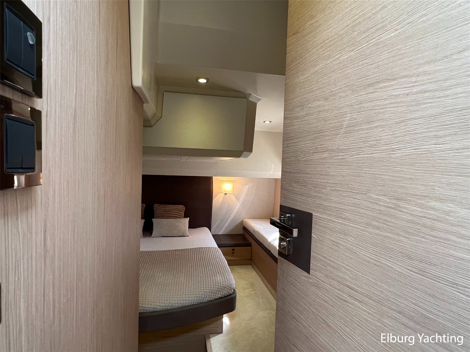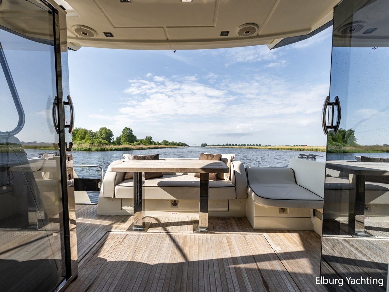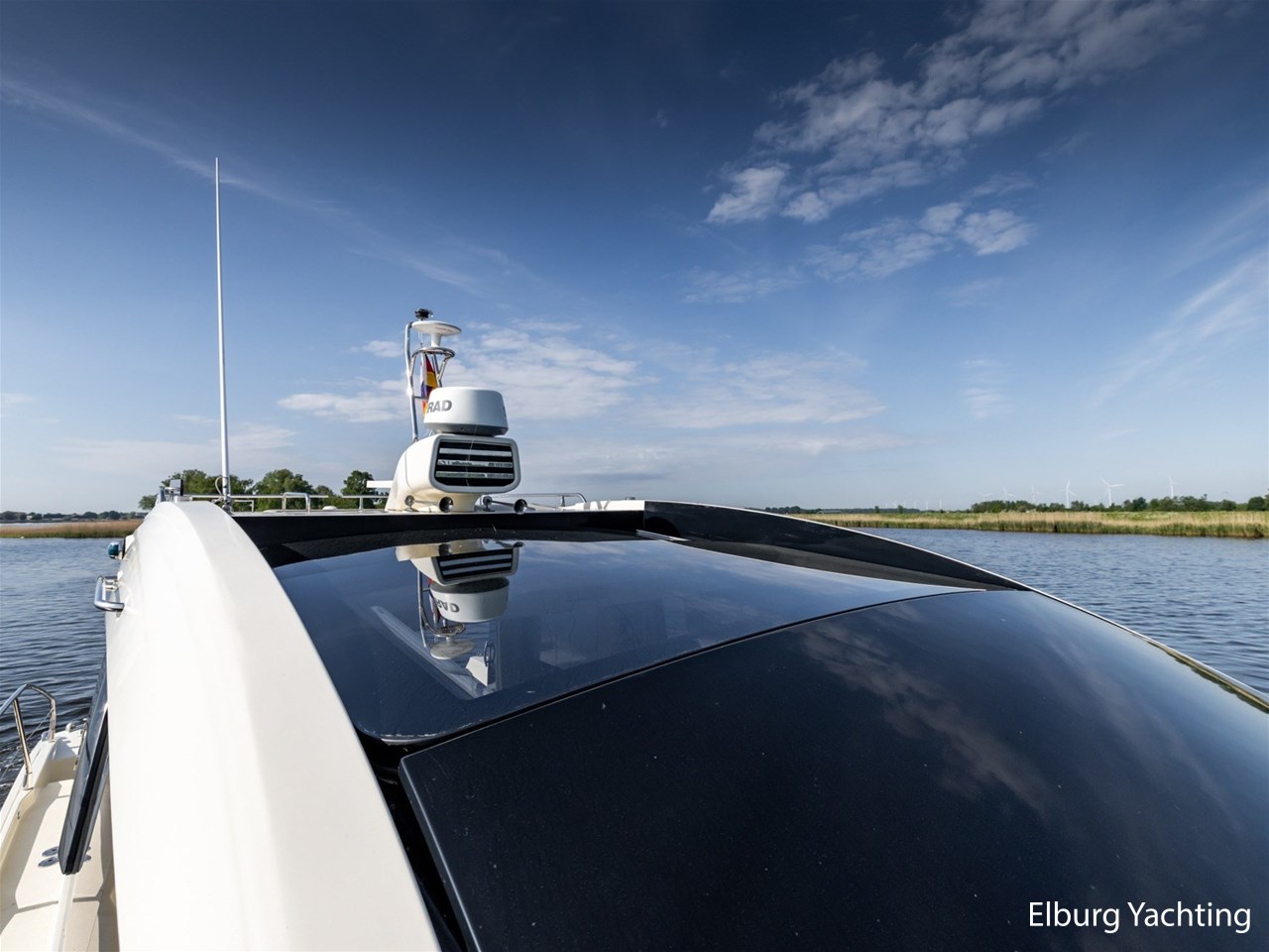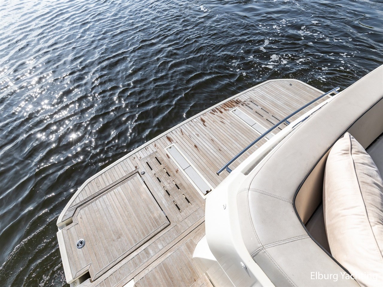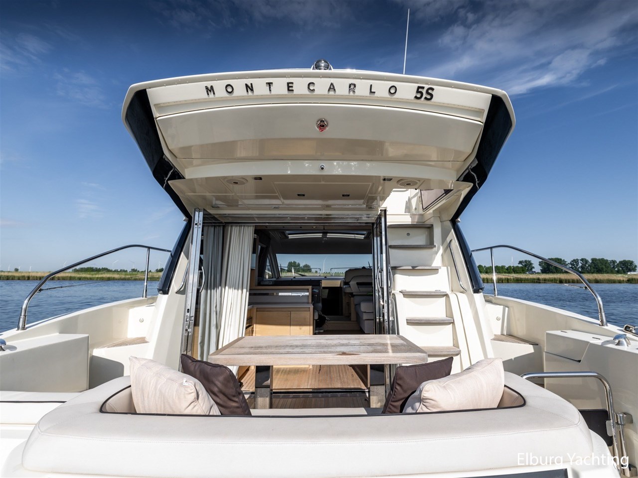 Zeer compleet uitgevoerde Monte Carlo 5S. De 5S-serie onderscheidt zich door stoere en sportieve looks en een hardtop met een buitenlounge op het dak. Vanaf het hydraulisch beweegbare zwemplateau wordt de open kuip betreden. De kuip heeft een geïntegreerde bank met bijbehorende kussens en vaste tafel. Aan SB zijde in de kuip bevindt zich de toegang tot de extra hut (crew cabin) in het achterschip, deze hut is tevens te gebruiken als extra opbergruimte. Via de open kuip stap je eenvoudig op naar het gangboord met goede houvast rondom voor een veilige loop over het dek. Op het voordek zijn twee geïntegreerde klapbare zonnebedden aanwezig. Via een geïntegreerde trap vanuit de kuip betreed je de buitenlounge op het dak. Deze buitenlounge heeft een in hoogte verstelbare tafel waarmee er ook een groot zonnebed gecreëerd kan worden. De salon en de kuip laten zich verbinden door drie grote glazen wegklapbare deuren. De kombuis is gesitueerd bij de ingang van de salon. Door het openen van de salondeuren wordt de kombuis volledig betrokken bij de kuip. De salon gecombineerd met de stuurstand bevindt zich op dekniveau. Via de de grote ramen rondom (getint) is er goed zicht en komt er veel licht binnen. Het buitengevoel naar binnen brengen kan door het openen van het grote elektrisch bedienbare schuifdak en twee zijruiten. Benedendeks bevinden zich drie hutten voor in totaal zes personen. De 2-persoons eigenaarshut bevindt zich midscheeps over de volledige breedte van het schip. Deze hut is voorzien van eigen sanitair en-suite. Aan stuurboordzijde bevindt zich een 1 x 2 persoons stapelbed en in de voorhut een 2-persoons Frans bed. Centraal is er een tweede badkamer met douche en toilet gesitueerd. Deze Monte Carlo 5S is verder voorzien van: achteruitkijk camera via plotterscherm, elektrisch bedienbare gangway, kuip afsluitbaar met deur naar zwemplateau, TV op lift in salon, Volvo ship/motormanagement display bij stuurstand, Fusion audiosysteem, trimtabs, Yachtcontroller afstandsbediening om te manoeuvreren middels de IPS aandrijving + boegschroef. Voor vragen en/of het maken van een afspraak bent u 7 dagen per week van harte welkom bij Elburg Yachting.
