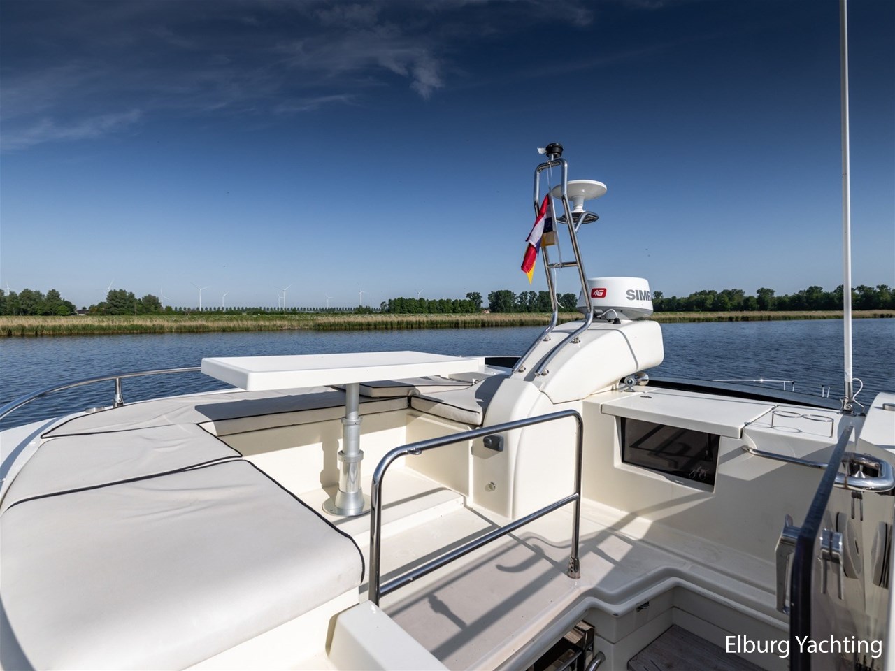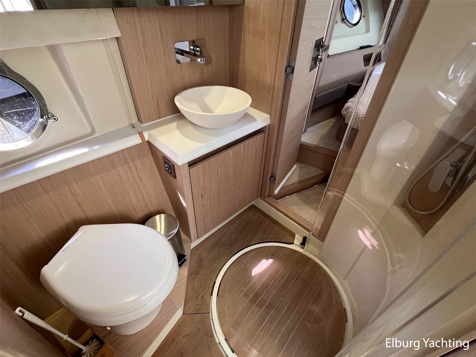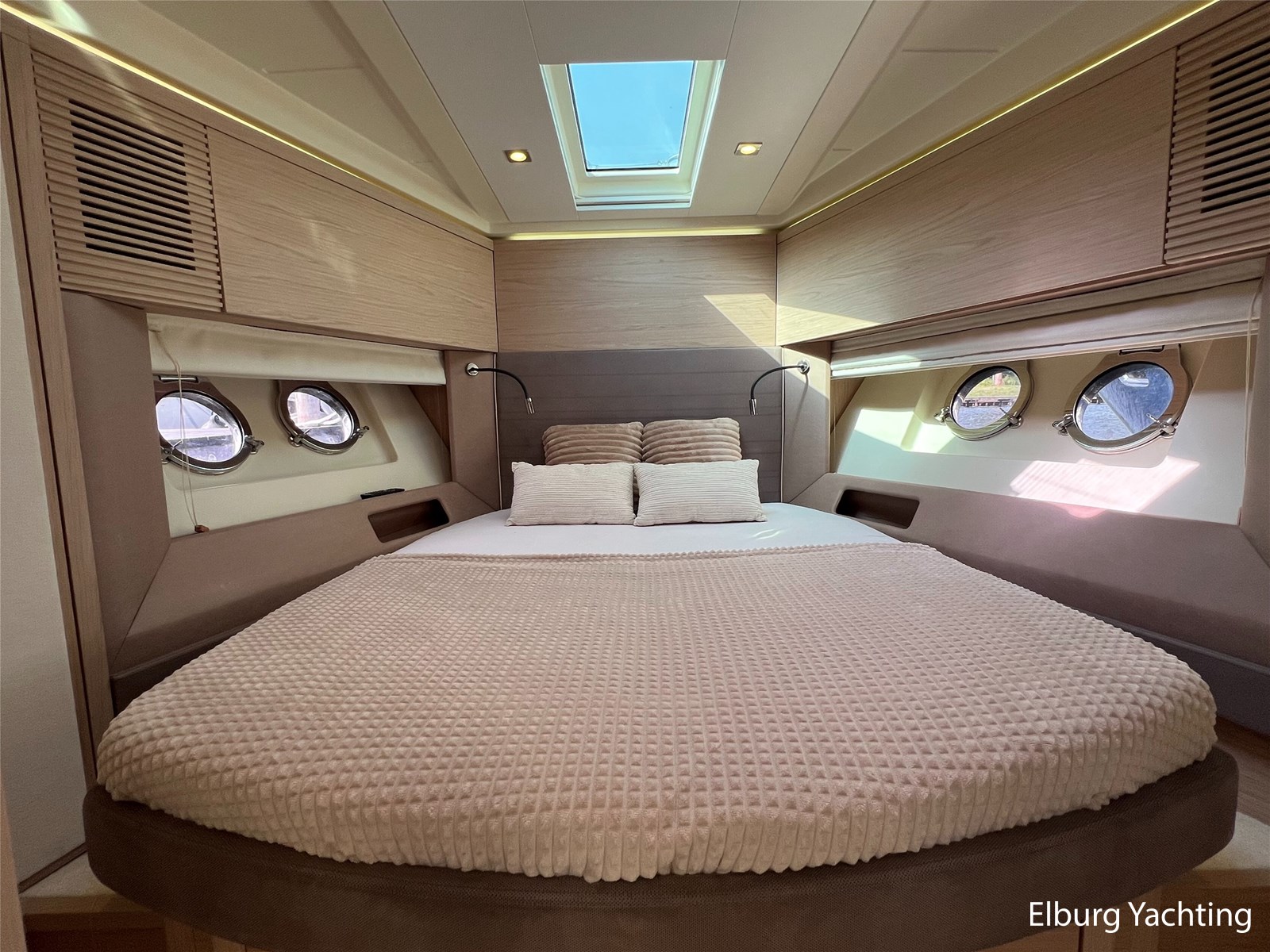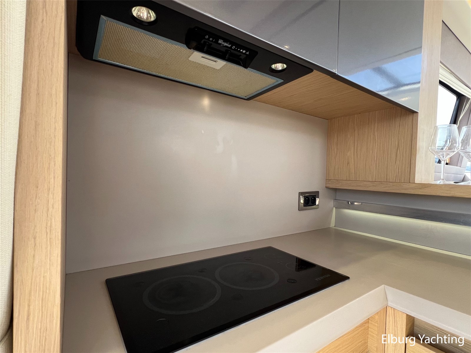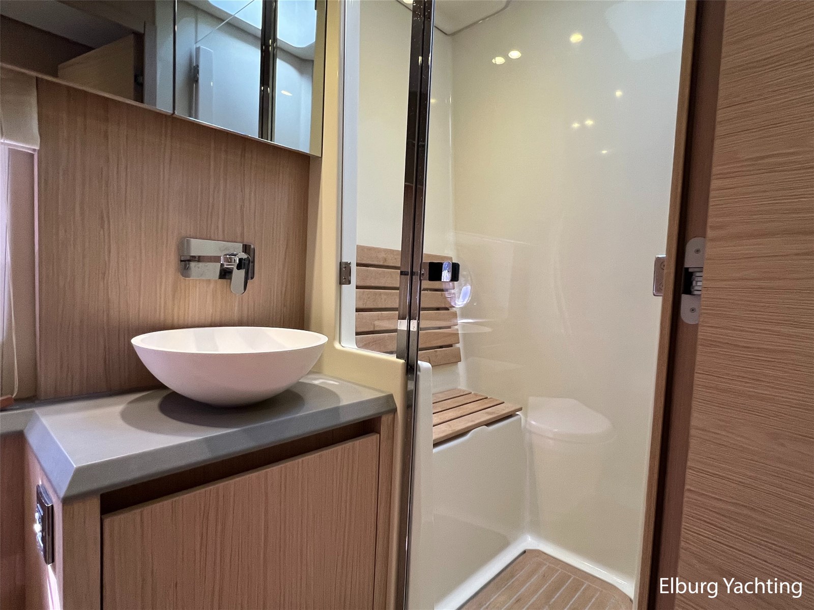 Zeer compleet uitgevoerde Monte Carlo 5S. De 5S-serie onderscheidt zich door stoere en sportieve looks en een hardtop met een buitenlounge op het dak. Vanaf het hydraulisch beweegbare zwemplateau wordt de open kuip betreden. De kuip heeft een geïntegreerde bank met bijbehorende kussens en vaste tafel. Aan SB zijde in de kuip bevindt zich de toegang tot de extra hut (crew cabin) in het achterschip, deze hut is tevens te gebruiken als extra opbergruimte. Via de open kuip stap je eenvoudig op naar het gangboord met goede houvast rondom voor een veilige loop over het dek. Op het voordek zijn twee geïntegreerde klapbare zonnebedden aanwezig. Via een geïntegreerde trap vanuit de kuip betreed je de buitenlounge op het dak. Deze buitenlounge heeft een in hoogte verstelbare tafel waarmee er ook een groot zonnebed gecreëerd kan worden. De salon en de kuip laten zich verbinden door drie grote glazen wegklapbare deuren. De kombuis is gesitueerd bij de ingang van de salon. Door het openen van de salondeuren wordt de kombuis volledig betrokken bij de kuip. De salon gecombineerd met de stuurstand bevindt zich op dekniveau. Via de de grote ramen rondom (getint) is er goed zicht en komt er veel licht binnen. Het buitengevoel naar binnen brengen kan door het openen van het grote elektrisch bedienbare schuifdak en twee zijruiten. Benedendeks bevinden zich drie hutten voor in totaal zes personen. De 2-persoons eigenaarshut bevindt zich midscheeps over de volledige breedte van het schip. Deze hut is voorzien van eigen sanitair en-suite. Aan stuurboordzijde bevindt zich een 1 x 2 persoons stapelbed en in de voorhut een 2-persoons Frans bed. Centraal is er een tweede badkamer met douche en toilet gesitueerd. Deze Monte Carlo 5S is verder voorzien van: achteruitkijk camera via plotterscherm, elektrisch bedienbare gangway, kuip afsluitbaar met deur naar zwemplateau, TV op lift in salon, Volvo ship/motormanagement display bij stuurstand, Fusion audiosysteem, trimtabs, Yachtcontroller afstandsbediening om te manoeuvreren middels de IPS aandrijving + boegschroef. Voor vragen en/of het maken van een afspraak bent u 7 dagen per week van harte welkom bij Elburg Yachting.