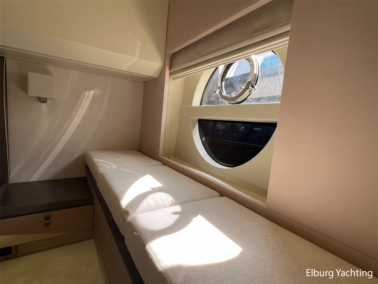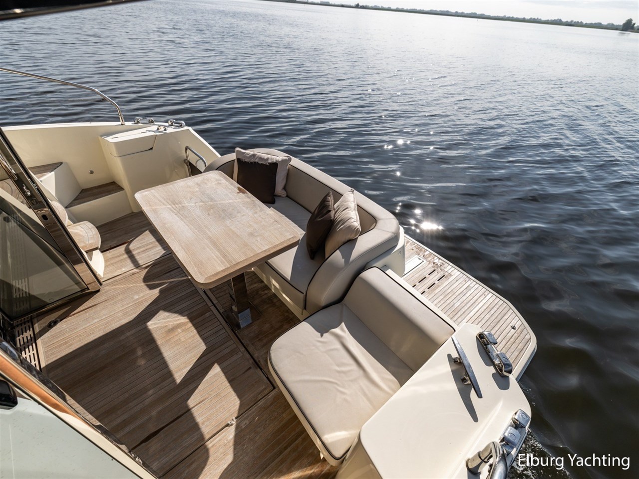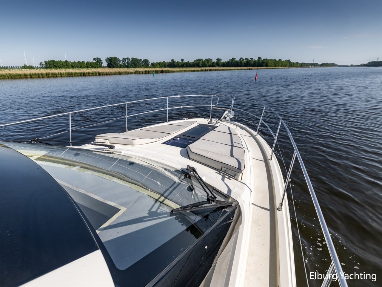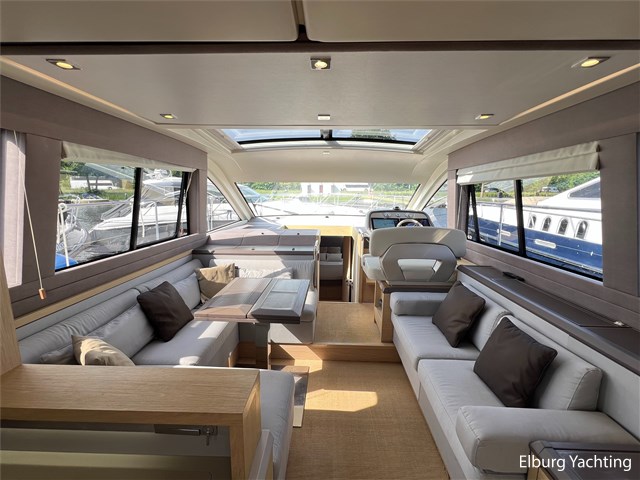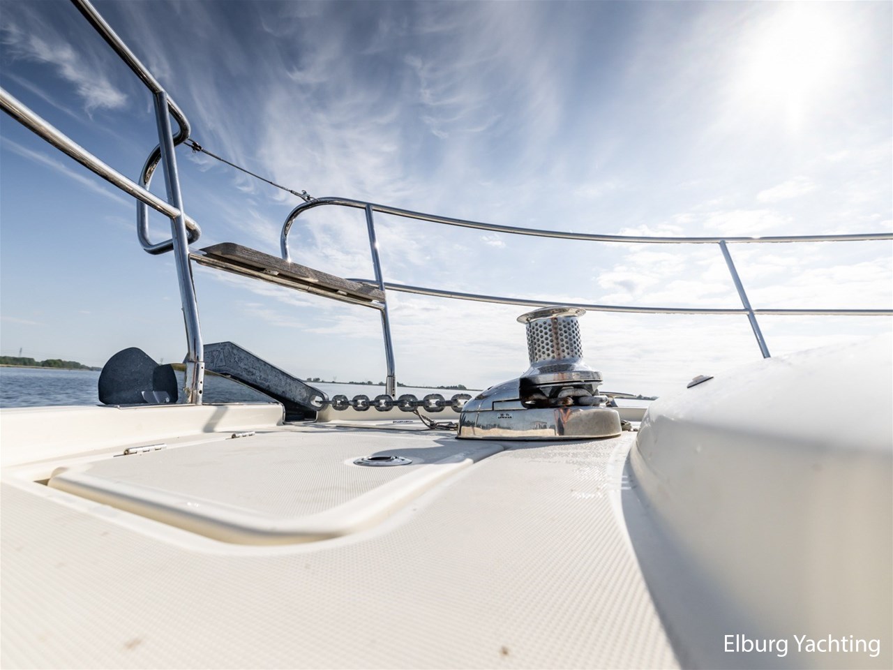 Zeer compleet uitgevoerde Monte Carlo 5S. De 5S-serie onderscheidt zich door stoere en sportieve looks en een hardtop met een buitenlounge op het dak. Vanaf het hydraulisch beweegbare zwemplateau wordt de open kuip betreden. De kuip heeft een geïntegreerde bank met bijbehorende kussens en vaste tafel. Aan SB zijde in de kuip bevindt zich de toegang tot de extra hut (crew cabin) in het achterschip, deze hut is tevens te gebruiken als extra opbergruimte. Via de open kuip stap je eenvoudig op naar het gangboord met goede houvast rondom voor een veilige loop over het dek. Op het voordek zijn twee geïntegreerde klapbare zonnebedden aanwezig. Via een geïntegreerde trap vanuit de kuip betreed je de buitenlounge op het dak. Deze buitenlounge heeft een in hoogte verstelbare tafel waarmee er ook een groot zonnebed gecreëerd kan worden. De salon en de kuip laten zich verbinden door drie grote glazen wegklapbare deuren. De kombuis is gesitueerd bij de ingang van de salon. Door het openen van de salondeuren wordt de kombuis volledig betrokken bij de kuip. De salon gecombineerd met de stuurstand bevindt zich op dekniveau. Via de de grote ramen rondom (getint) is er goed zicht en komt er veel licht binnen. Het buitengevoel naar binnen brengen kan door het openen van het grote elektrisch bedienbare schuifdak en twee zijruiten. Benedendeks bevinden zich drie hutten voor in totaal zes personen. De 2-persoons eigenaarshut bevindt zich midscheeps over de volledige breedte van het schip. Deze hut is voorzien van eigen sanitair en-suite. Aan stuurboordzijde bevindt zich een 1 x 2 persoons stapelbed en in de voorhut een 2-persoons Frans bed. Centraal is er een tweede badkamer met douche en toilet gesitueerd. Deze Monte Carlo 5S is verder voorzien van: achteruitkijk camera via plotterscherm, elektrisch bedienbare gangway, kuip afsluitbaar met deur naar zwemplateau, TV op lift in salon, Volvo ship/motormanagement display bij stuurstand, Fusion audiosysteem, trimtabs, Yachtcontroller afstandsbediening om te manoeuvreren middels de IPS aandrijving + boegschroef. Voor vragen en/of het maken van een afspraak bent u 7 dagen per week van harte welkom bij Elburg Yachting.