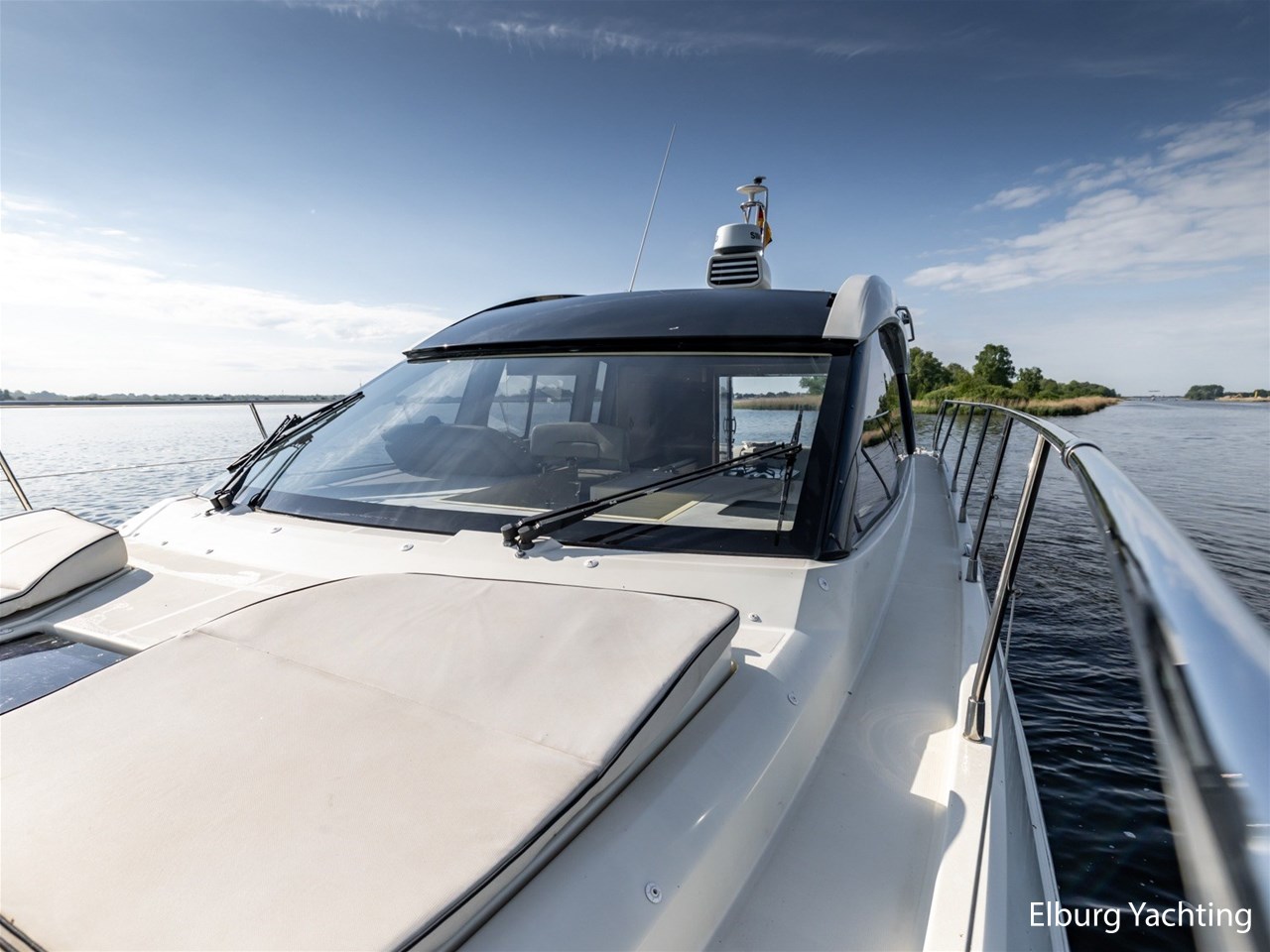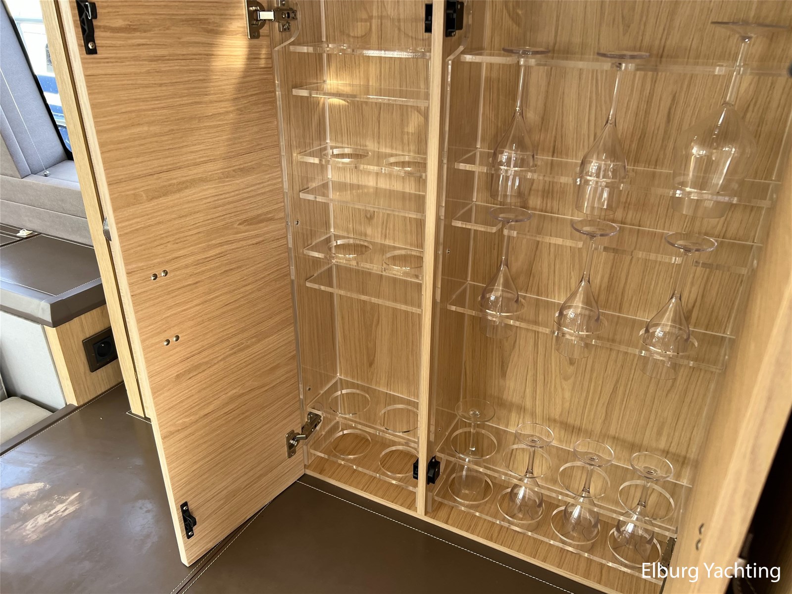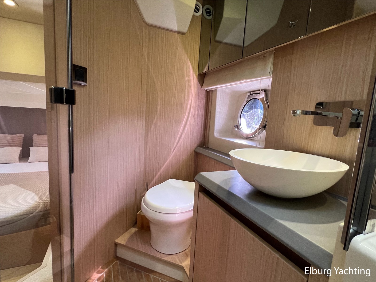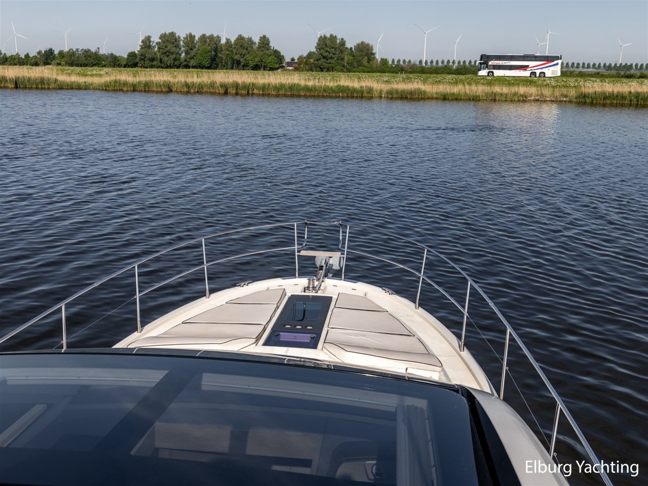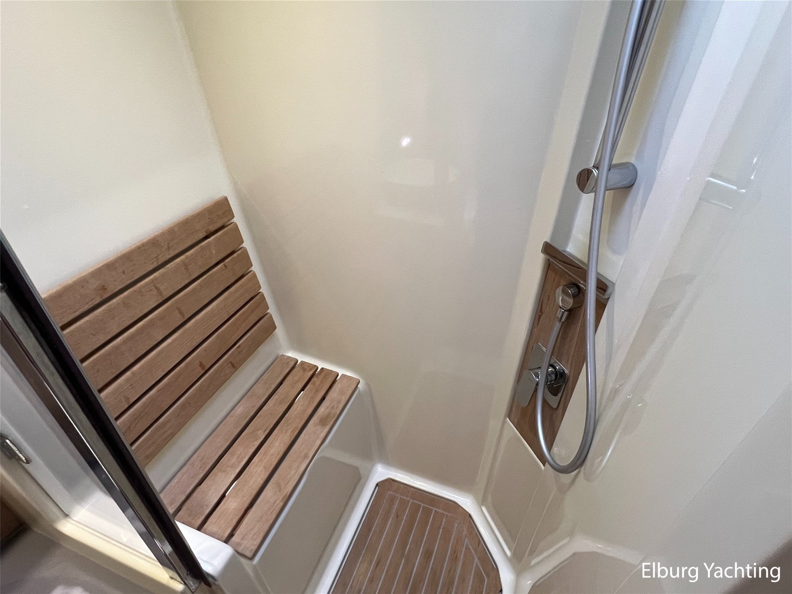 Zeer compleet uitgevoerde Monte Carlo 5S. De 5S-serie onderscheidt zich door stoere en sportieve looks en een hardtop met een buitenlounge op het dak. Vanaf het hydraulisch beweegbare zwemplateau wordt de open kuip betreden. De kuip heeft een geïntegreerde bank met bijbehorende kussens en vaste tafel. Aan SB zijde in de kuip bevindt zich de toegang tot de extra hut (crew cabin) in het achterschip, deze hut is tevens te gebruiken als extra opbergruimte. Via de open kuip stap je eenvoudig op naar het gangboord met goede houvast rondom voor een veilige loop over het dek. Op het voordek zijn twee geïntegreerde klapbare zonnebedden aanwezig. Via een geïntegreerde trap vanuit de kuip betreed je de buitenlounge op het dak. Deze buitenlounge heeft een in hoogte verstelbare tafel waarmee er ook een groot zonnebed gecreëerd kan worden. De salon en de kuip laten zich verbinden door drie grote glazen wegklapbare deuren. De kombuis is gesitueerd bij de ingang van de salon. Door het openen van de salondeuren wordt de kombuis volledig betrokken bij de kuip. De salon gecombineerd met de stuurstand bevindt zich op dekniveau. Via de de grote ramen rondom (getint) is er goed zicht en komt er veel licht binnen. Het buitengevoel naar binnen brengen kan door het openen van het grote elektrisch bedienbare schuifdak en twee zijruiten. Benedendeks bevinden zich drie hutten voor in totaal zes personen. De 2-persoons eigenaarshut bevindt zich midscheeps over de volledige breedte van het schip. Deze hut is voorzien van eigen sanitair en-suite. Aan stuurboordzijde bevindt zich een 1 x 2 persoons stapelbed en in de voorhut een 2-persoons Frans bed. Centraal is er een tweede badkamer met douche en toilet gesitueerd. Deze Monte Carlo 5S is verder voorzien van: achteruitkijk camera via plotterscherm, elektrisch bedienbare gangway, kuip afsluitbaar met deur naar zwemplateau, TV op lift in salon, Volvo ship/motormanagement display bij stuurstand, Fusion audiosysteem, trimtabs, Yachtcontroller afstandsbediening om te manoeuvreren middels de IPS aandrijving + boegschroef. Voor vragen en/of het maken van een afspraak bent u 7 dagen per week van harte welkom bij Elburg Yachting.