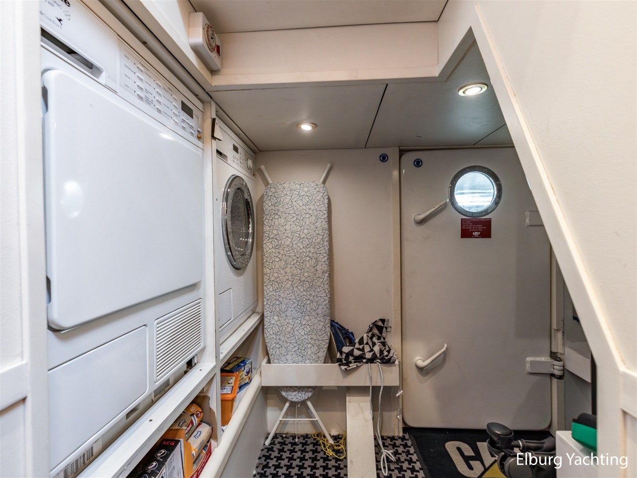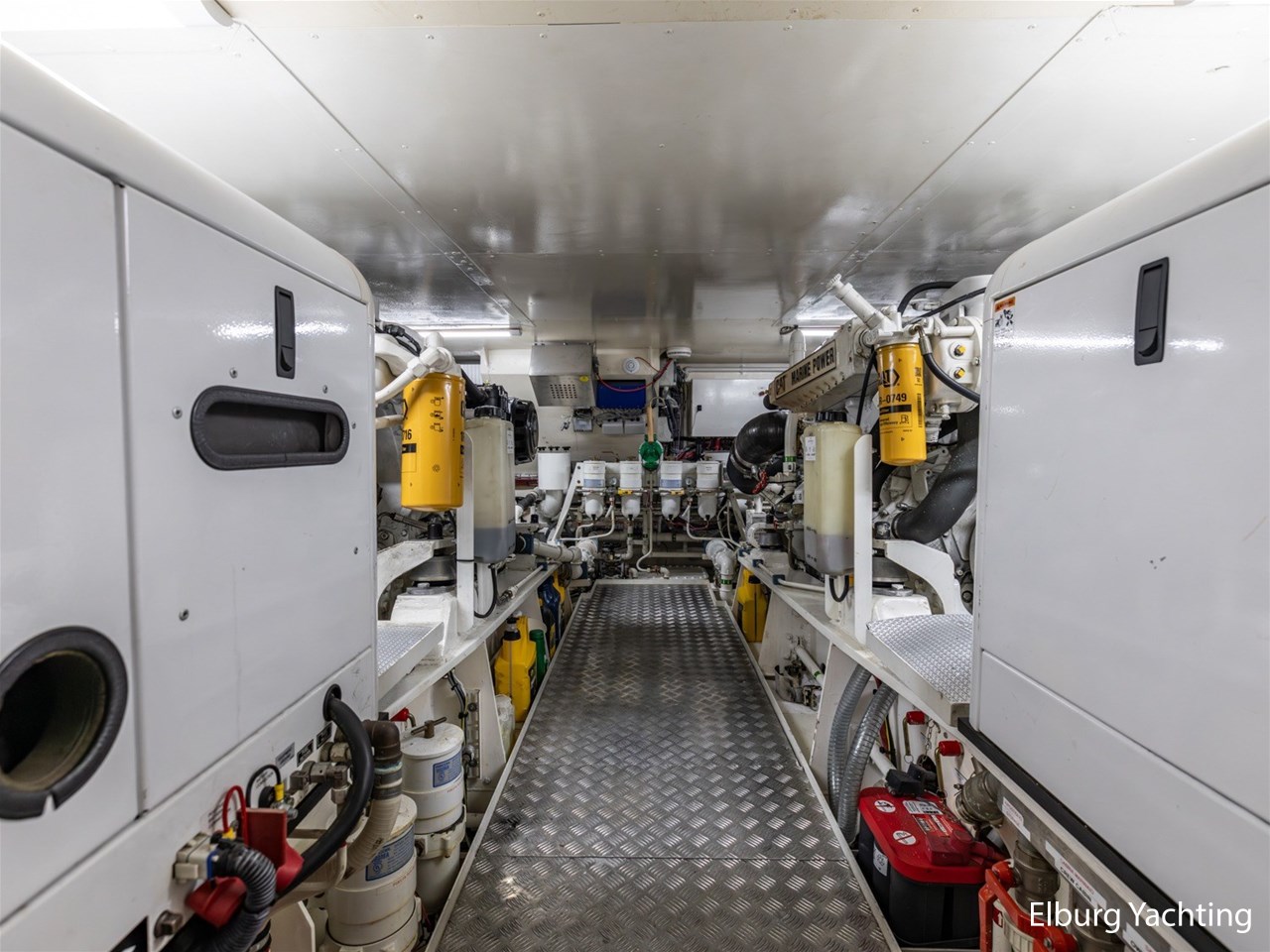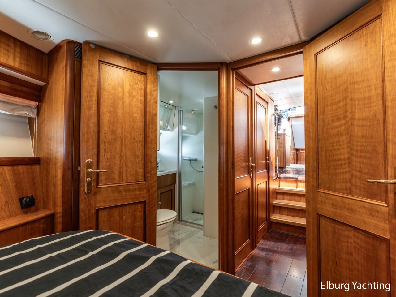 Het jacht beschikt over 3 luxe hutten en een crew cabin. Het interieur in kersenhout en wengé vloer, in combinatie met moderne technologie: Raymarine Axiom-systeem, Naiad stabilisatie, hydraulische transomdeur, passerelle, airconditioning en generatorsets. De brandstoftanks van ca. 7.200 L en vers watercapaciteit van ca. 2.500L garanderen lange zeereizen met comfort.