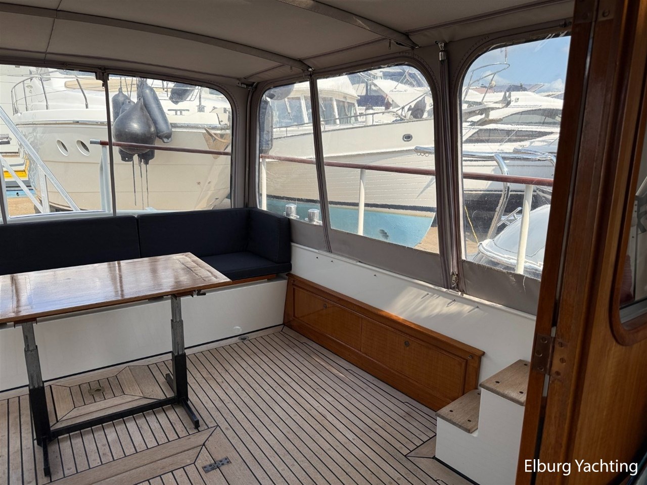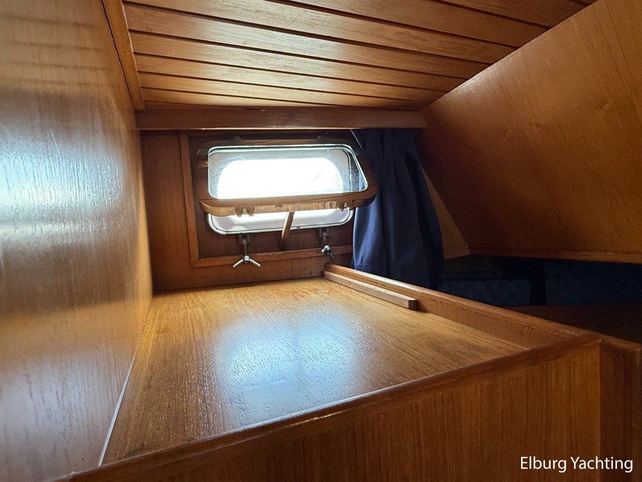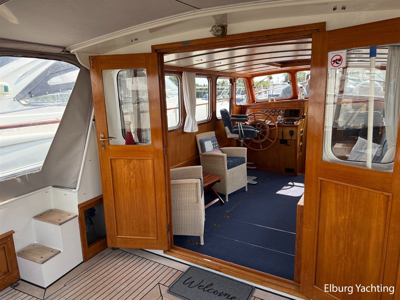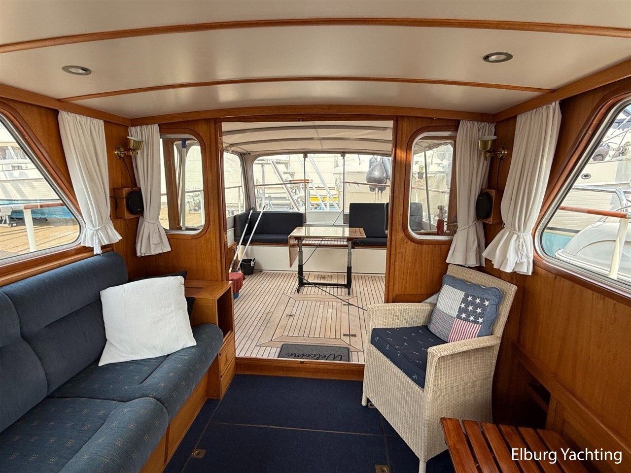 - Scheeps Teakhouten interieur met blauwe bekleding en recente blauwe vloerbedekking
