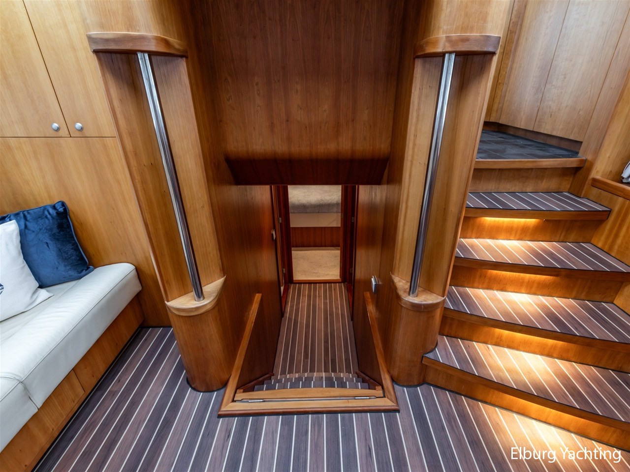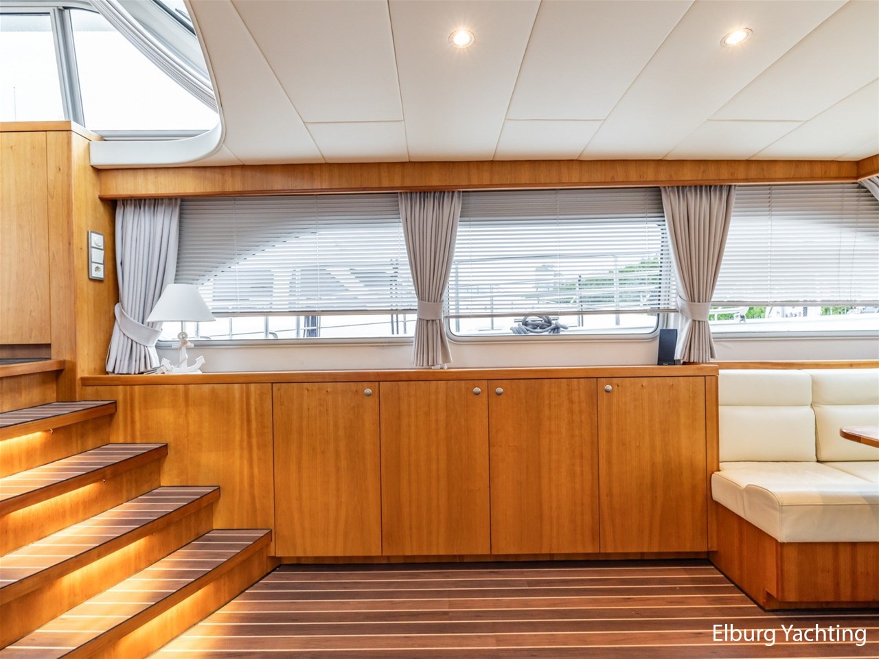 Scheepshouten interieur met witte kunstlederen bekleding