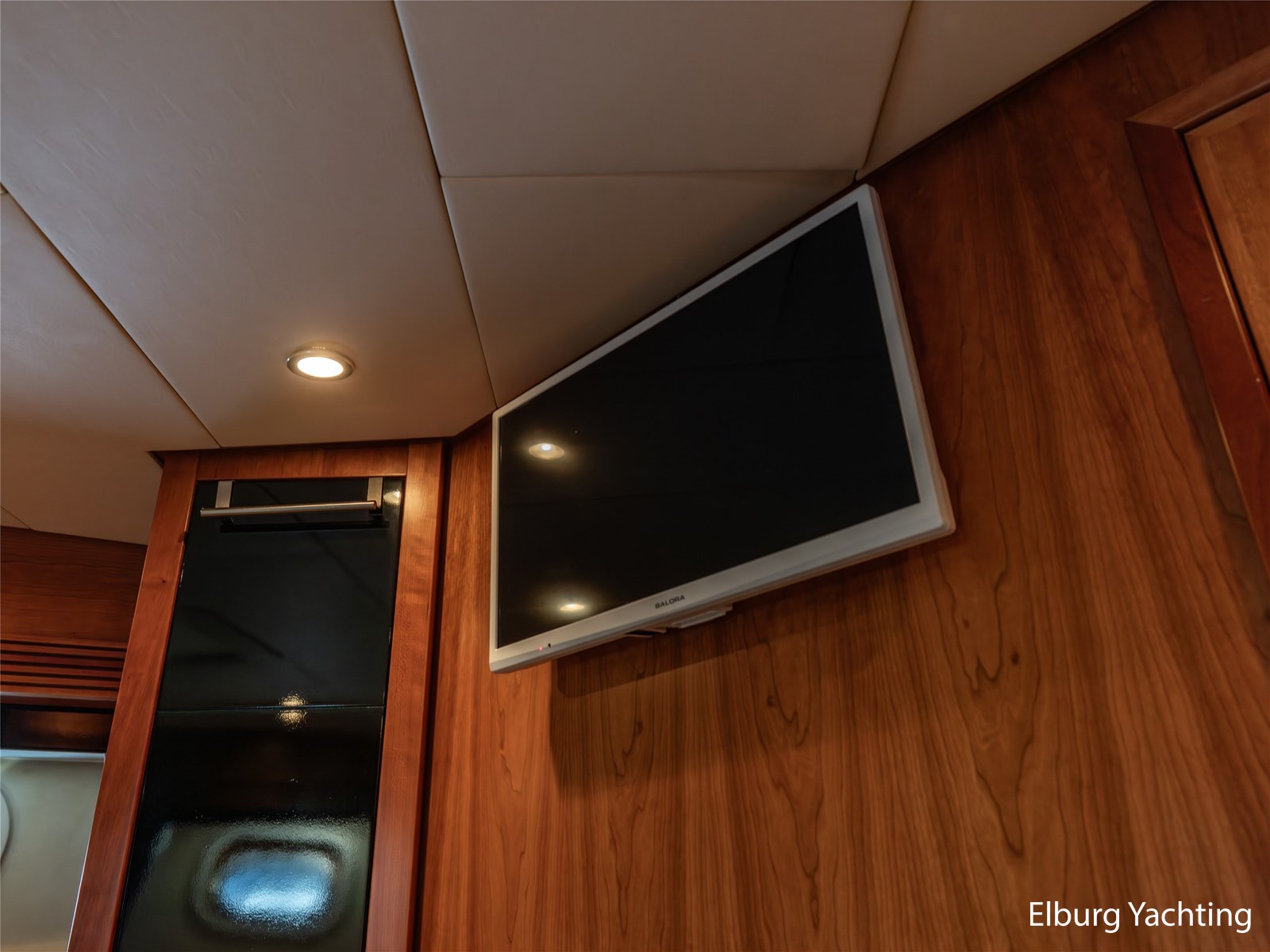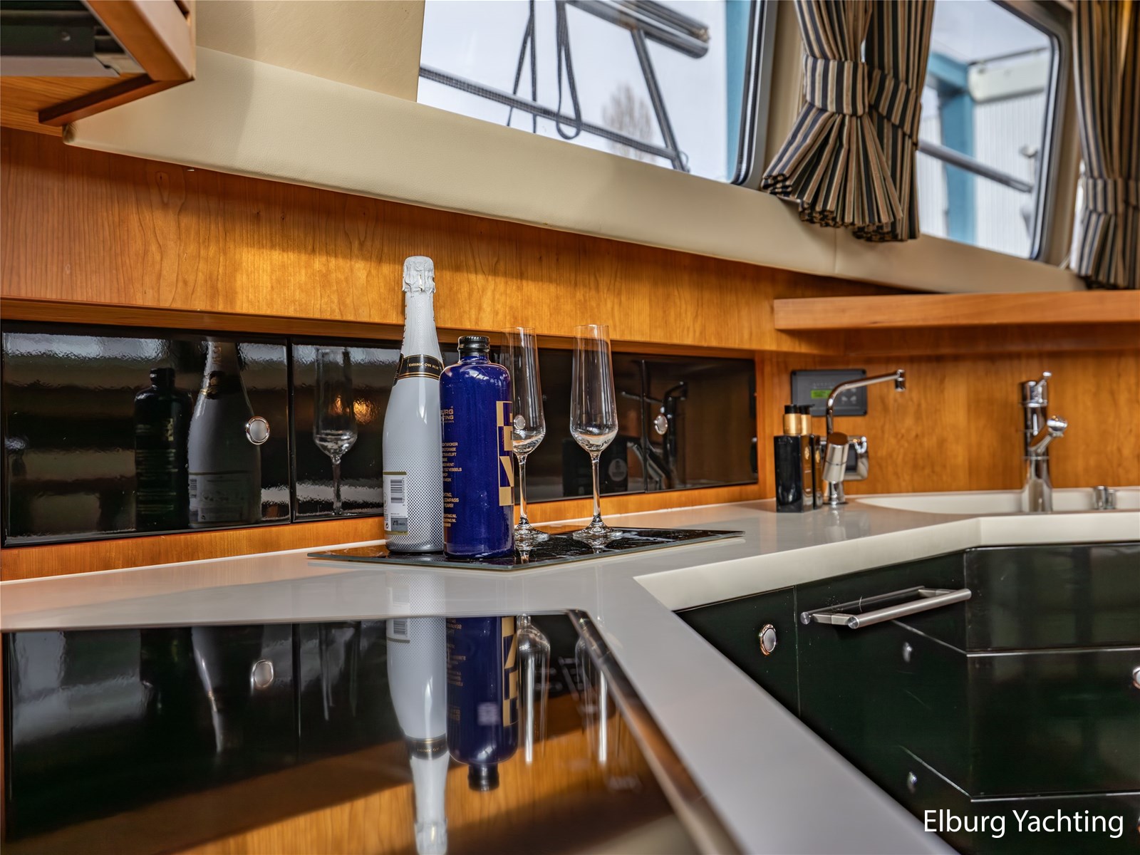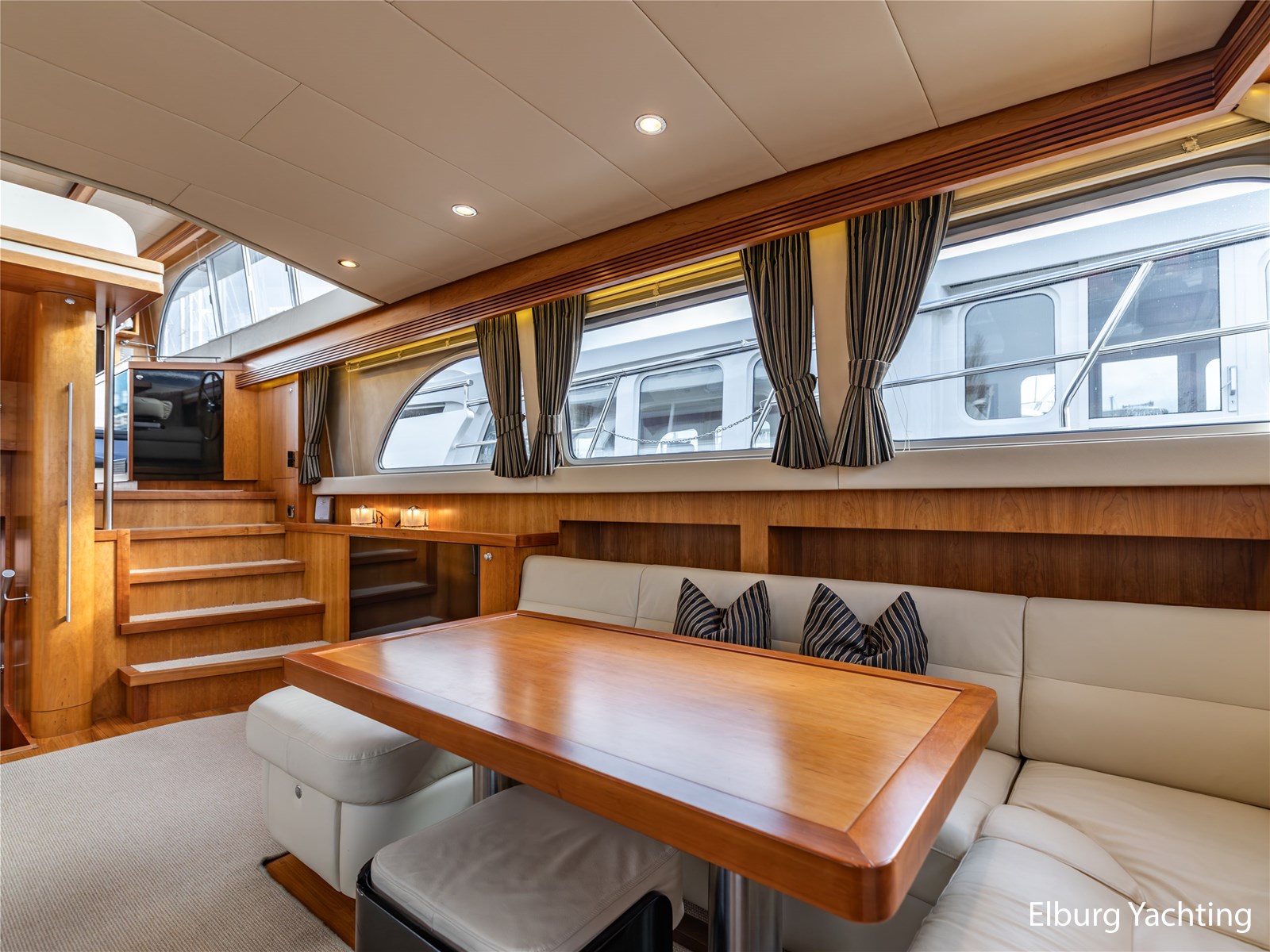 Vanuit de stuurhut loopt u via een niveauverschil naar de ruime salon, uitgevoerd in teak met crème-witte lederen bekleding en royale lichtinval dankzij de grote ramen. De salon is sfeervol verlicht met ingebouwde LED-verlichting en uitgerust met een flatscreen-tv, zodat ontspanning aan boord gegarandeerd is. Aansluitend bevindt zich, een niveau lager, de volledig uitgeruste kombuis. Deze keuken is voorzien van een Corian werkblad, keramische kookplaat, afzuigkap, Bosch oven, combimagnetron en dubbele koelkast. Alles is aanwezig om aan boord volwaardig te kunnen koken en leven.