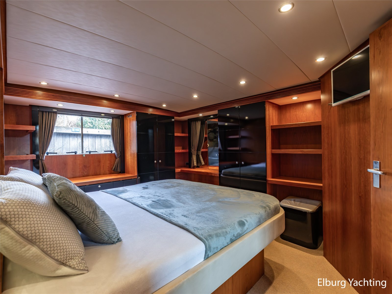 De eigenaarshut achterin is bijzonder royaal en beslaat de volle breedte van het jacht. Deze luxe 'full beam' master cabin beschikt over een vrijstaand tweepersoonsbed, een badkamer en suite, ruime kastopstelling en een sfeervolle afwerking.
